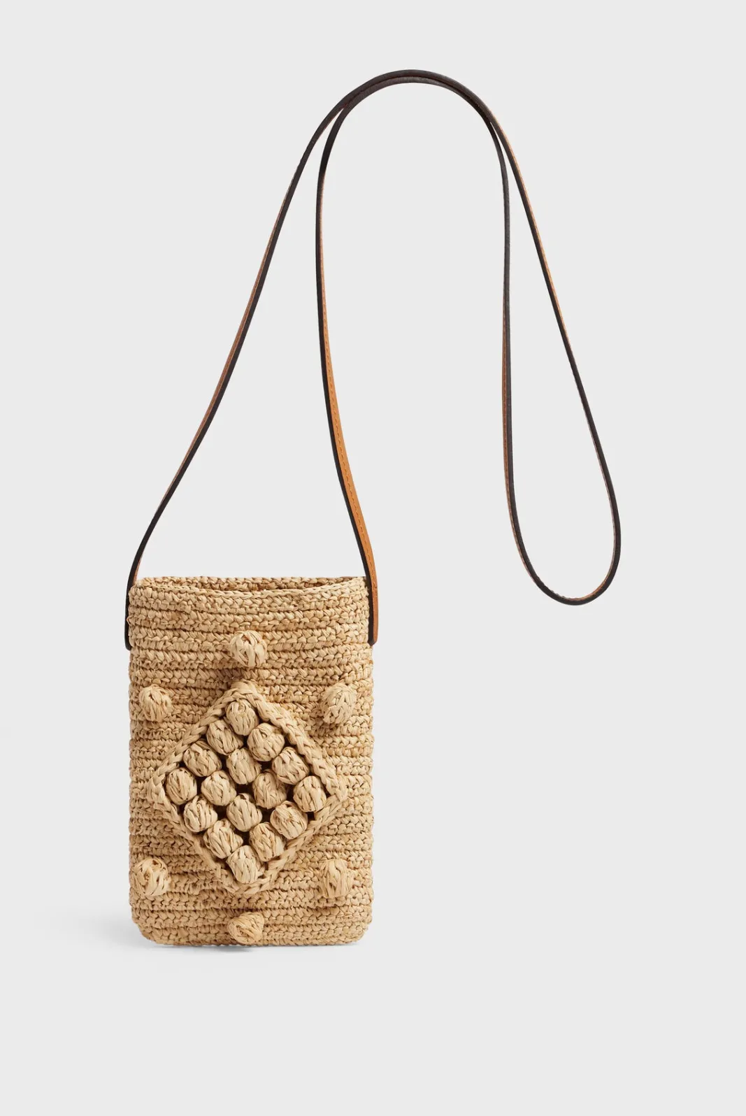 The ROSIE is an authentic hand-crochetednatural raffia phoneholder.Geometric graphics, worked in relief.