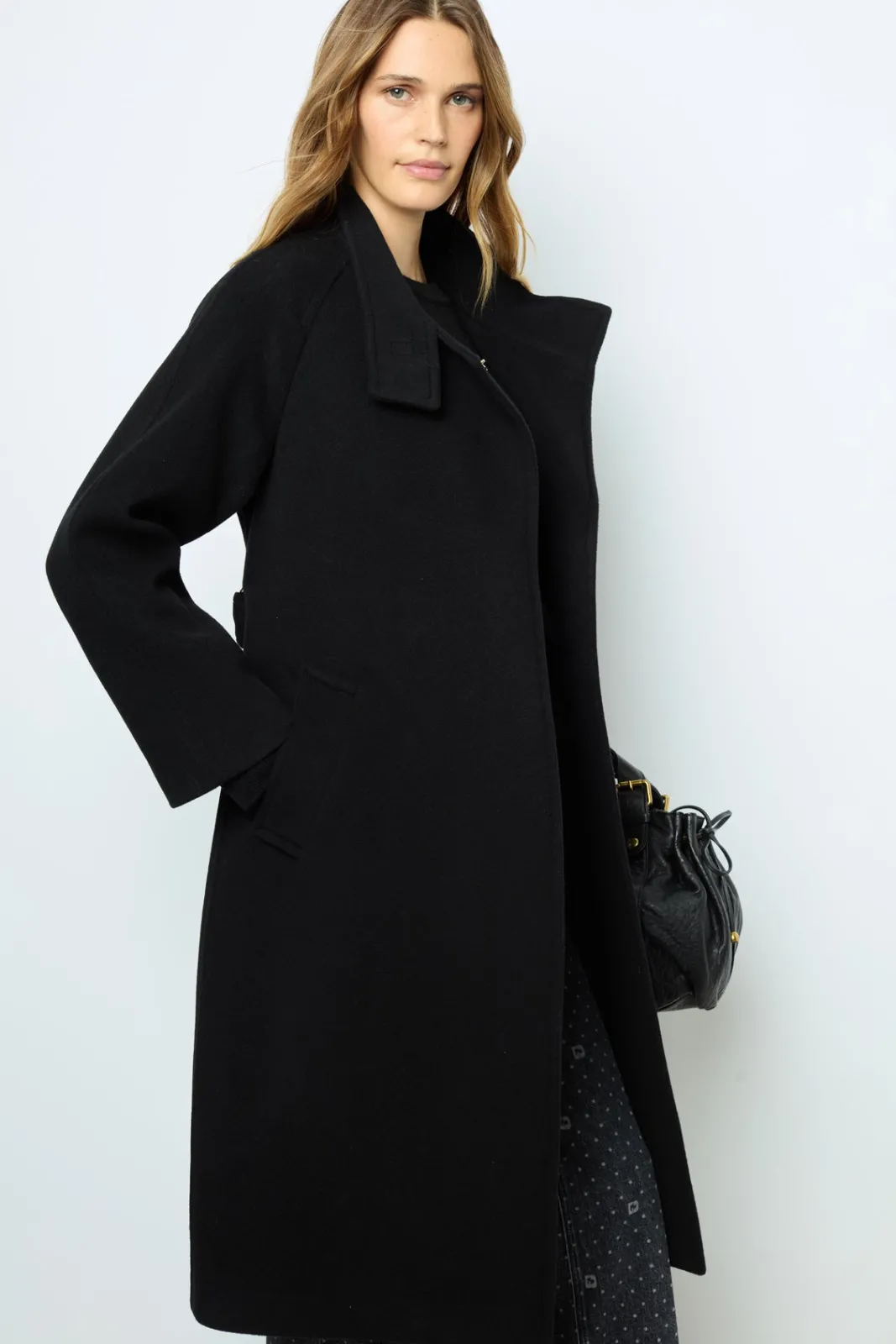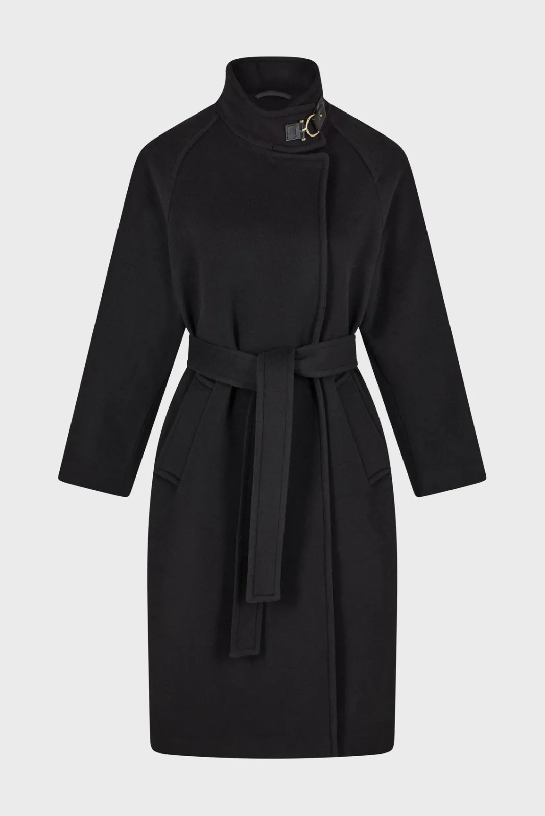 Long waisted coat with stand up collar for a sophisticated silhouette. Leather strap with gold buckle on collar. Wool and cashmere blend for mid-winter.