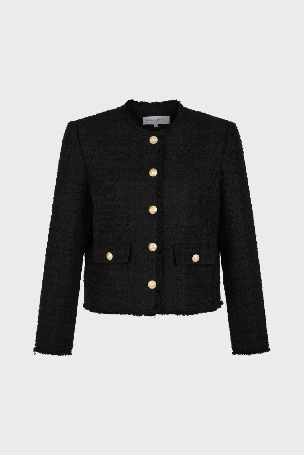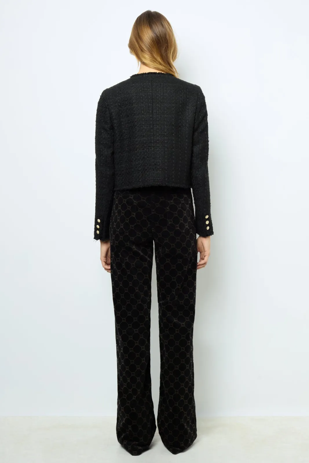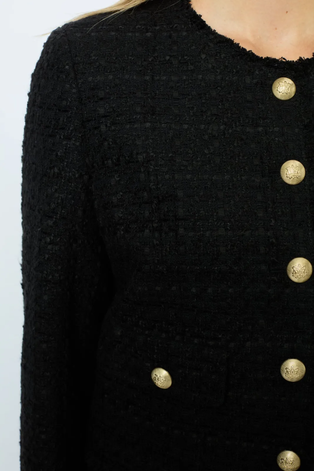 Collarless black tweed jacket with engraved buttons. Wear as a suit with the matching pants or mix and match with jeans.