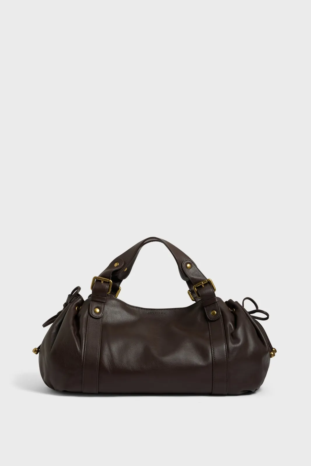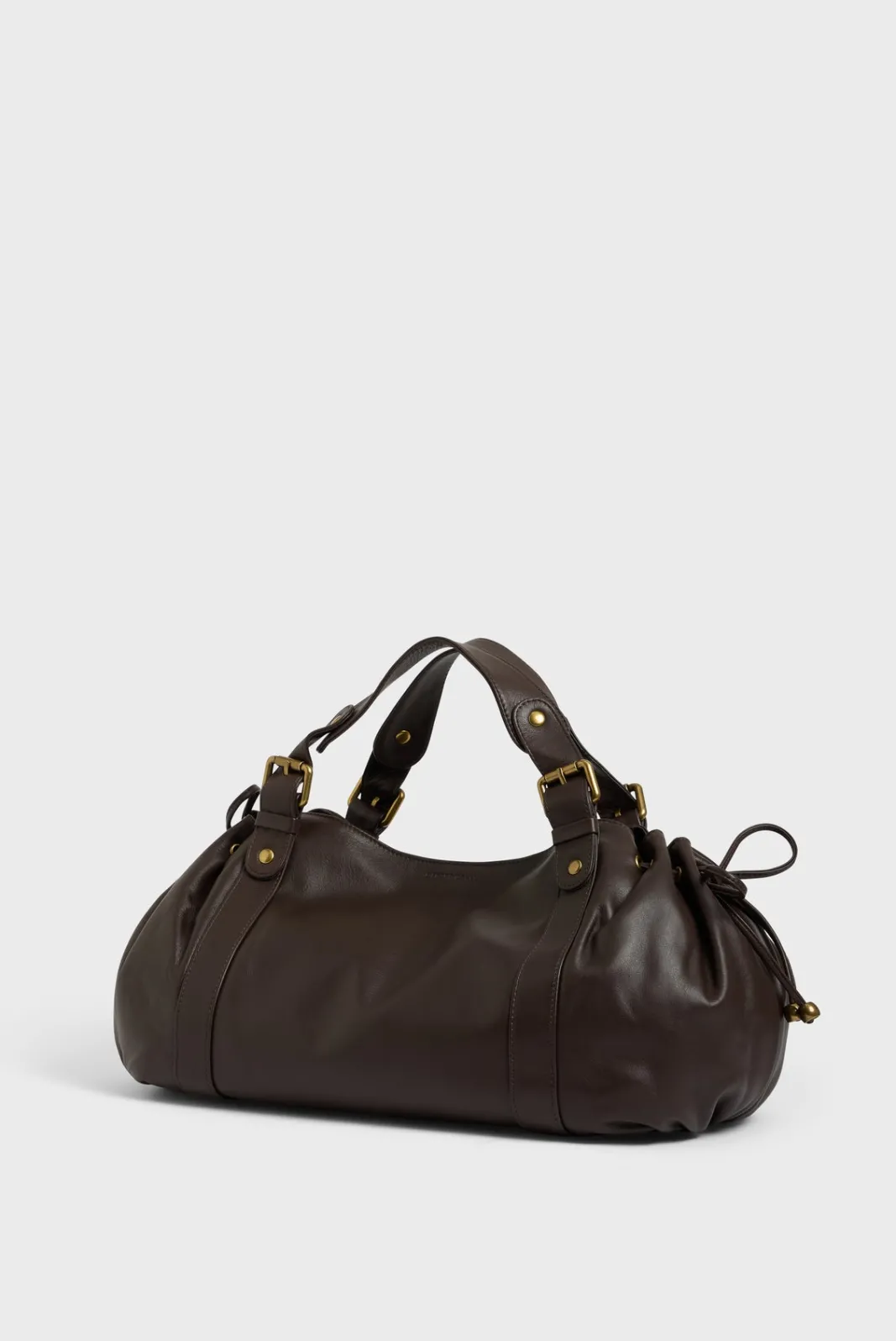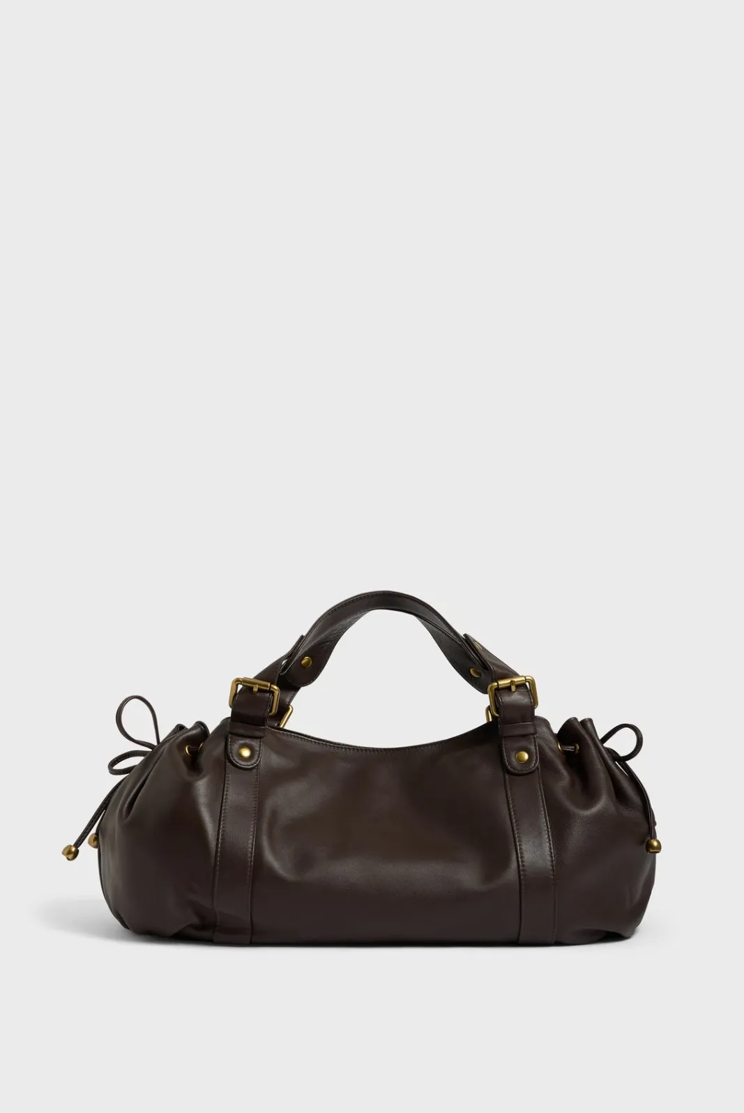 - – Bag gathered on the sides by two leather links, wrapped in body bands