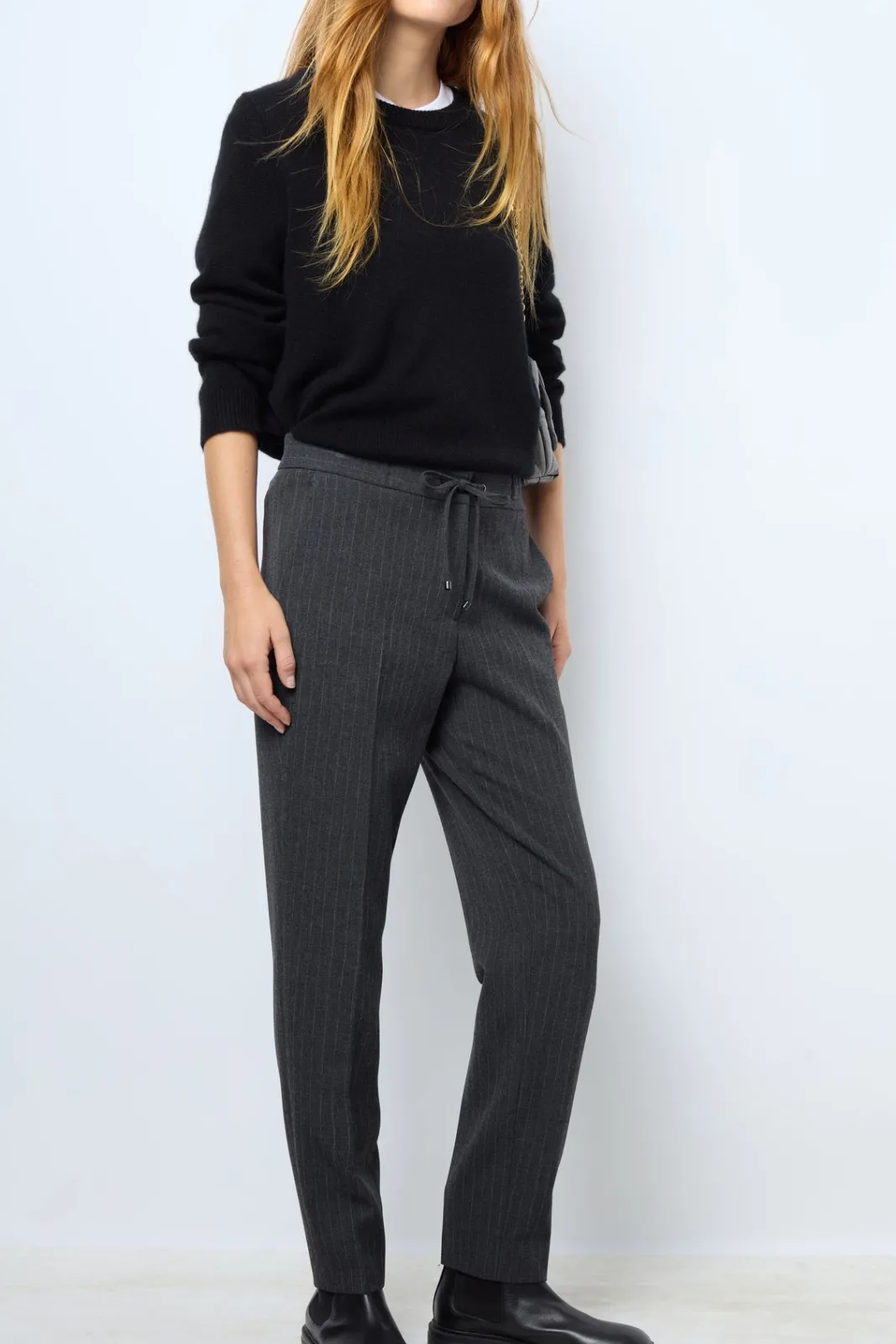 Straight cut pants with fine stripes. Elasticated waist for added comfort.