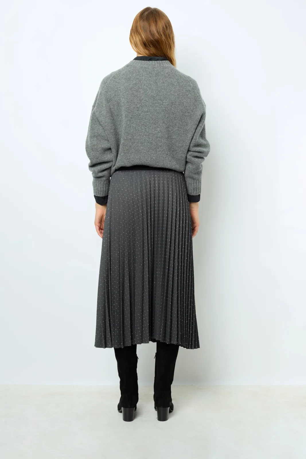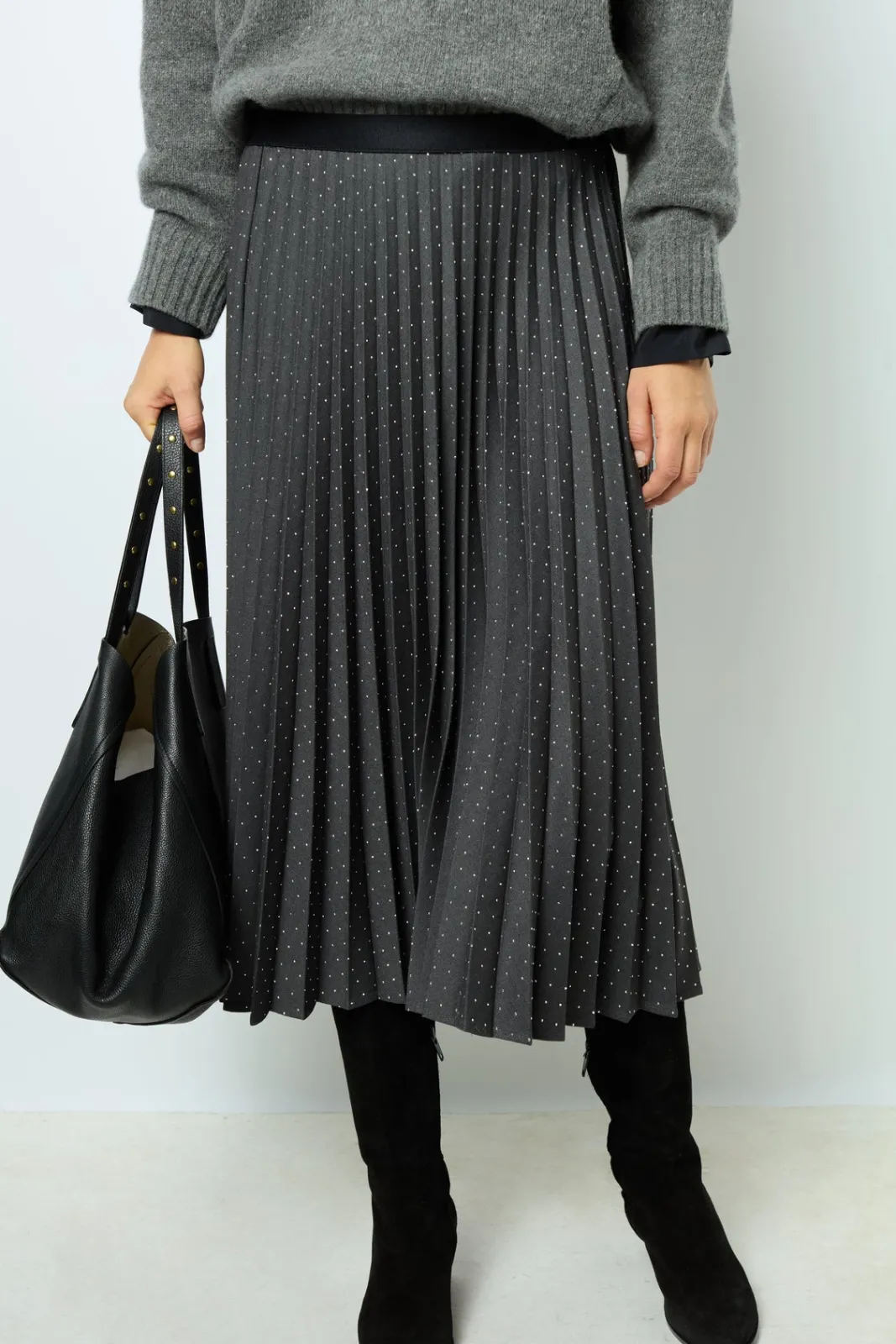 Pleated skirt with rhinestone for a new look at a classic style.-Pleated-Plain fabric-Midi-Elasticated waist-The model i…