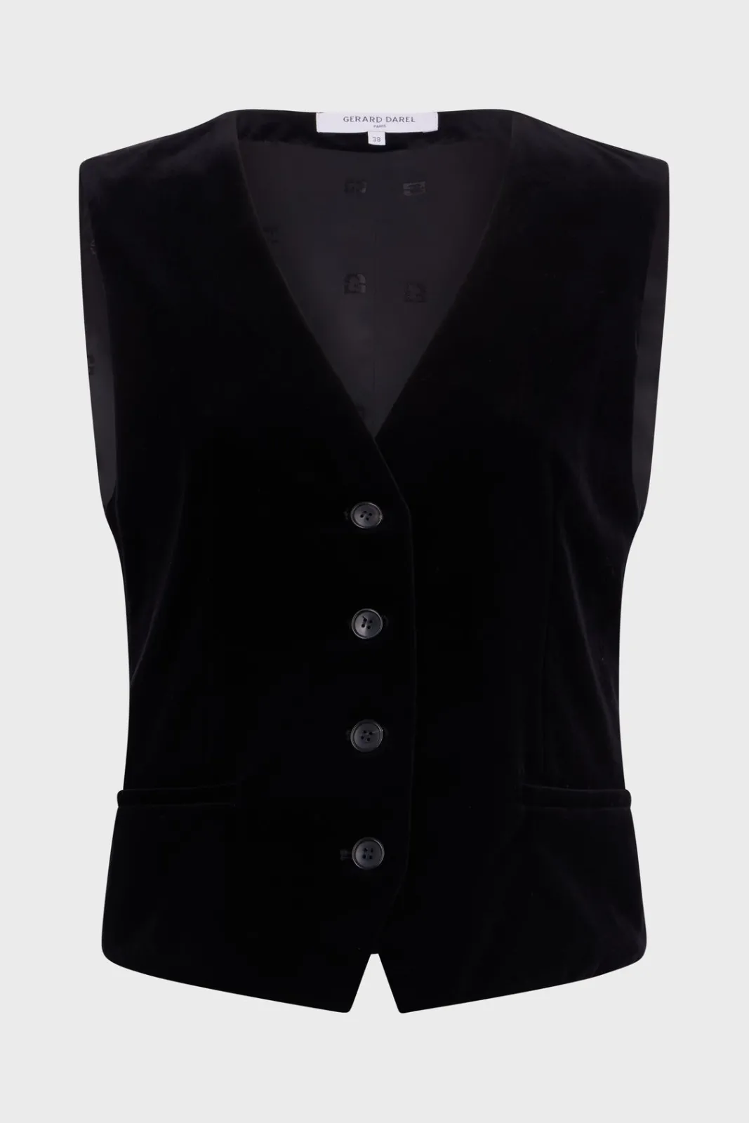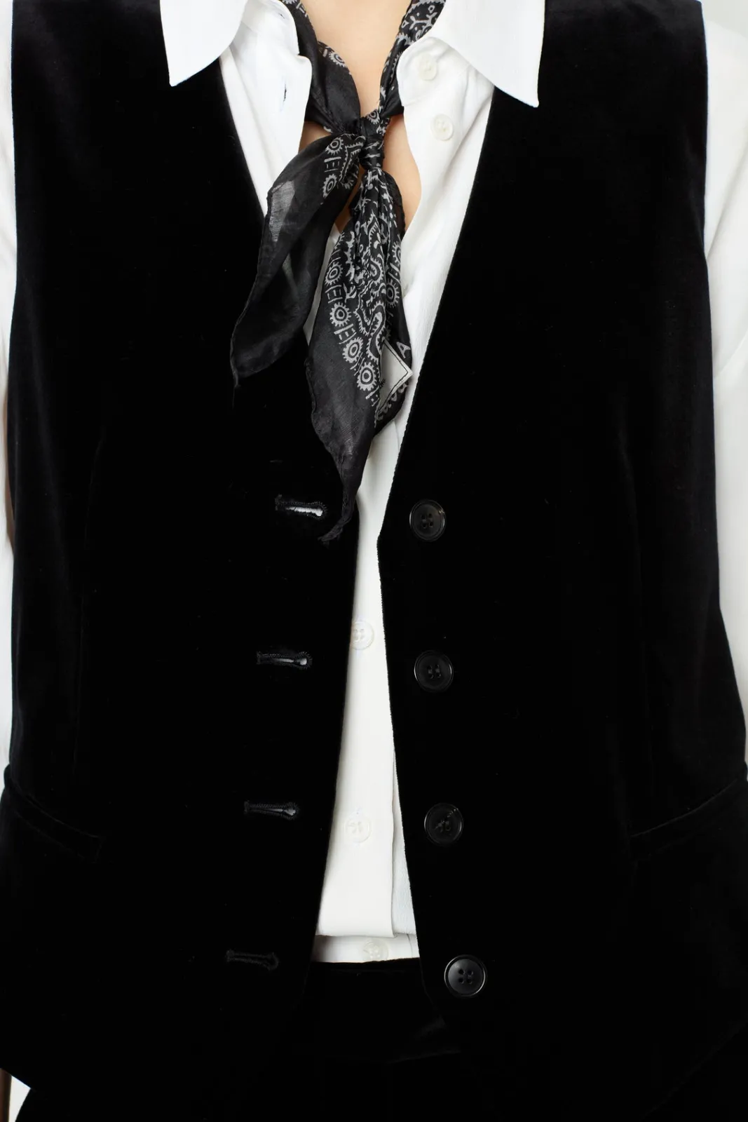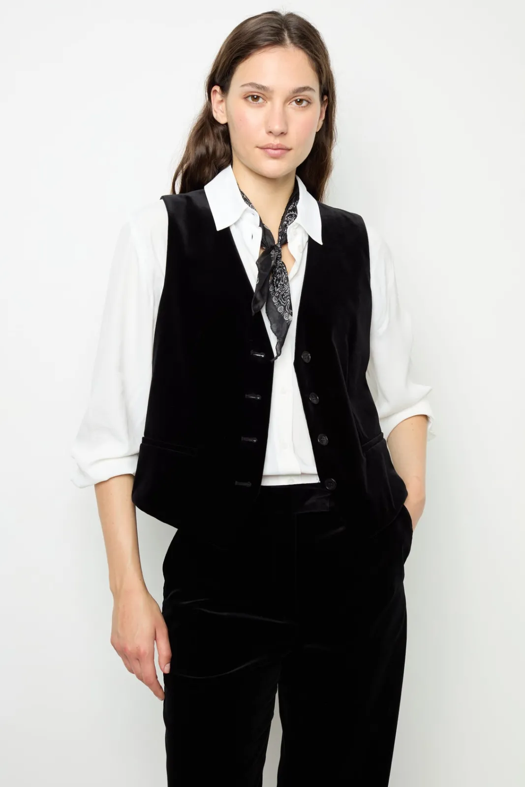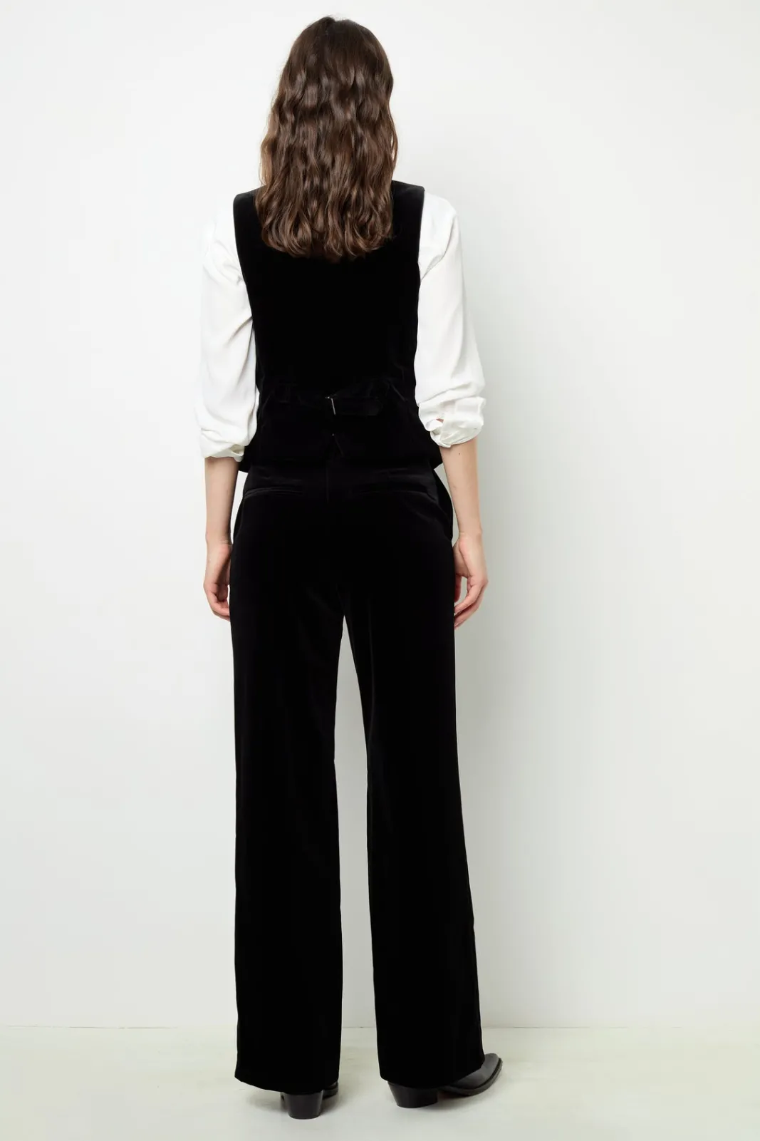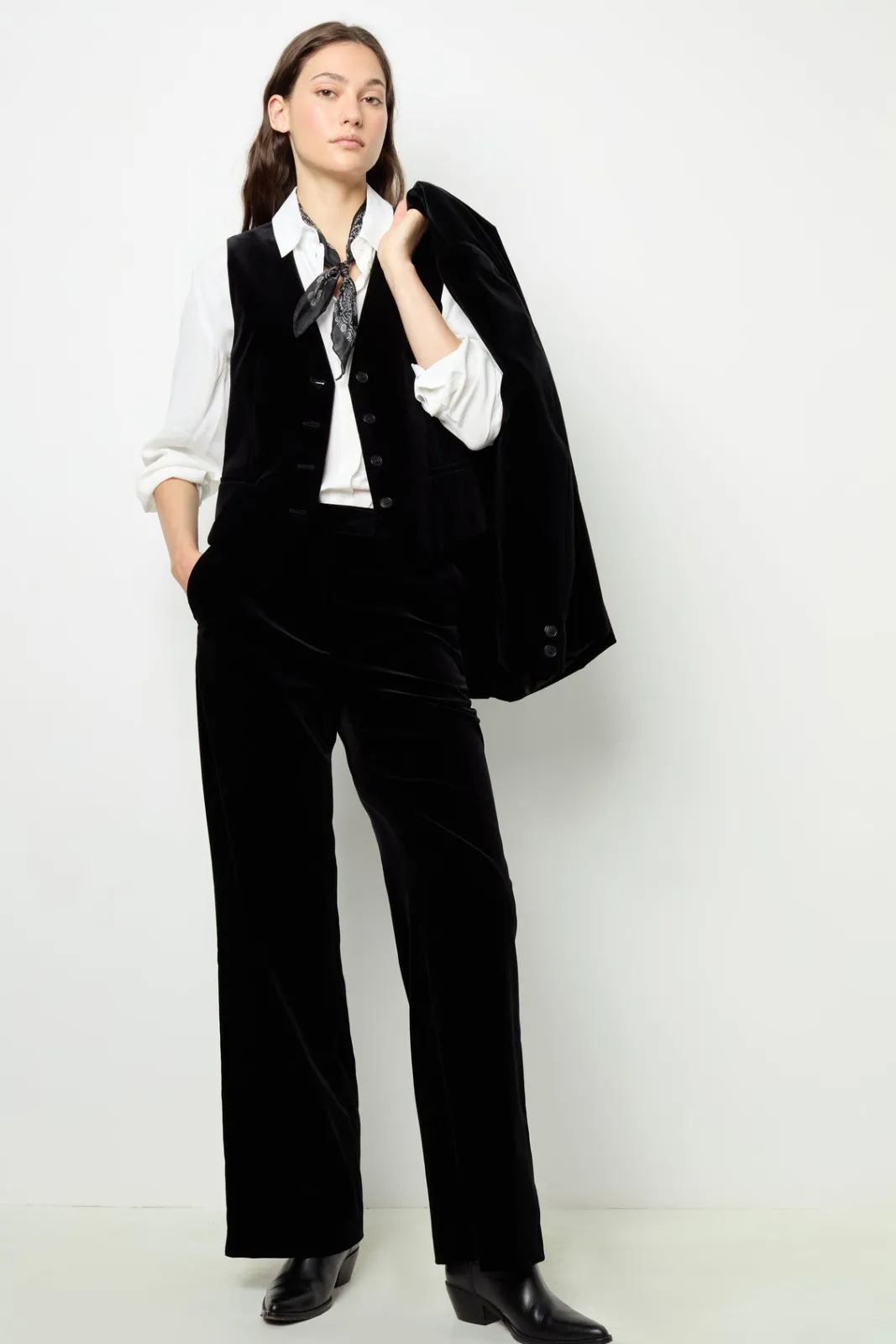 Velvet sleeveless jacket. Create a suit with the matching jacket and pants for an ultra-chic look.