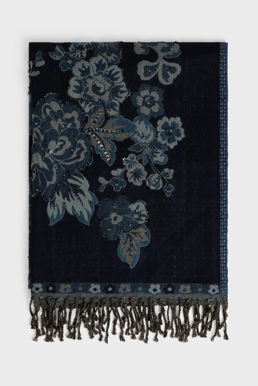 Jacquard scarf with flower print and embroidered sequins. 100% wool.70x180cm-Rectangular-Floral pattern-Fringe details
