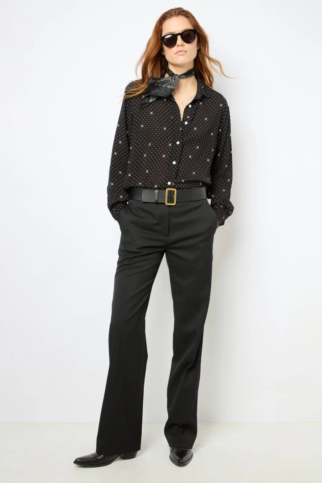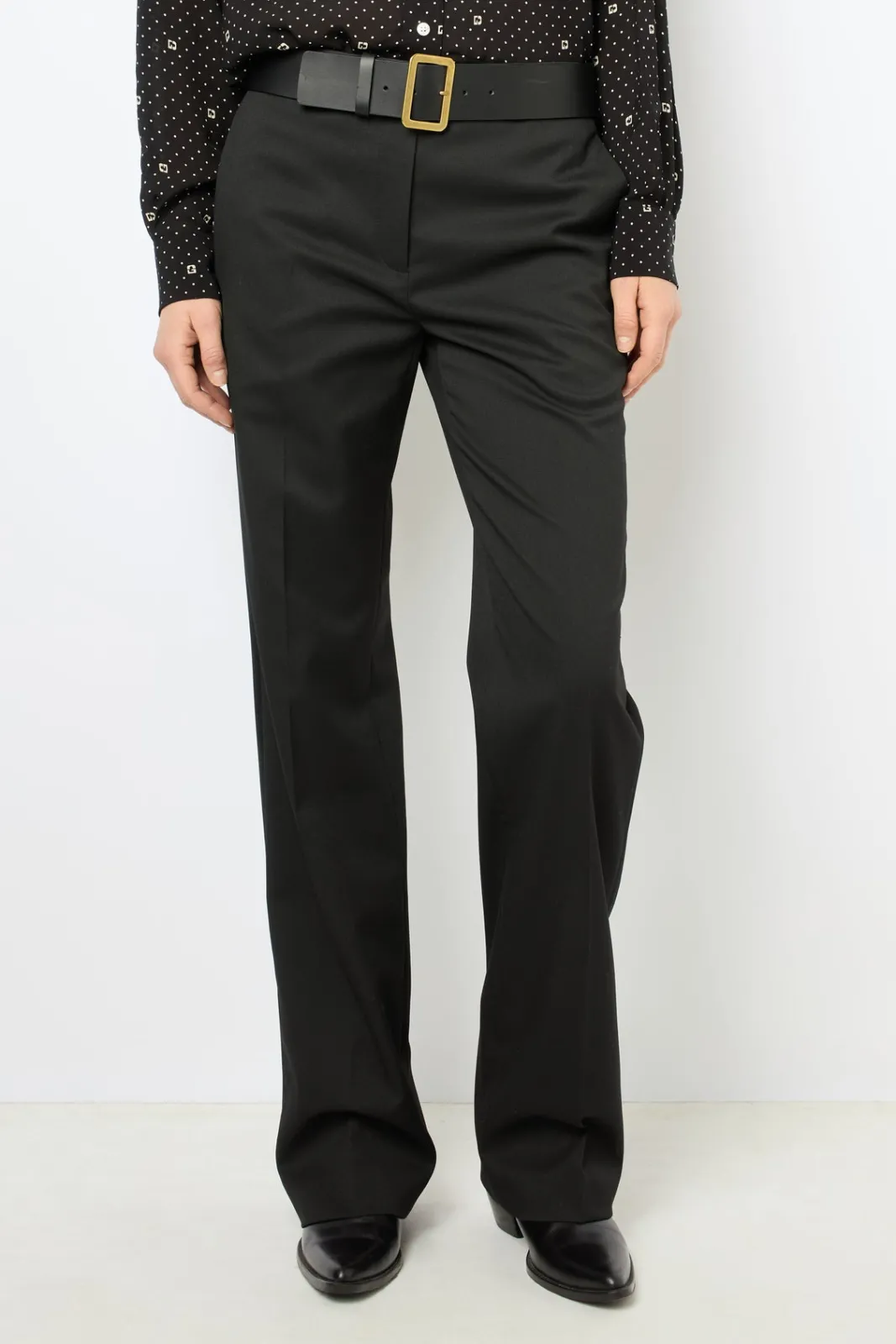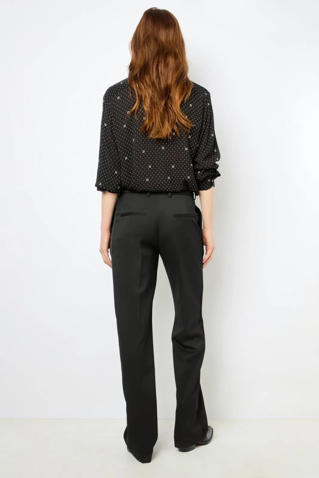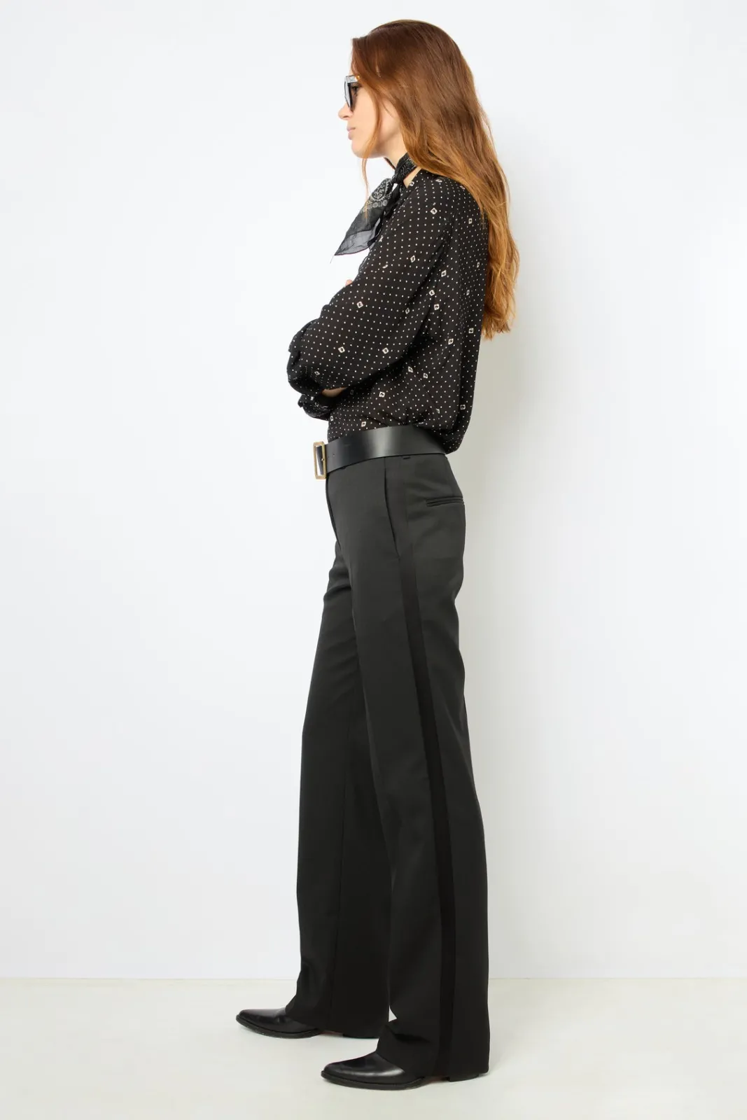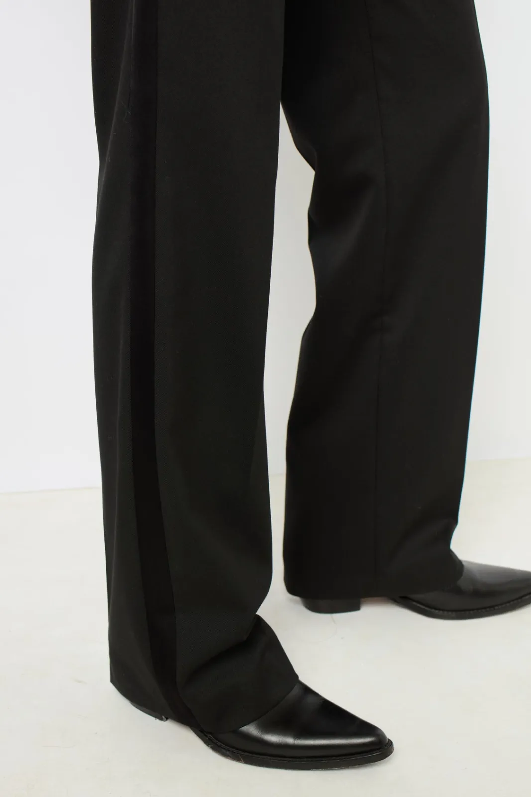 Black tuxedo pants with satin stripe at the side. Wear withthe matching jacket for an ultra-chic silhouette.