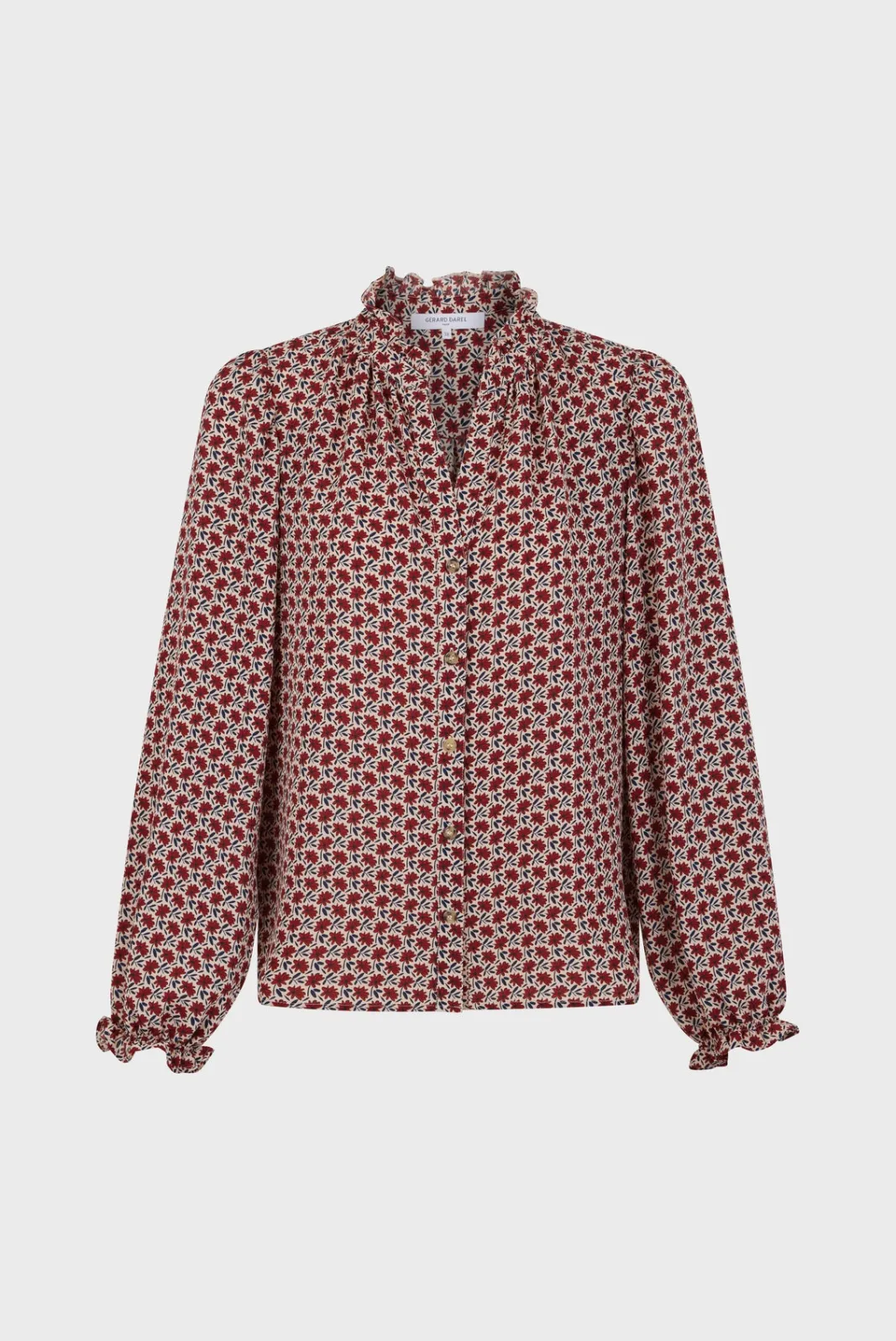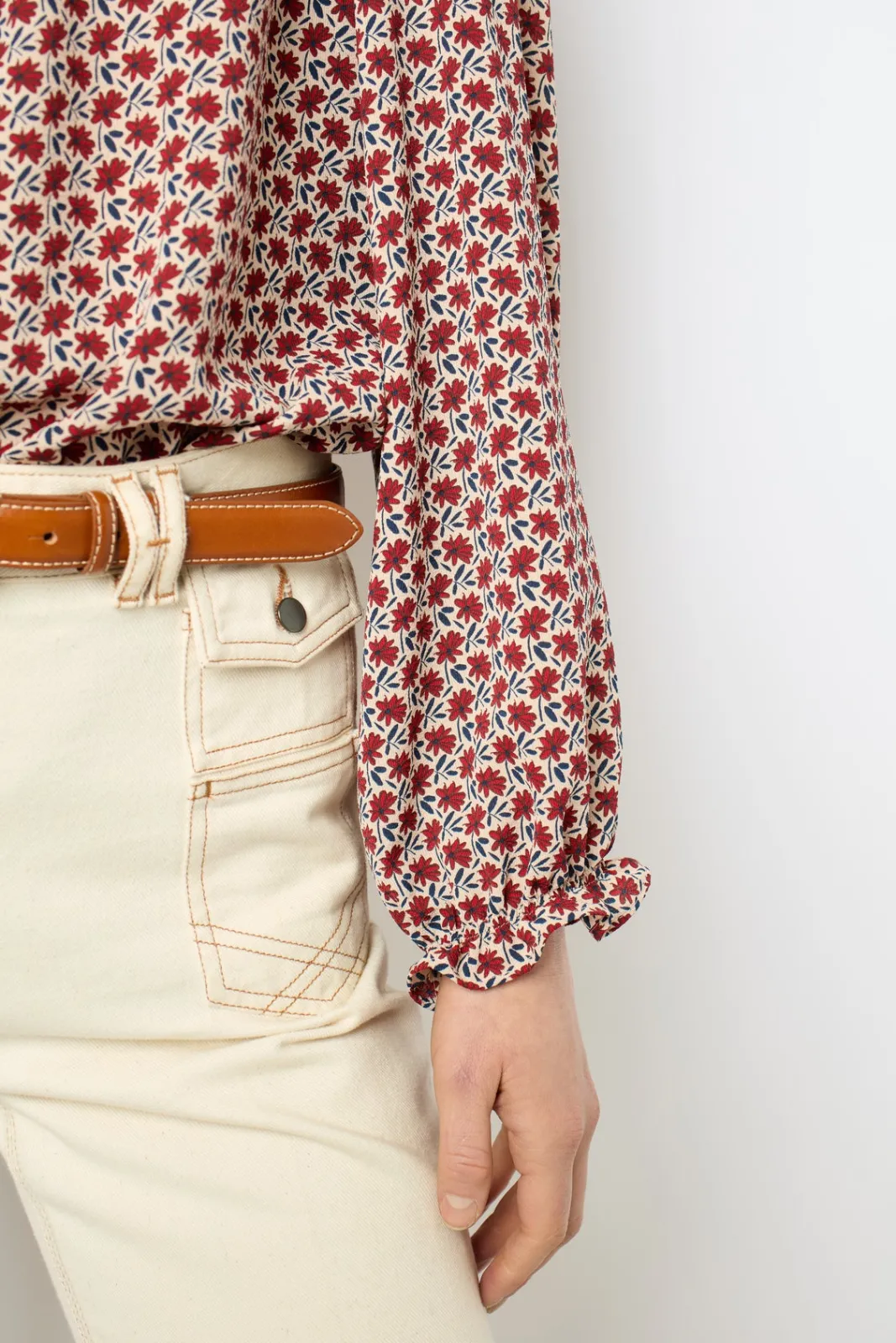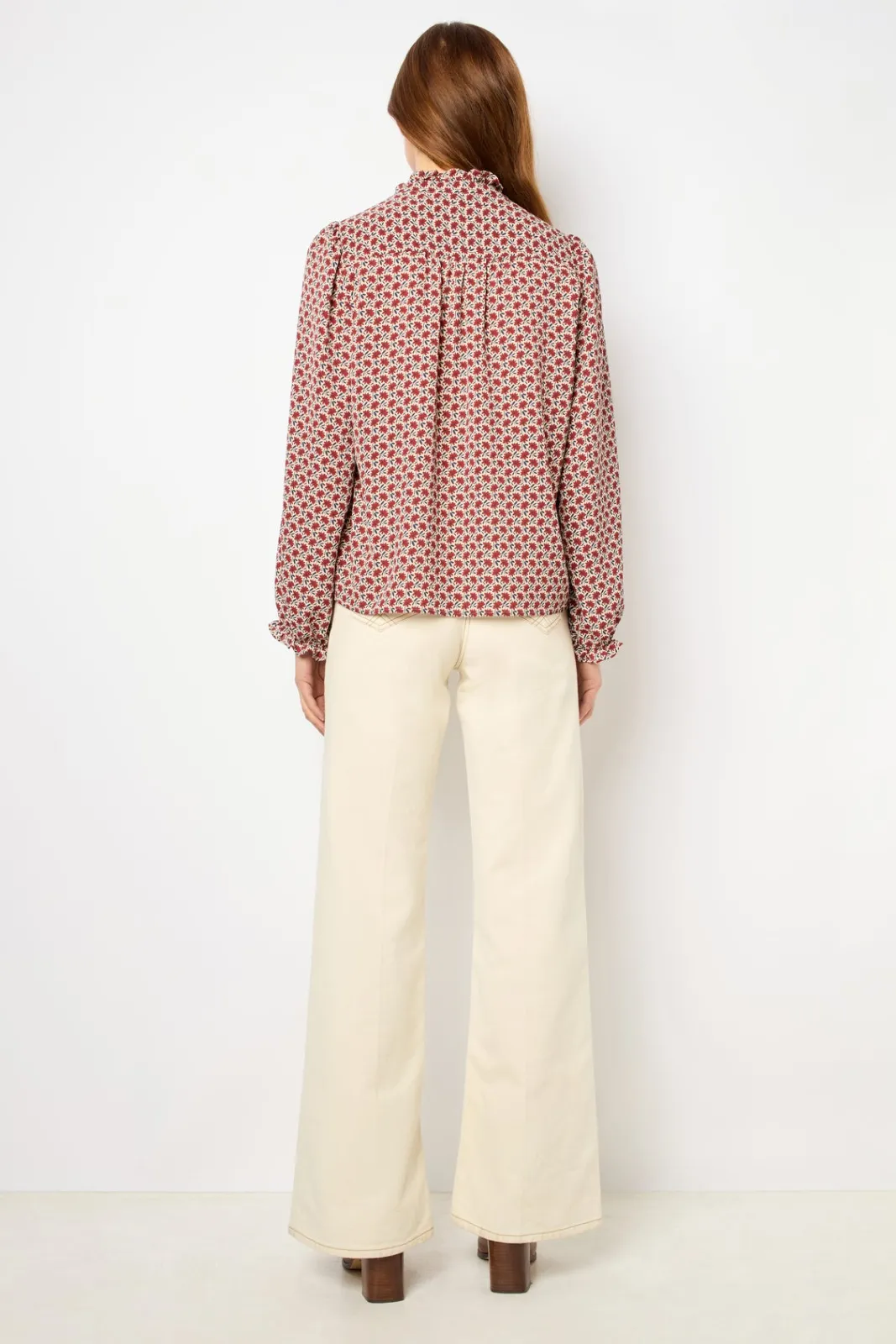 Shirt with a two-tone daisy print. Stand up collarwith ruffles for a romantic chic spirit.