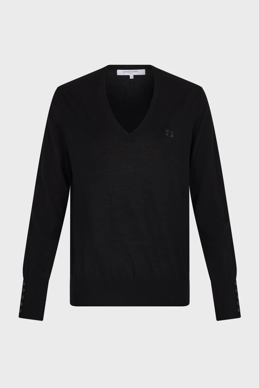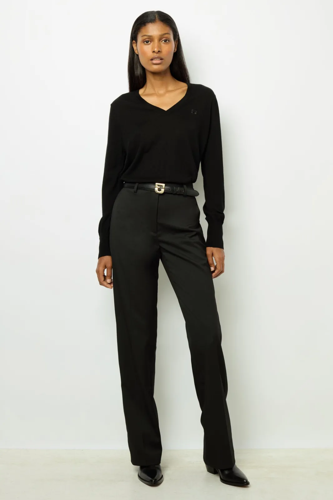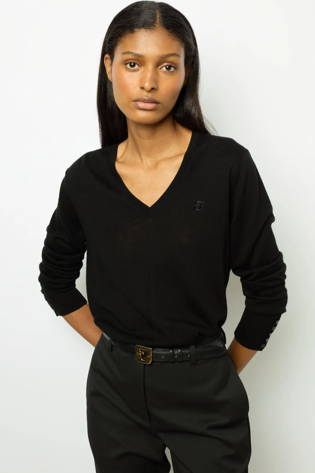 100% merino wool V-neck sweater for a chic but casual style. Wear on bare skin.