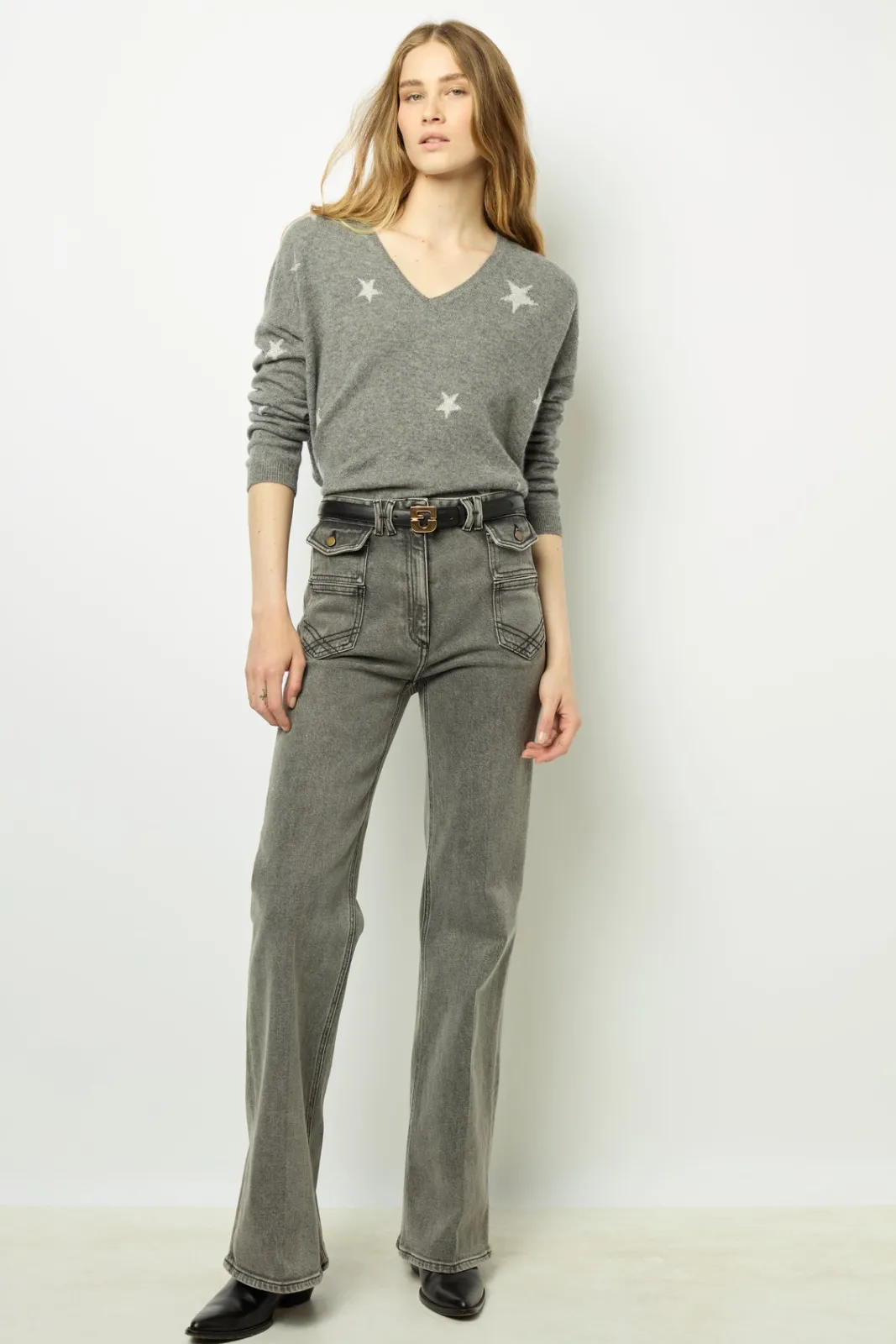 Fancy chic, 100% cashmere V-neck sweaterwith lurex stars.