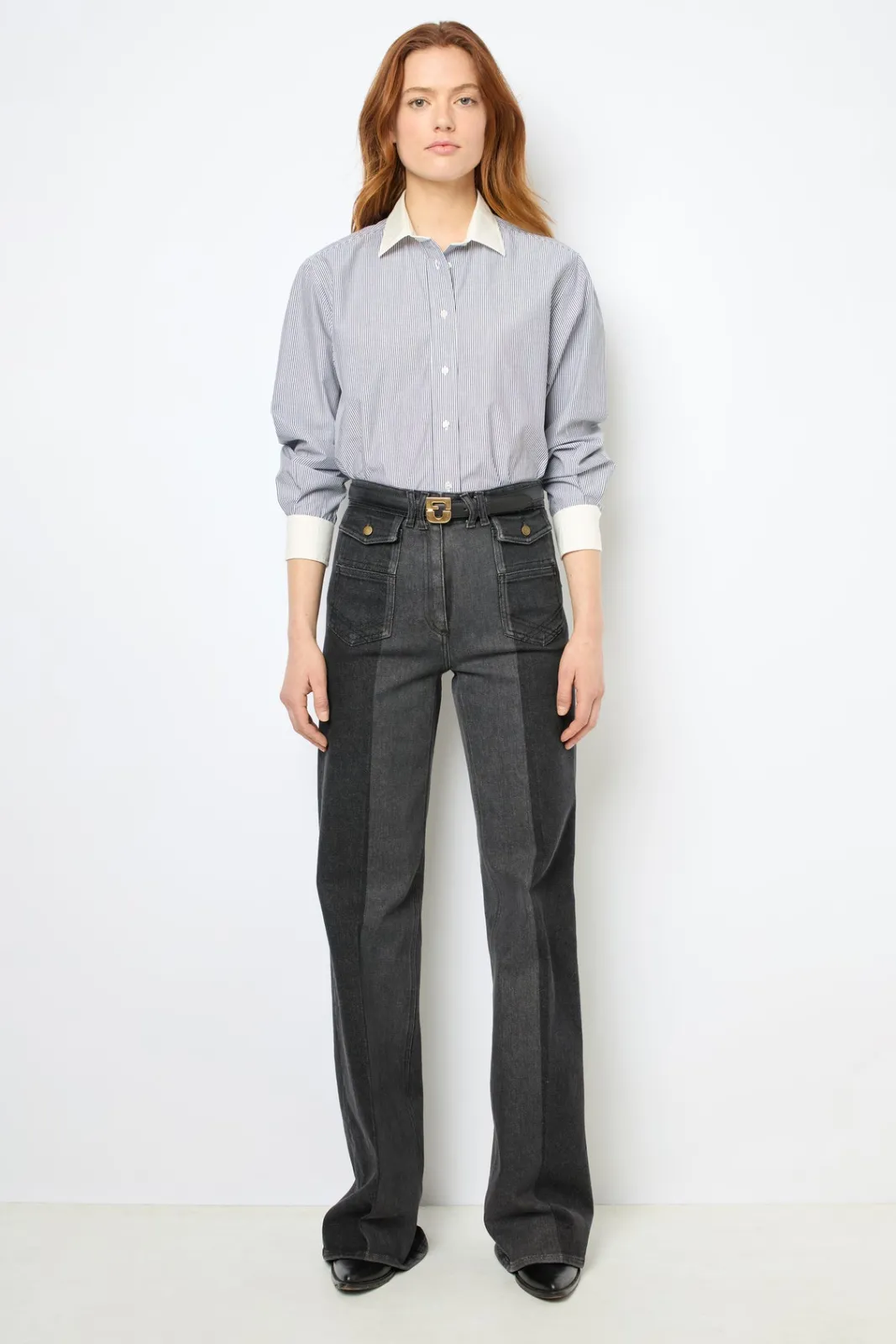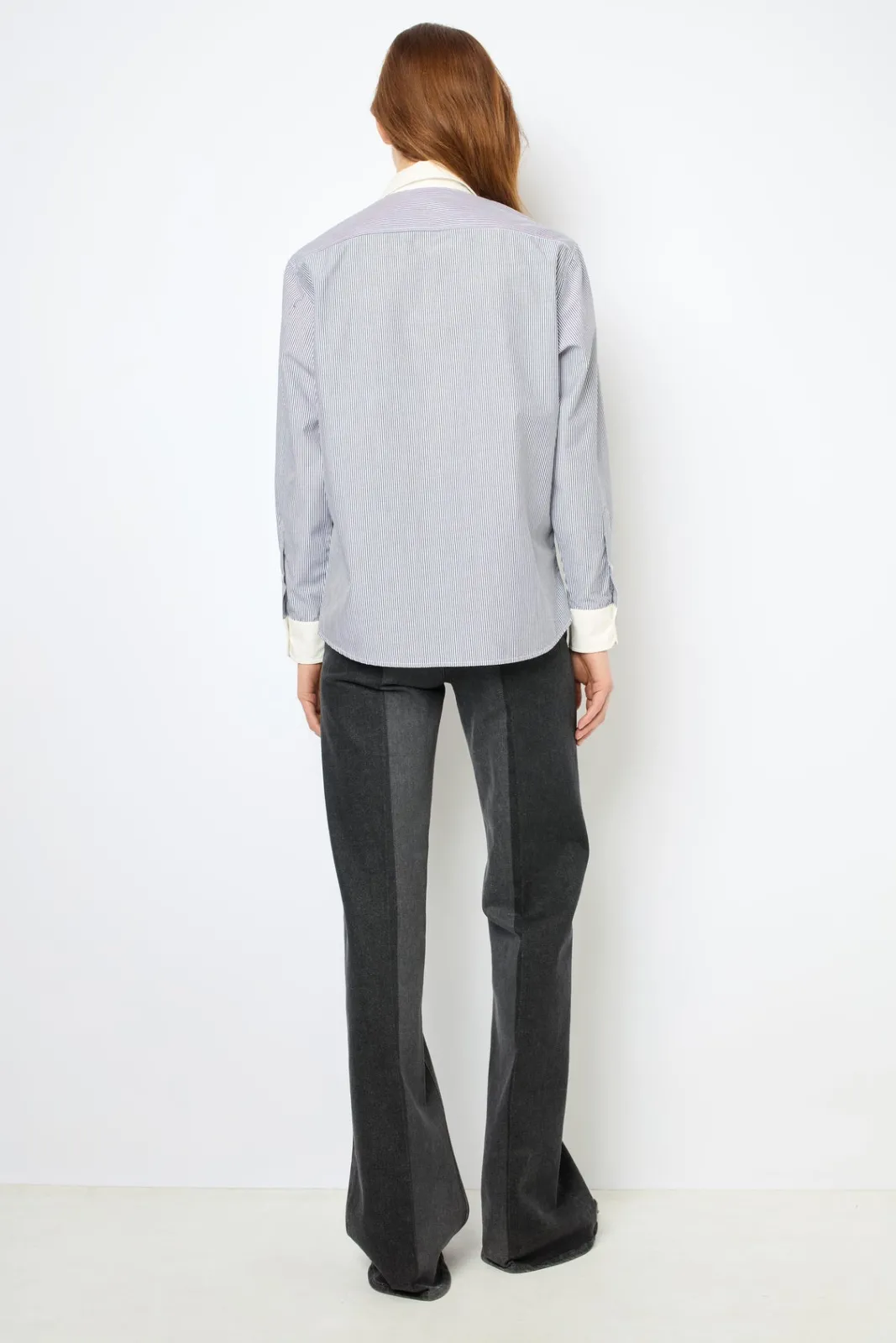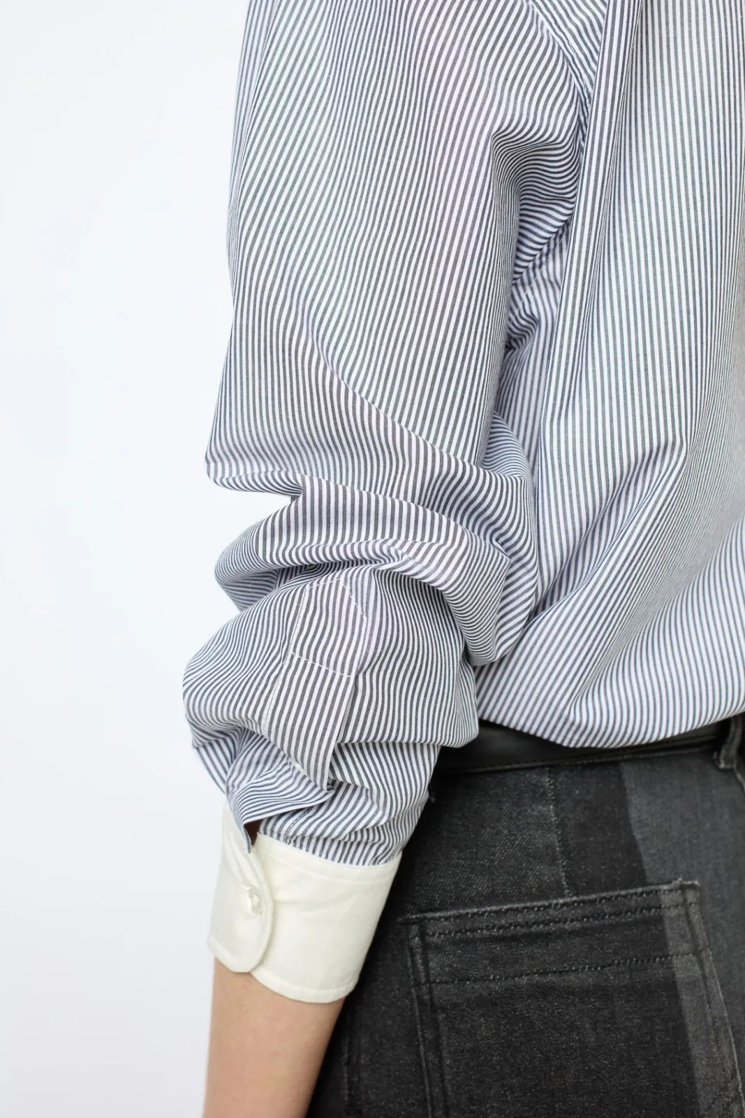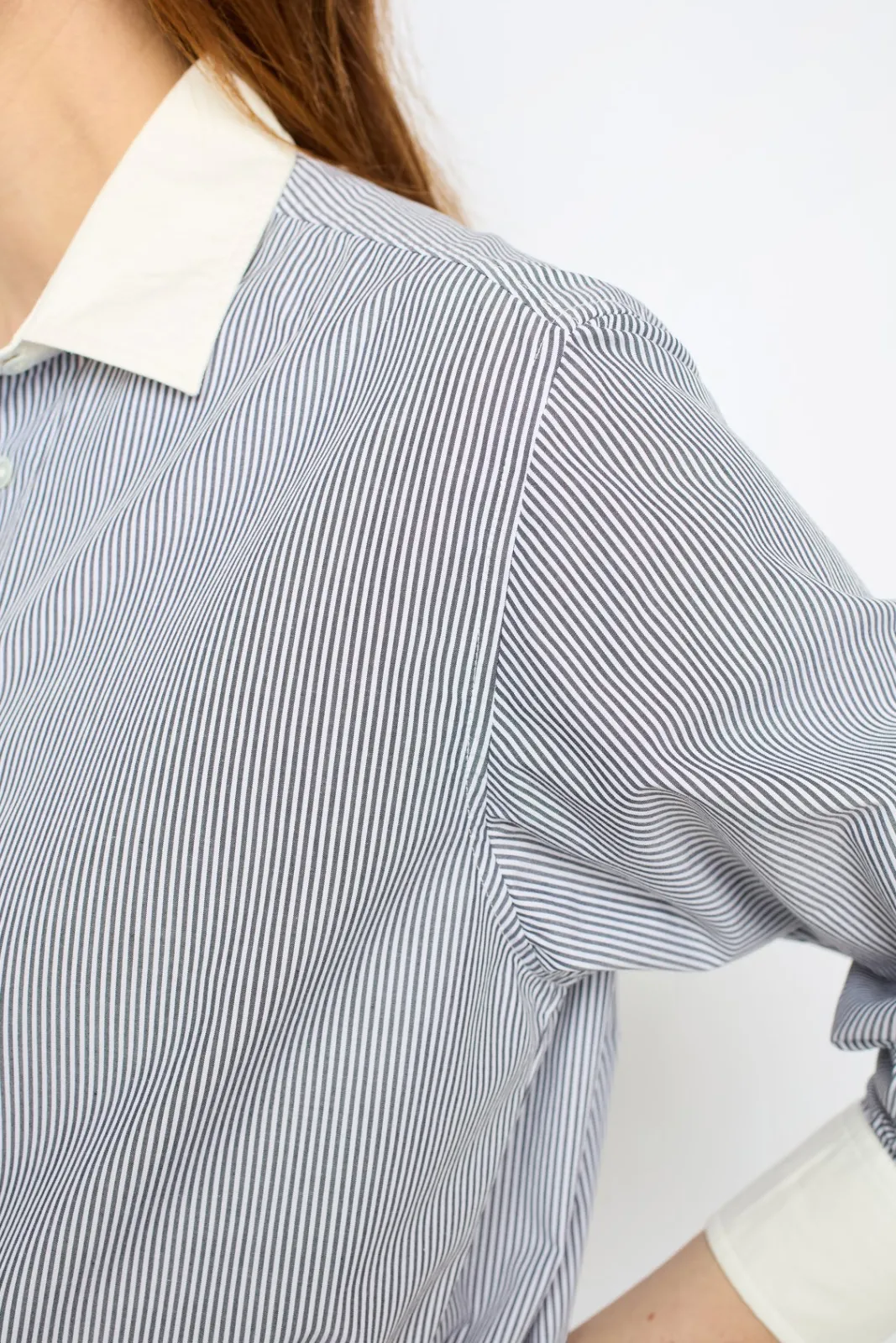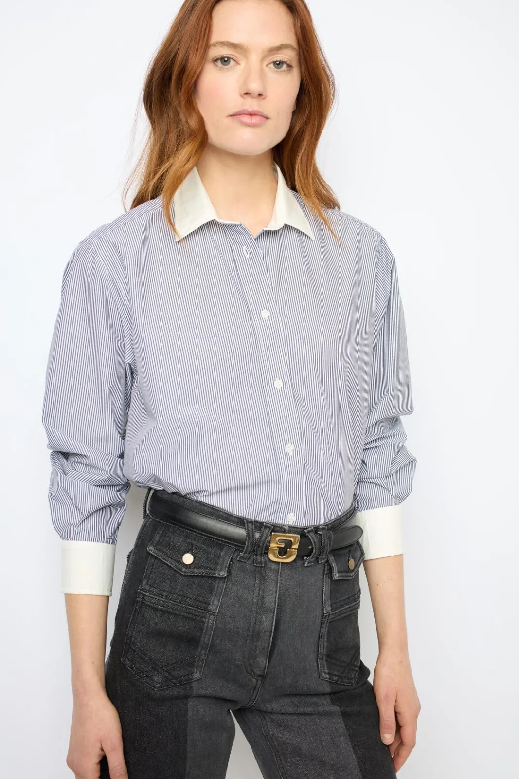 Striped popelin shirt with white plain collar and cuffs. 100% cotton.