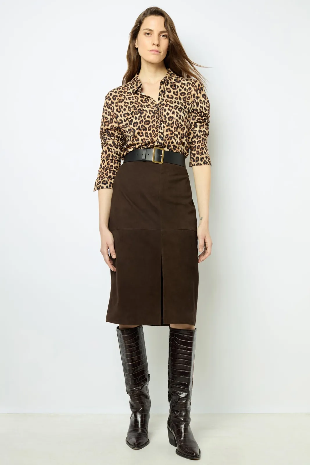 Soft and supple suede straight skirt.
