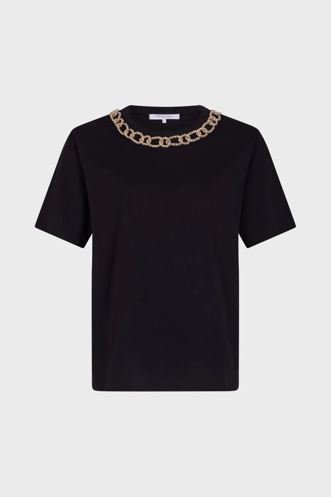 100% cotton T-shirt with rhinestones and a chain at the neckline for a rock look-Straight cut-Plain cotton-Standard leng…