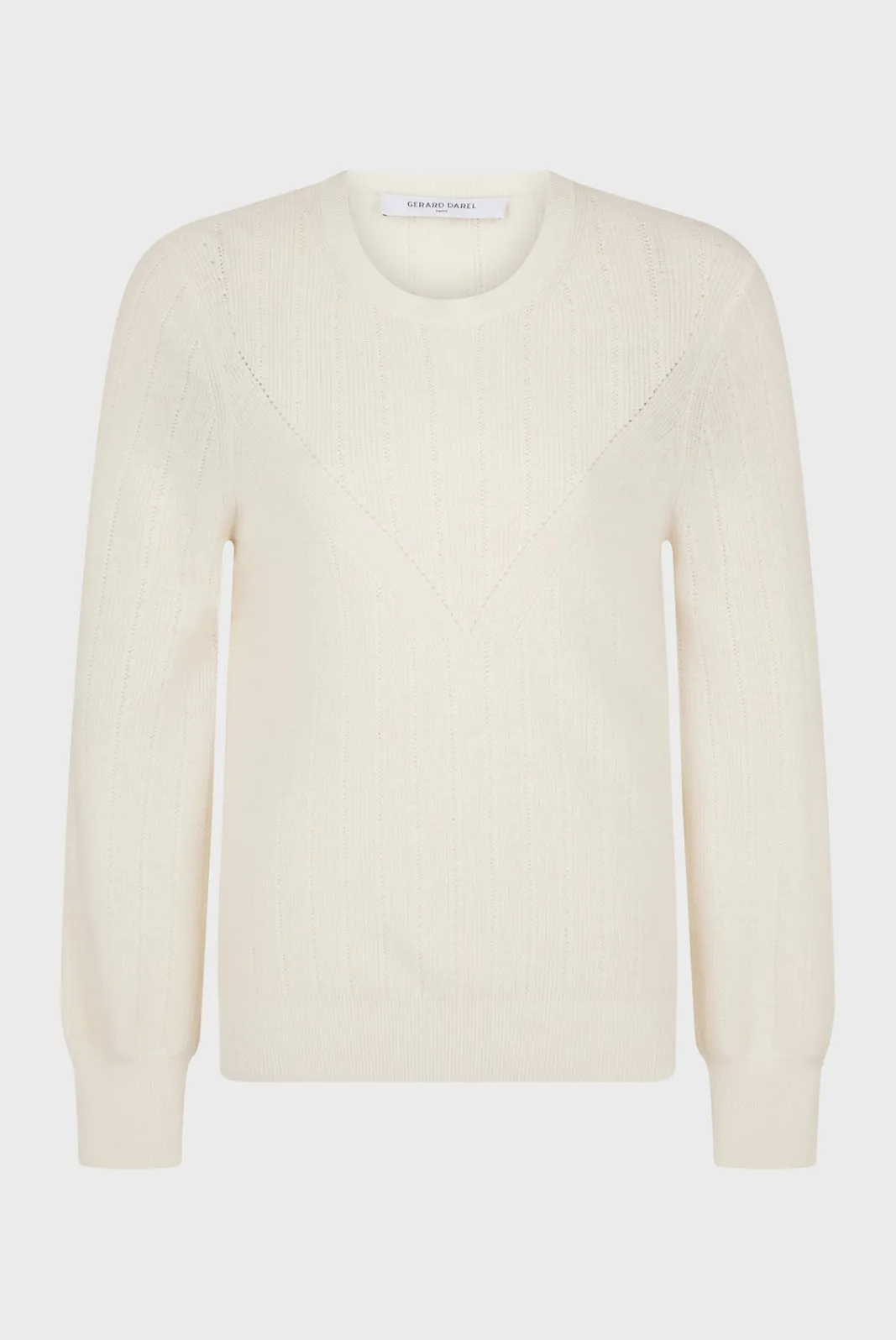 100% wool sweater with a set of openwork stitch.-Straight cut-Plain wool-Round neck-Long sleeves-Ribbed cuffs-Ribbed edg…