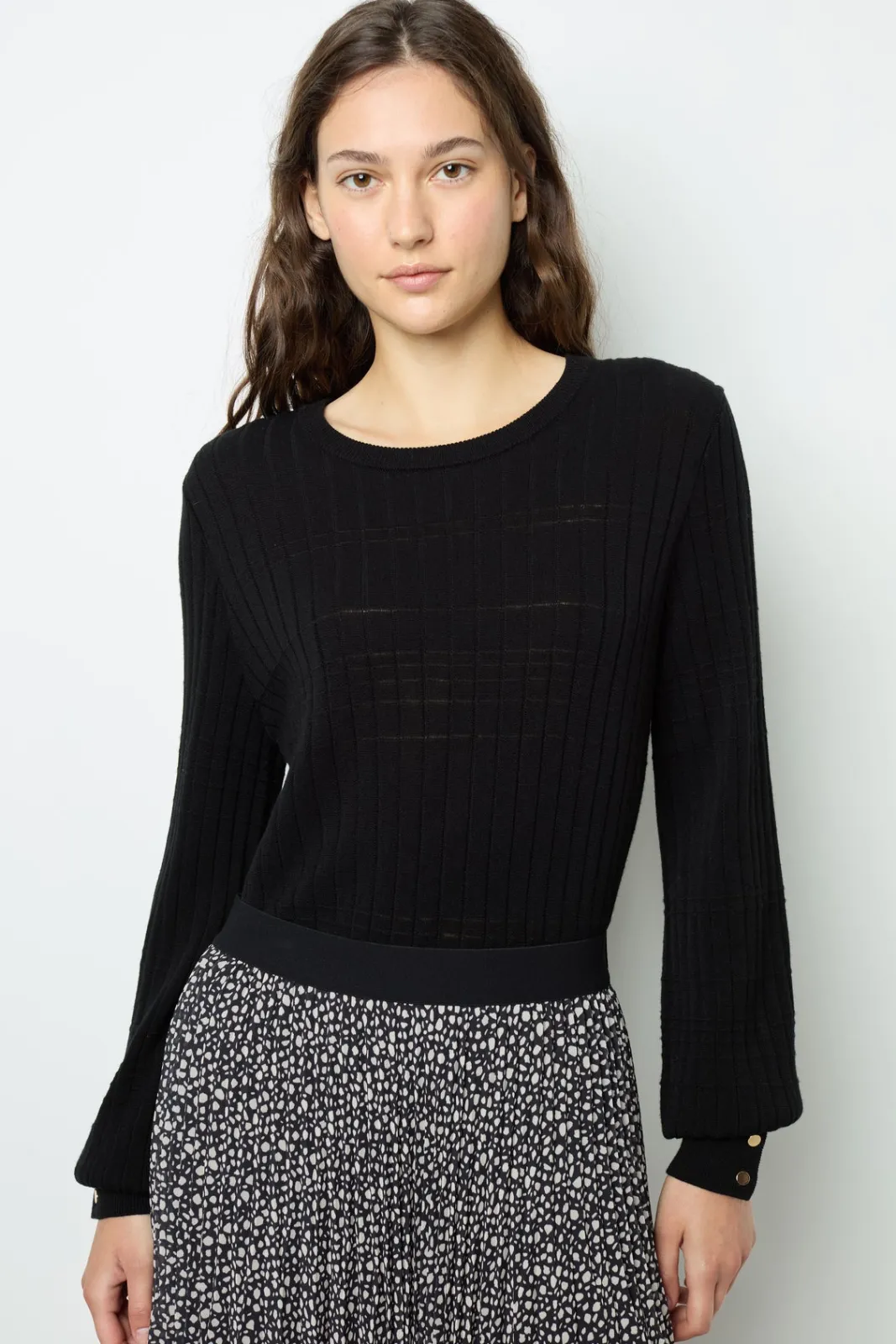 Fine-ribbed sweater. Jewel gold-tone buttons at cuffs Wool blend.