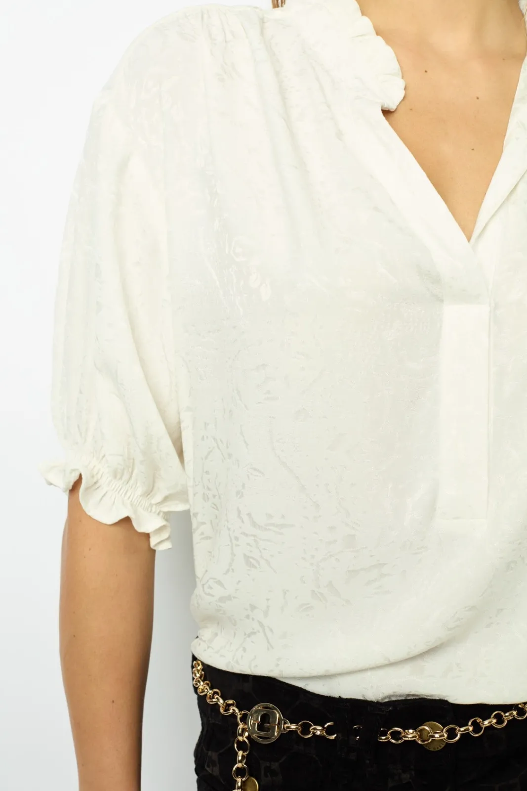 Satin feel jacquard blouse with ruffles