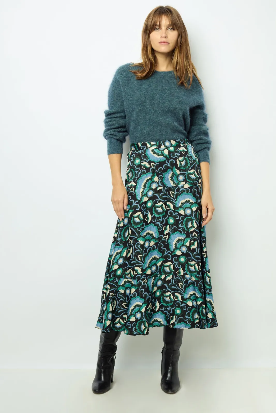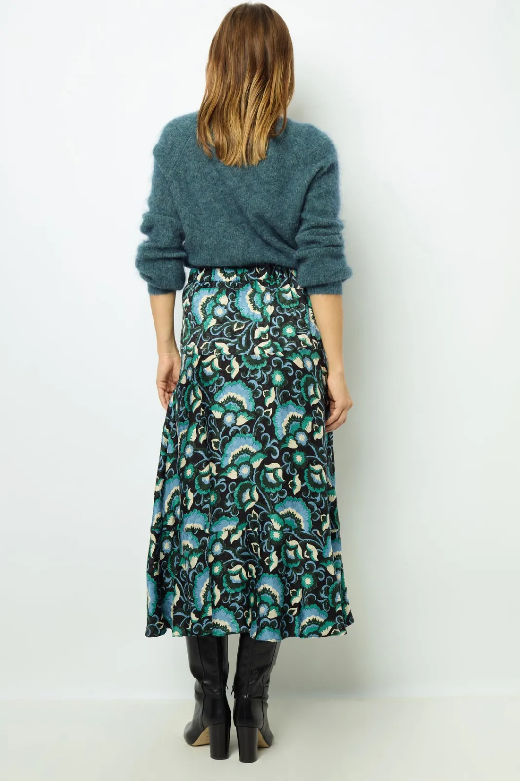 Midi skirt with foliage print on jacquard background. Soft, silky feel.