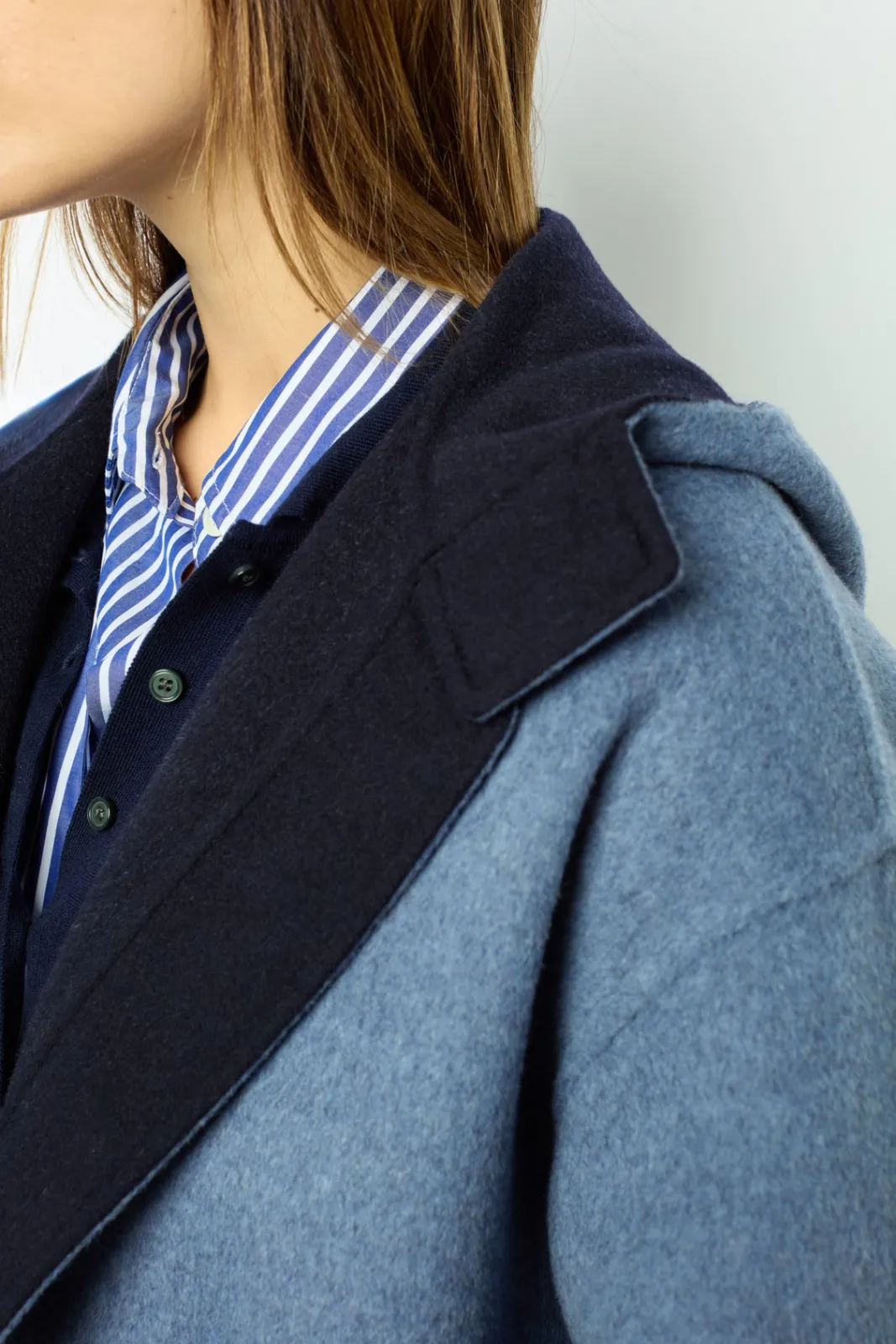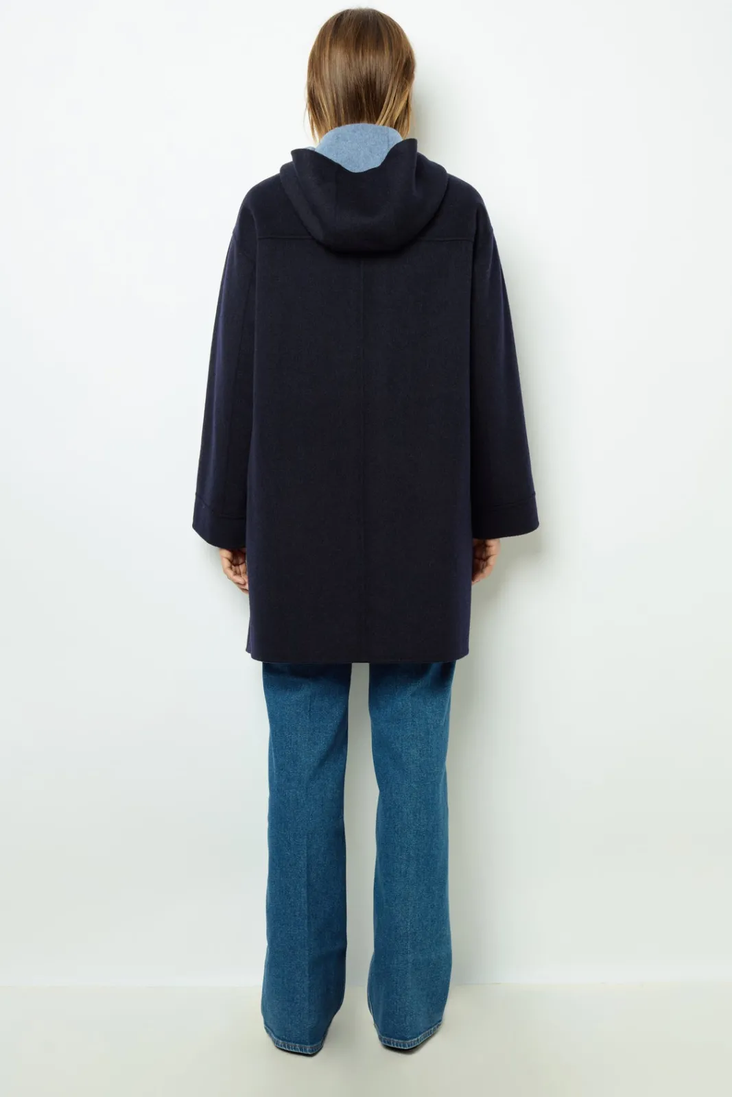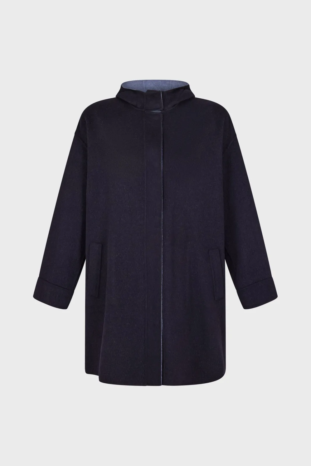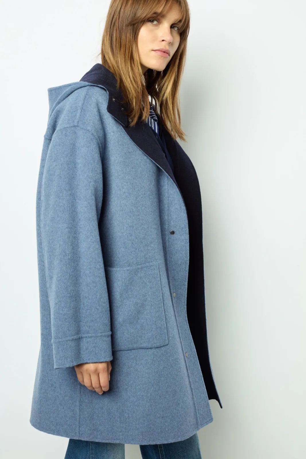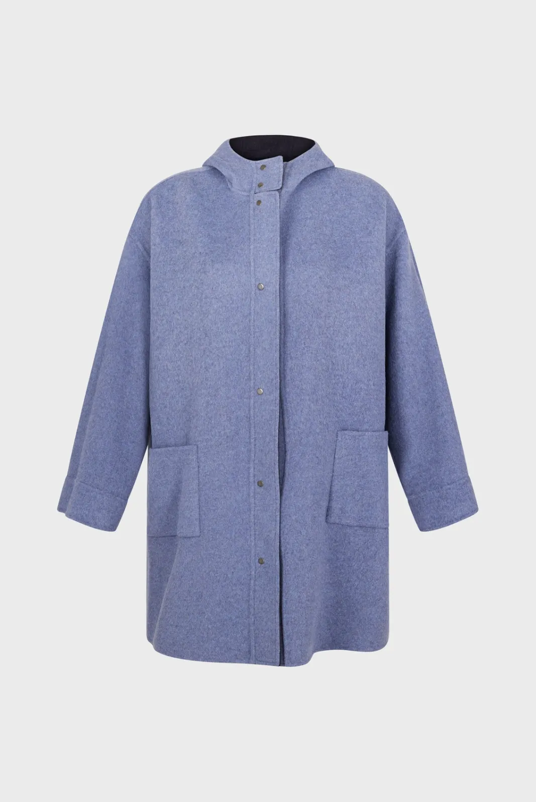 Double-face fine wool reversible hooded jacket, as soft on the inside as on the outside. Ideal for spring into summer. 100% wool.