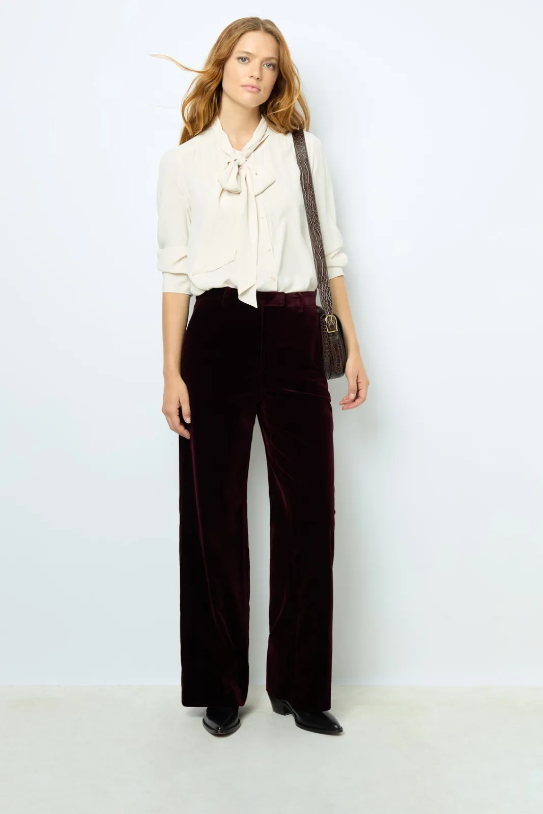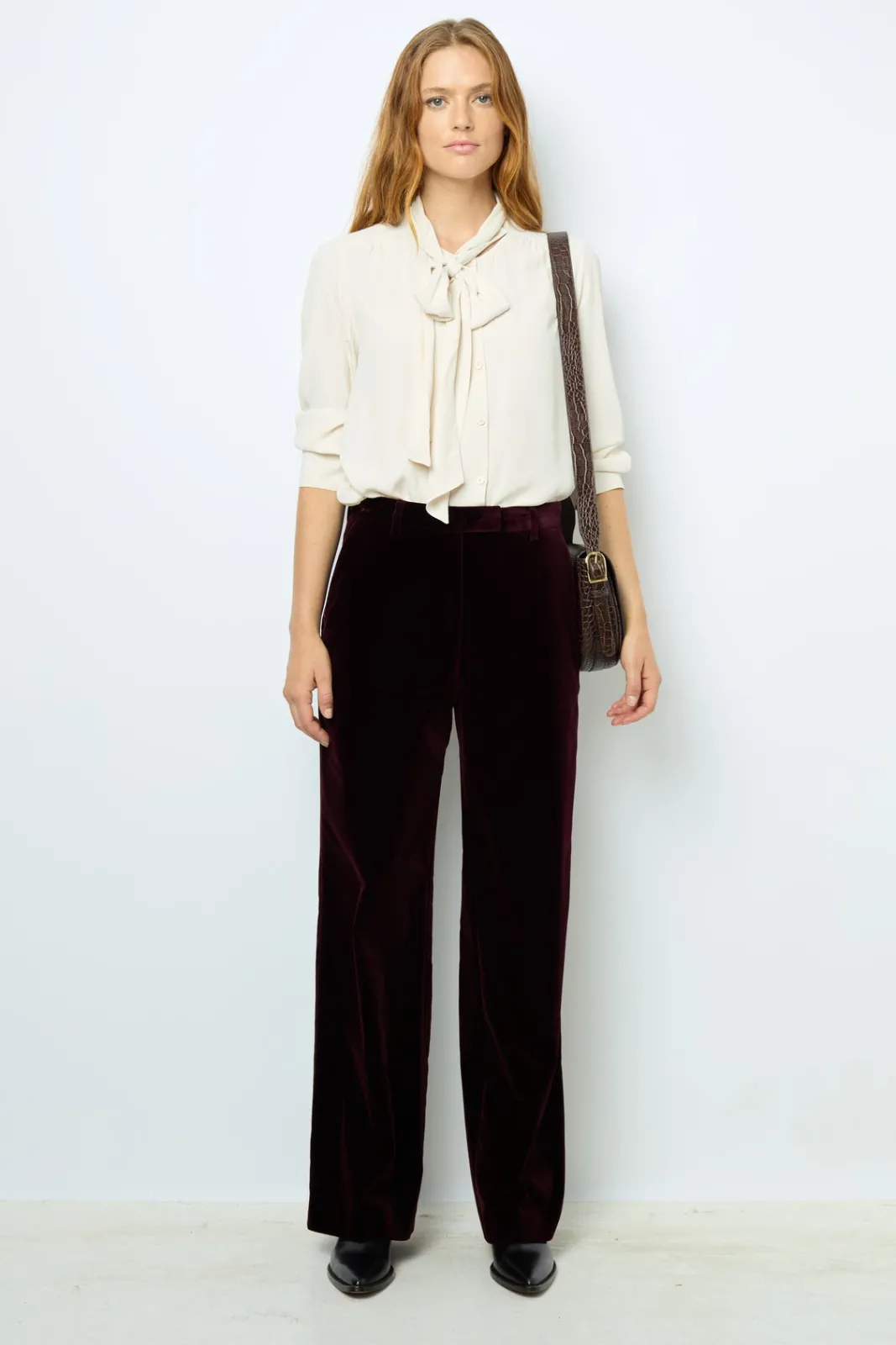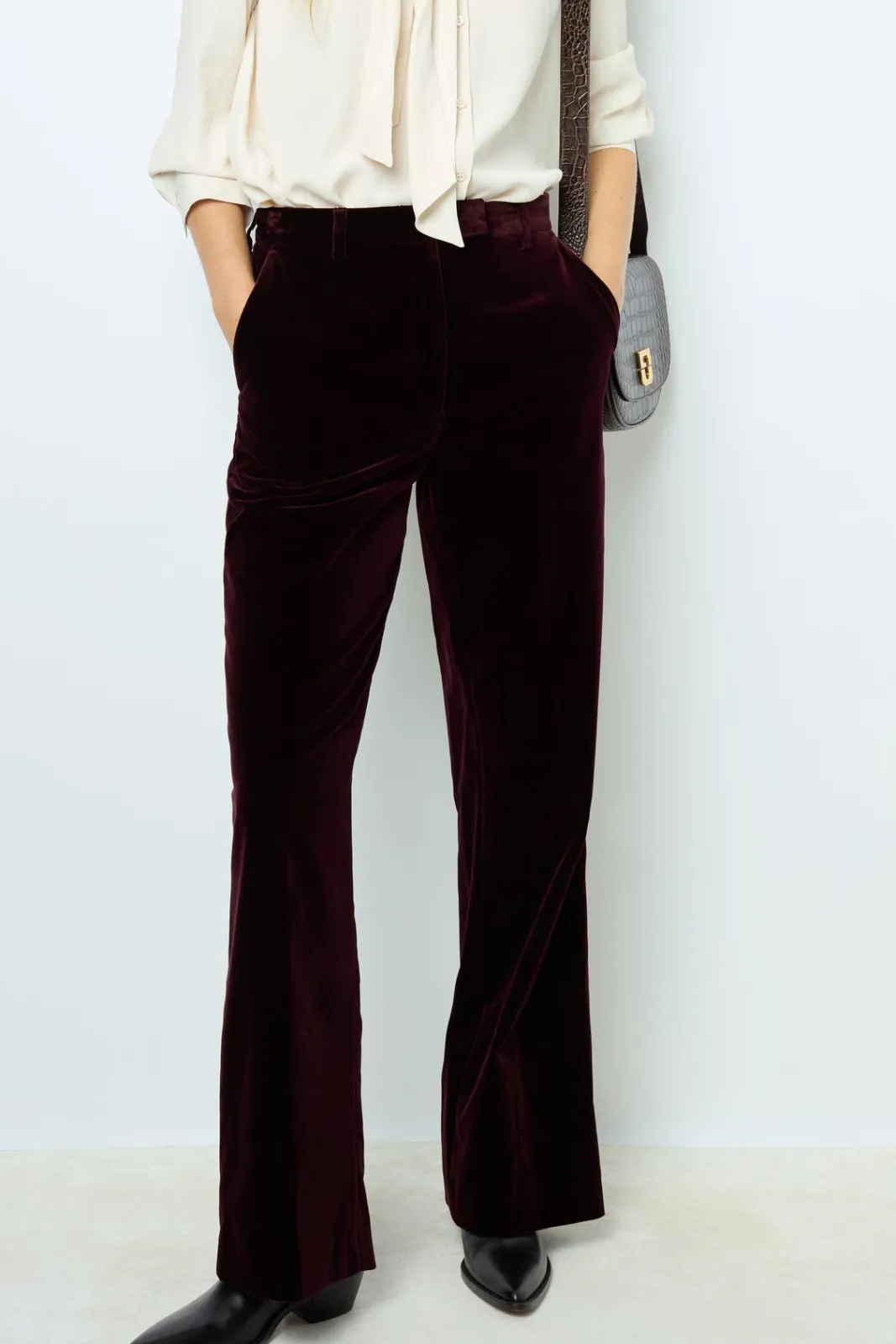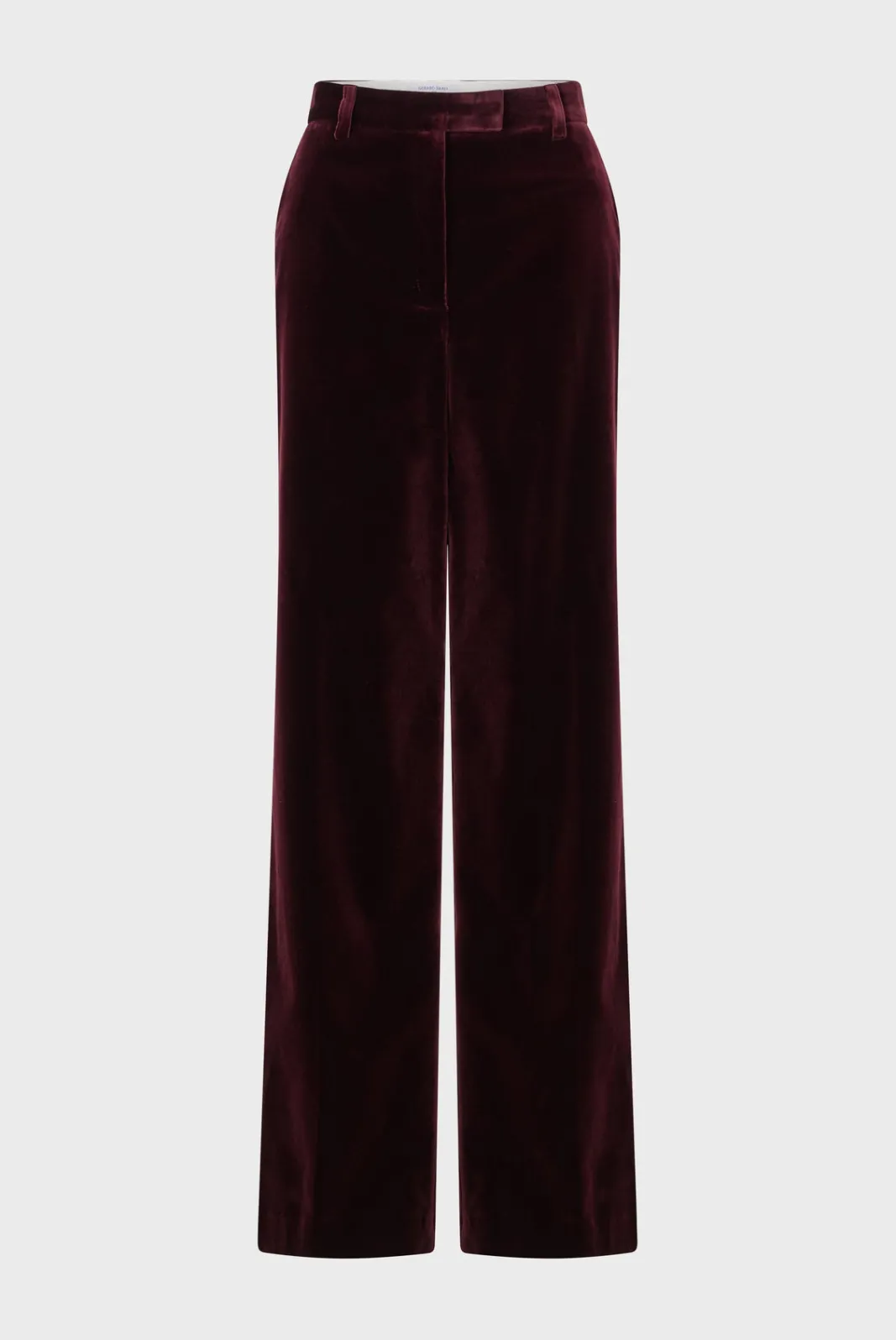 Smooth velvet pants in deep bordeaux.