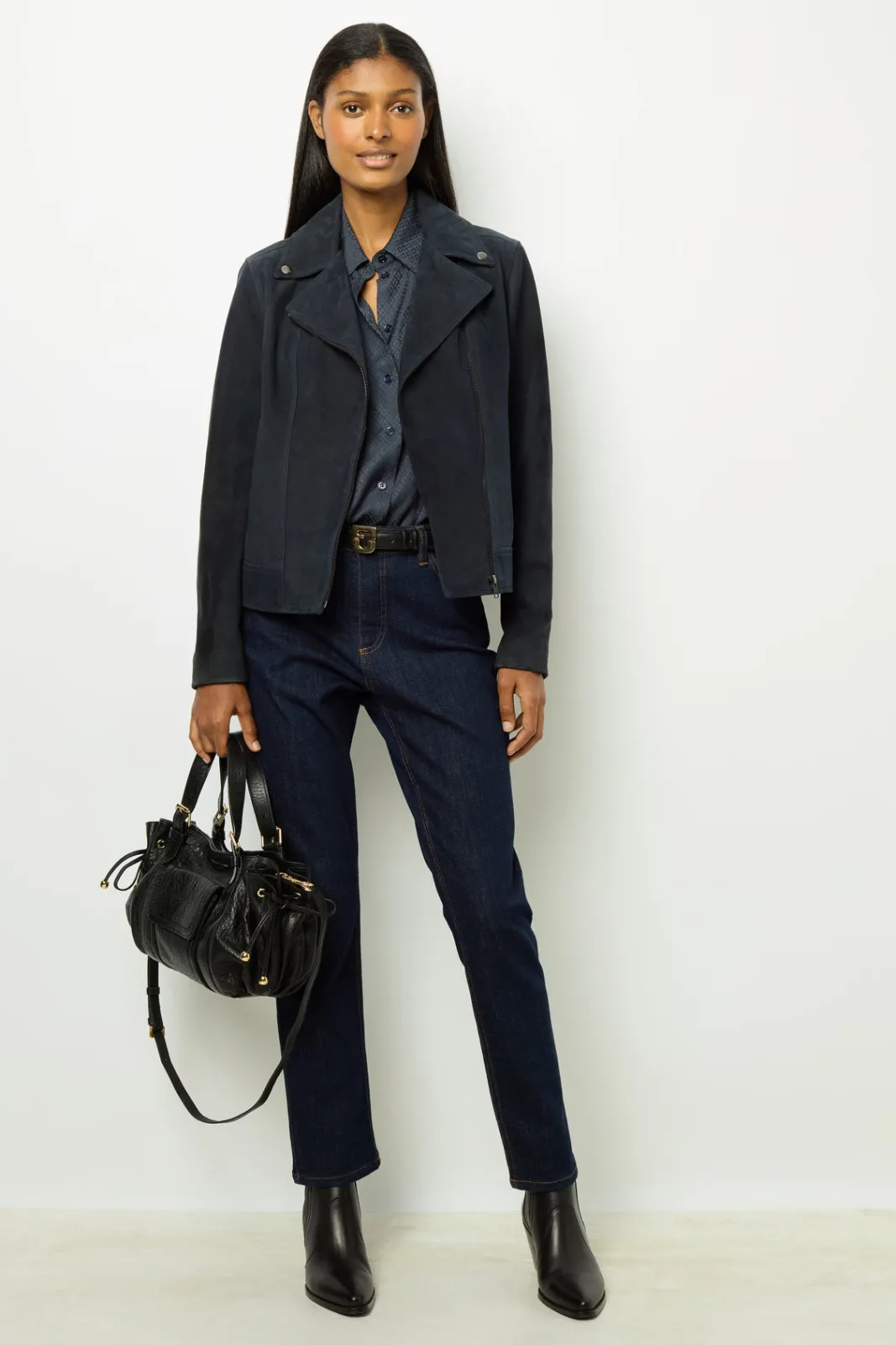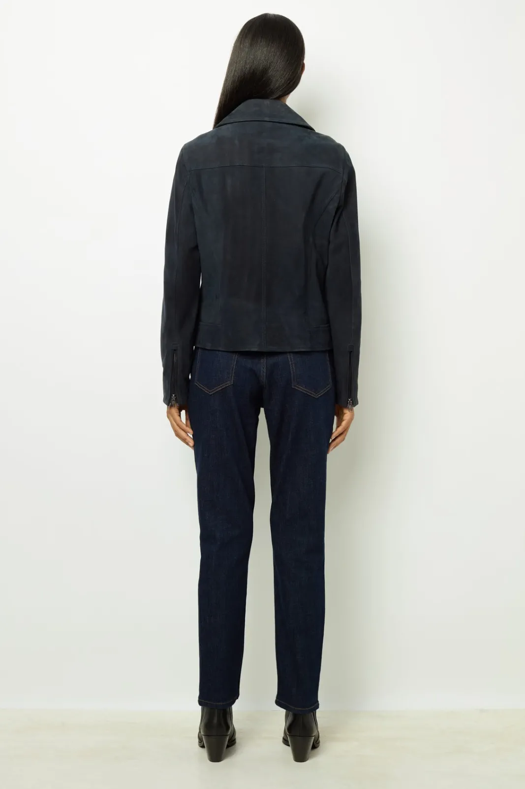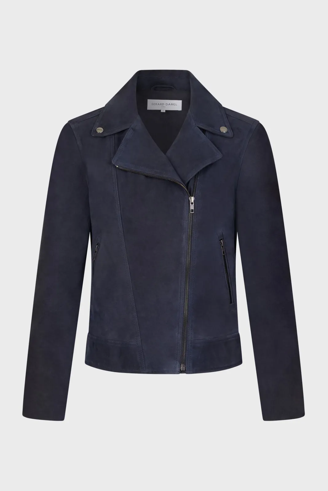 Biker jacket in deep navy blue for a rock’n’roll but chic style. Soft and supple suede.