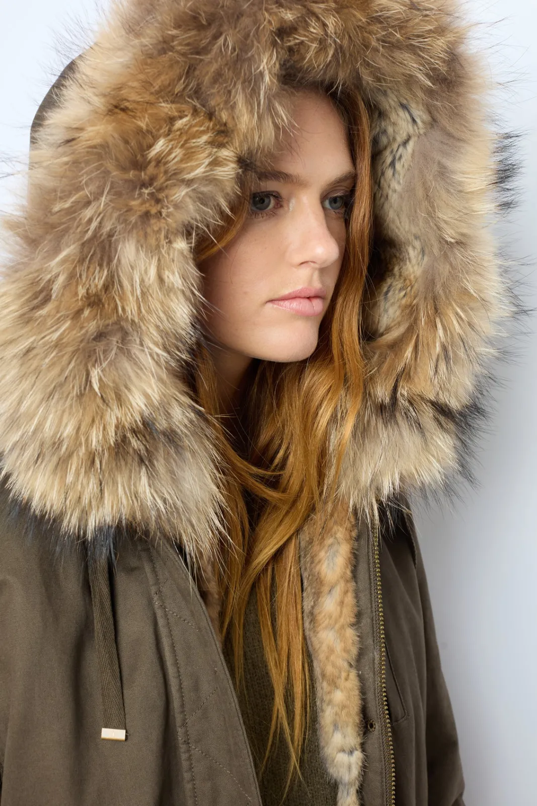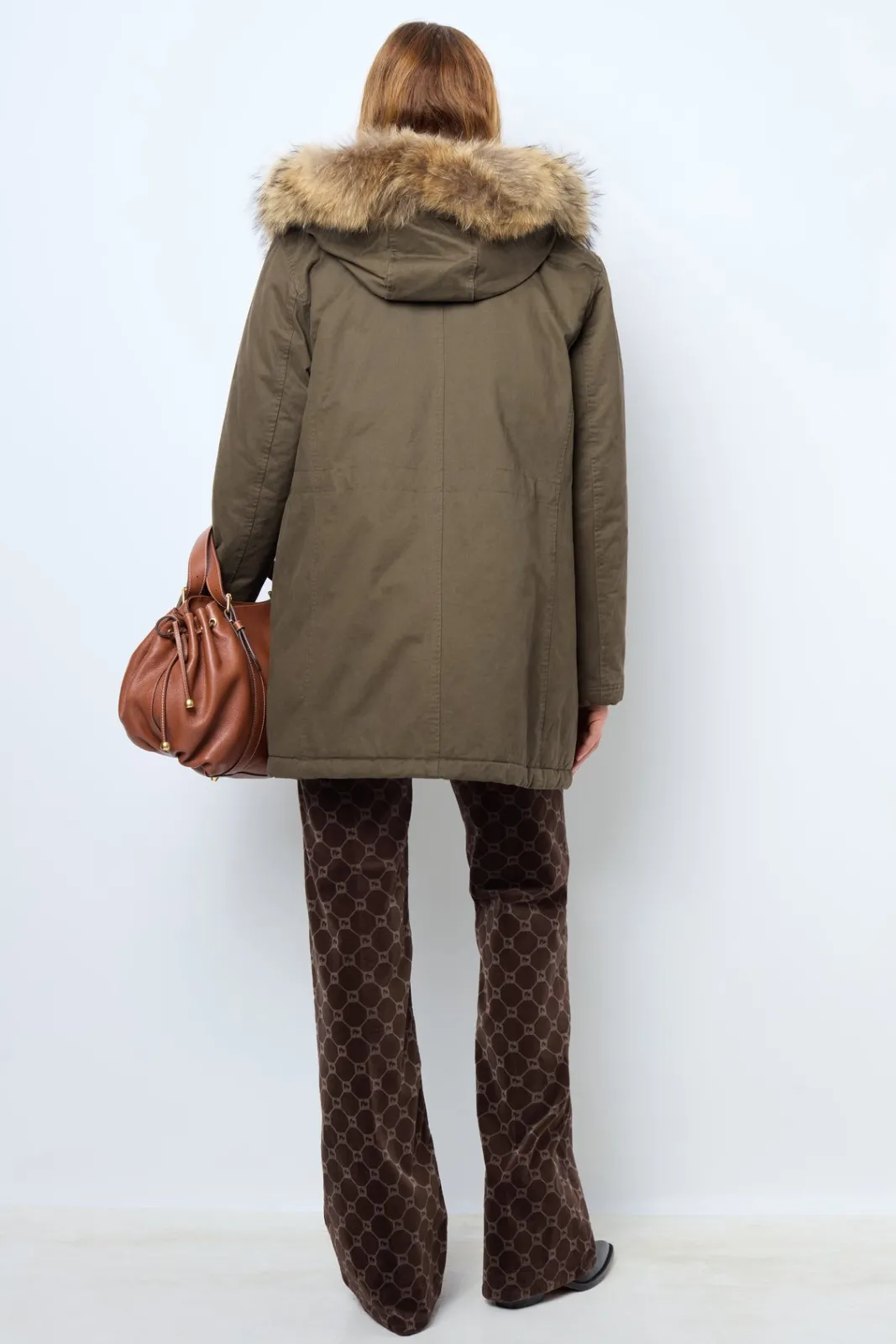 Cotton mid-length parka with quilted lining. The fur at the collar and along the placket is removable. Khaki for a casual, contemporary look.