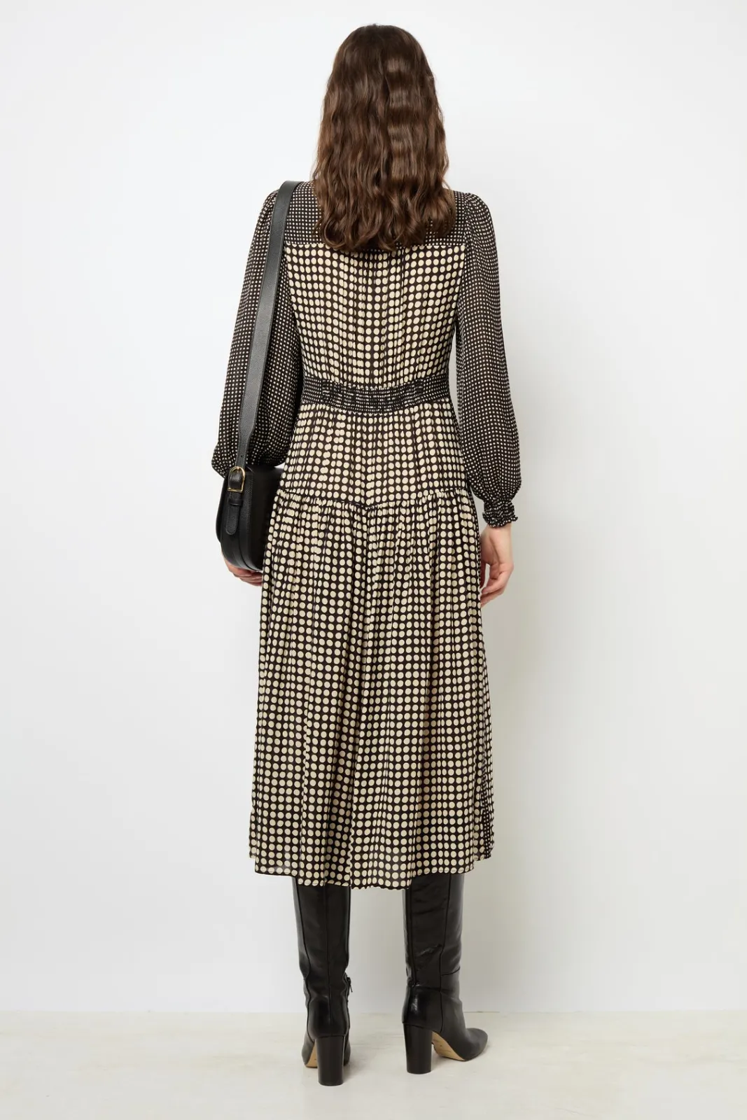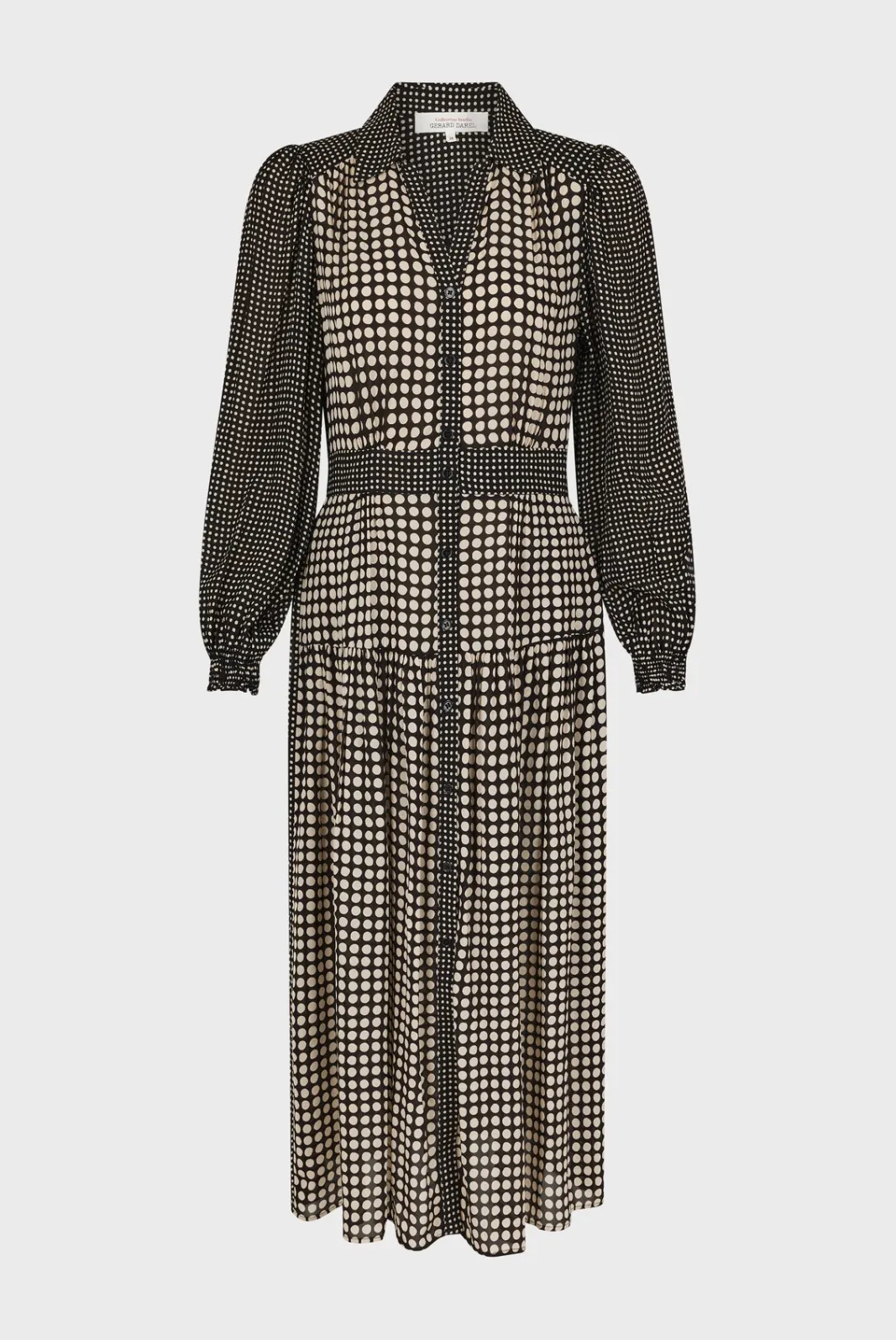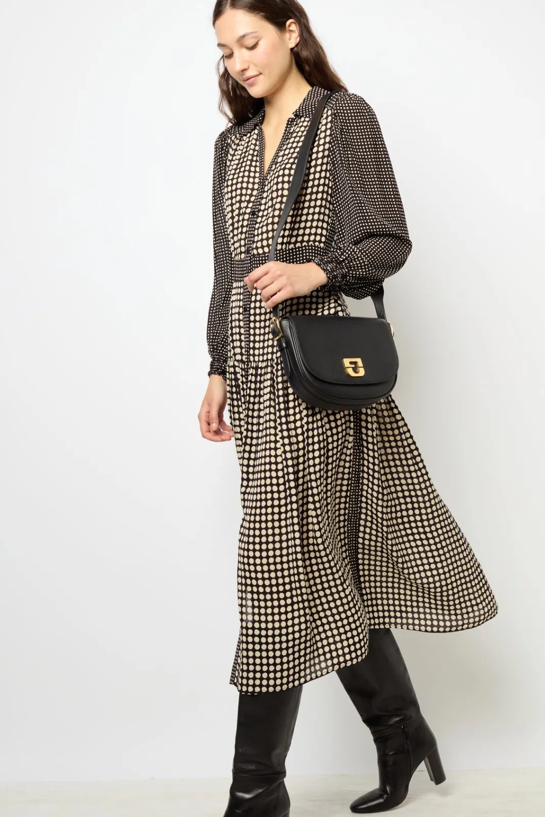 A long shirt dress with a contrasting polka dot pattern and a soft, silky touch.