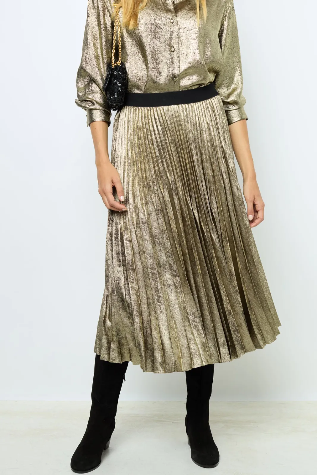 Gold-tone pleated midi skirt for a new look at a classic style.