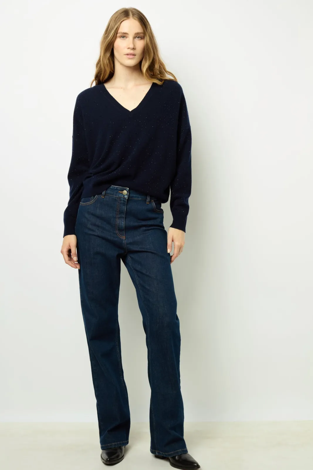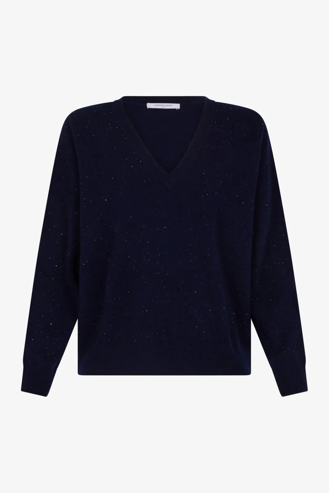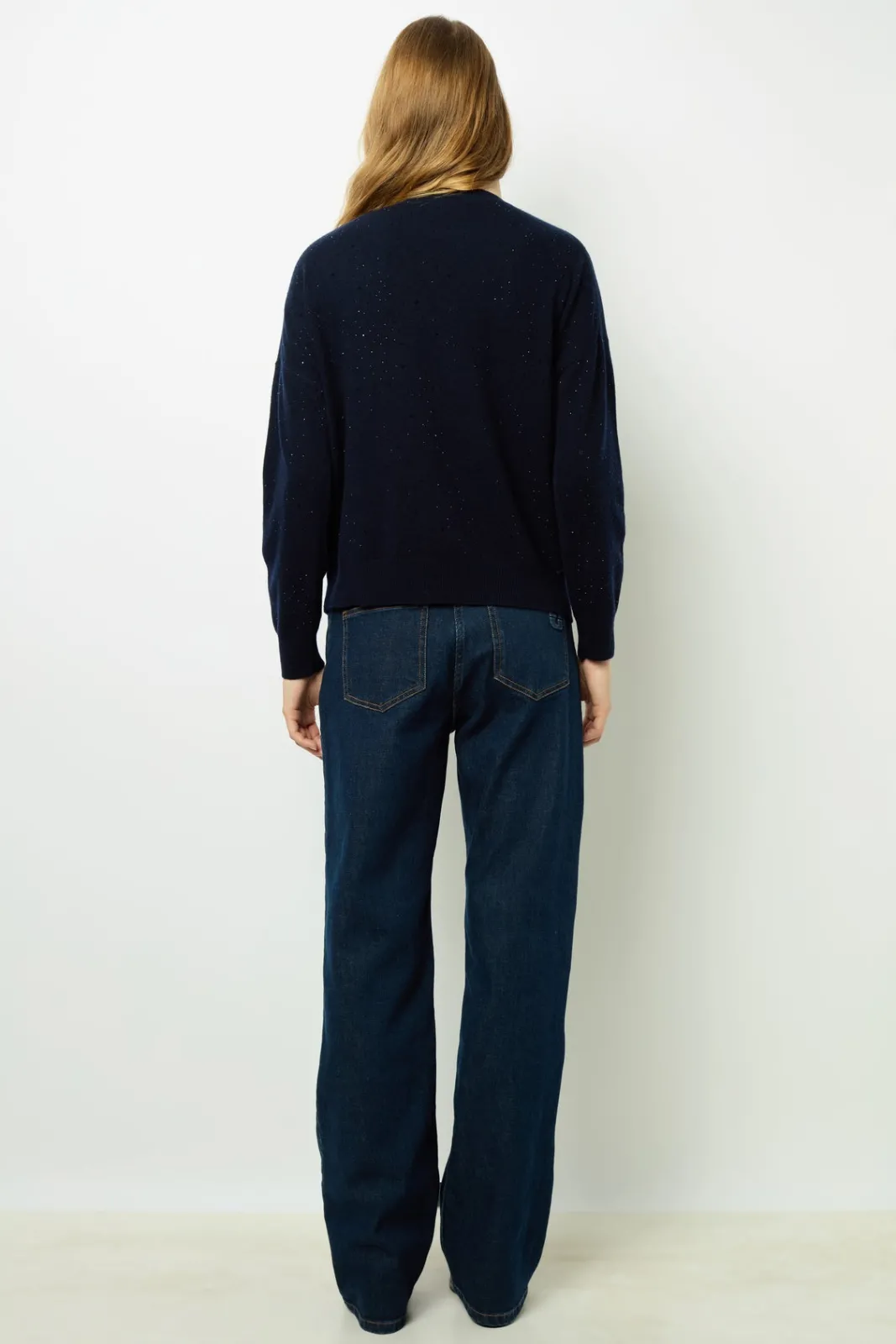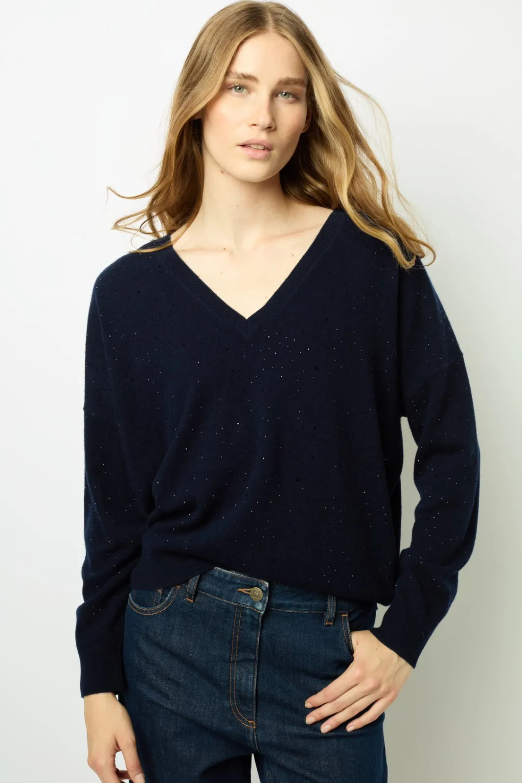 100% wool V-neck sweater with mini-rhinestones all-over.