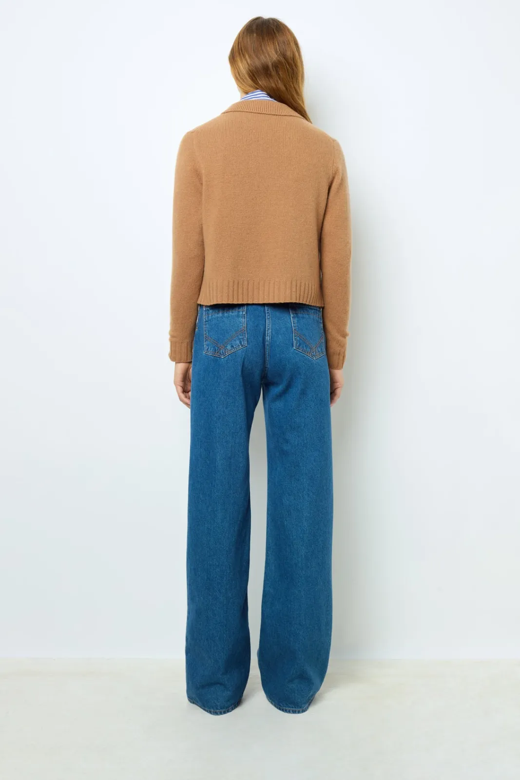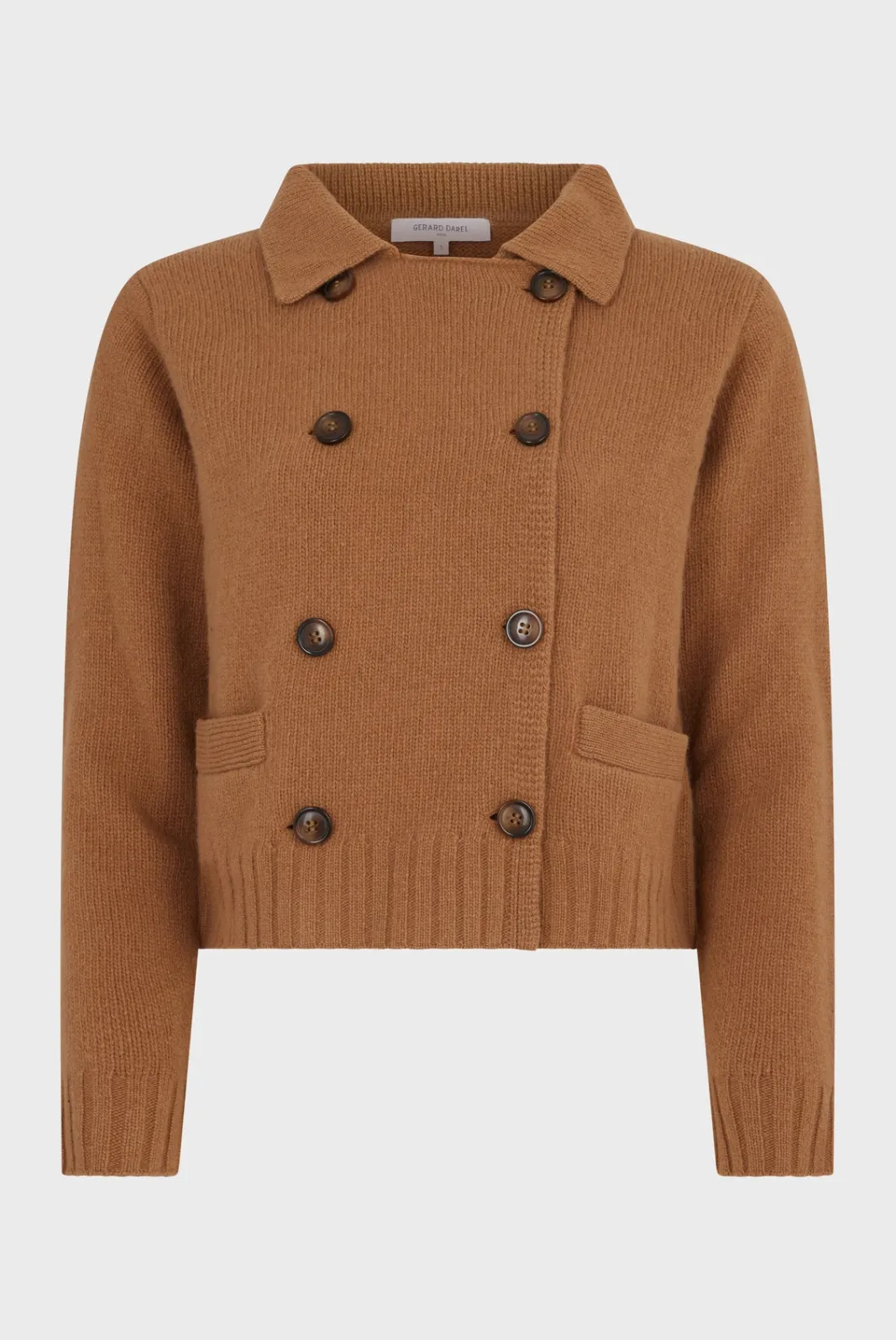 Double-breasted cardigan in wool with a touch of cashmere. Camel color for timeless chic wear.
