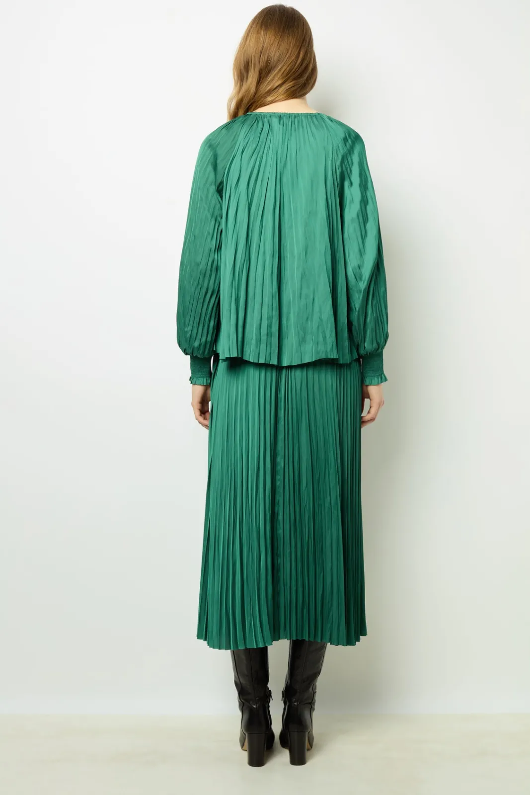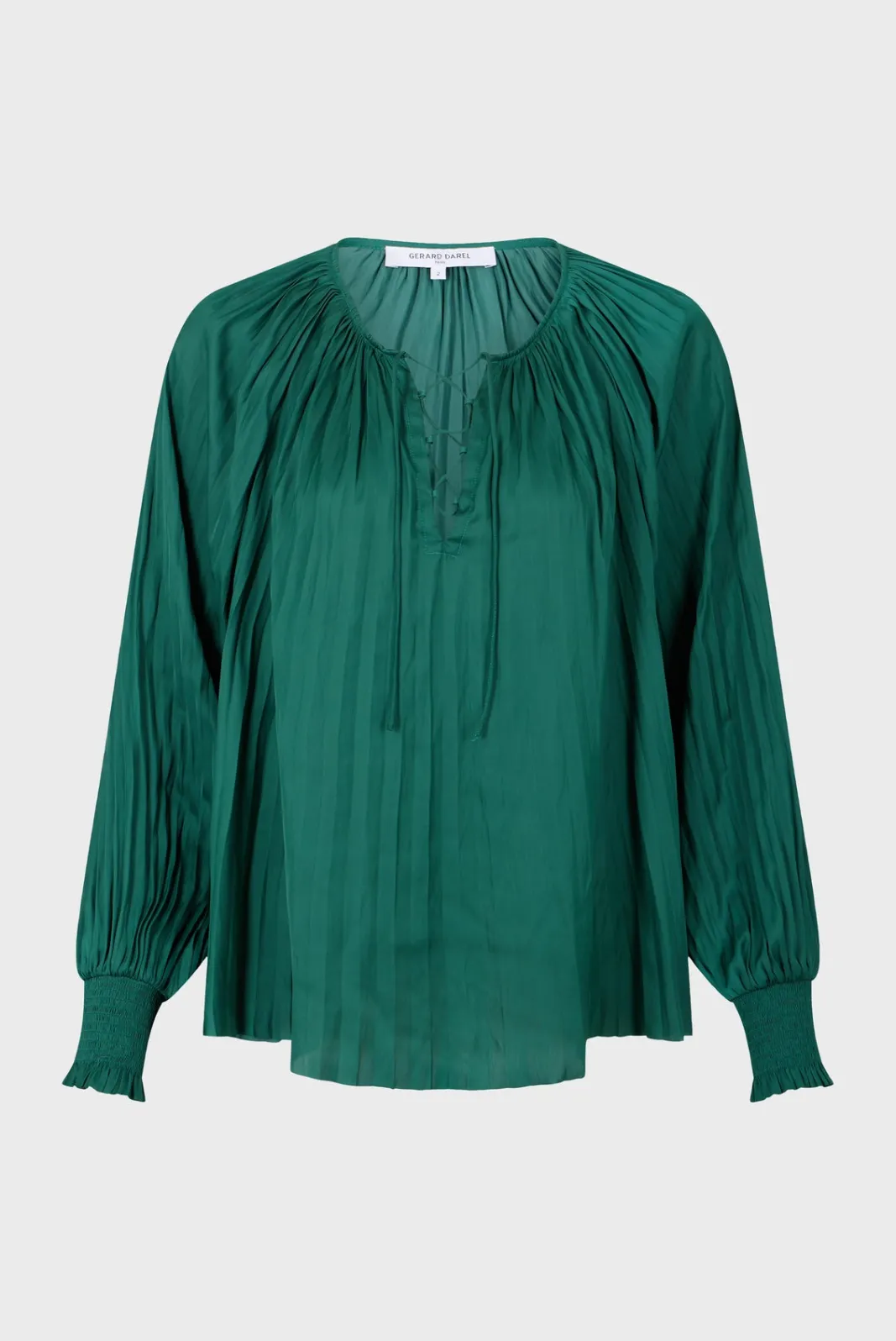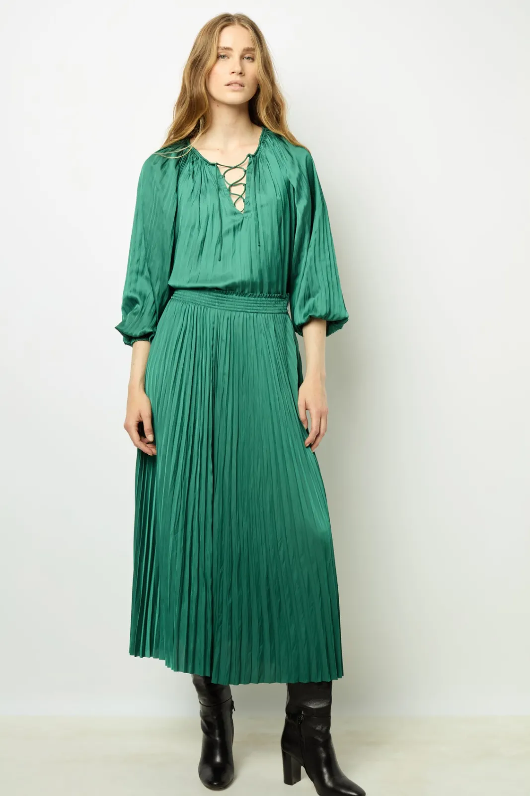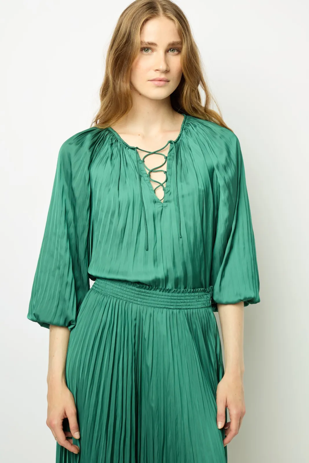 Satin blouse with pleated neckline tied with a lace.-Loose wide cut-Plain fabric-Raglan sleeves-Round neck-Long sleeves-…
