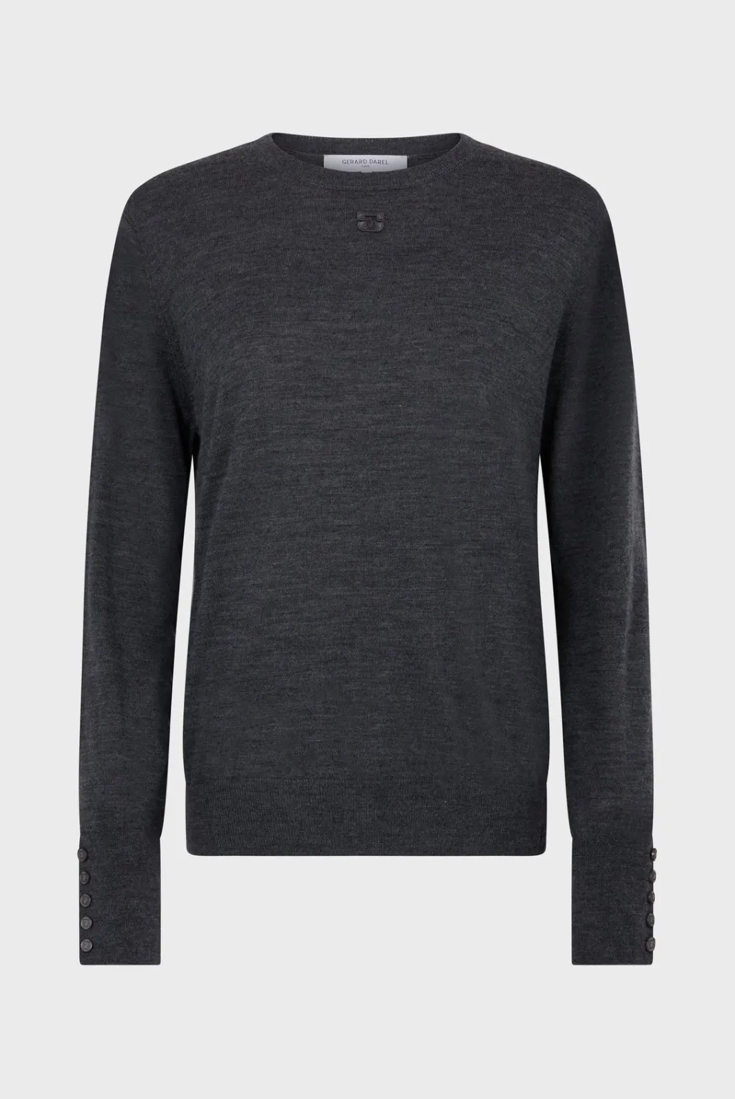 100% fine merino wool round neck sweater. Mottled gray for classic look.