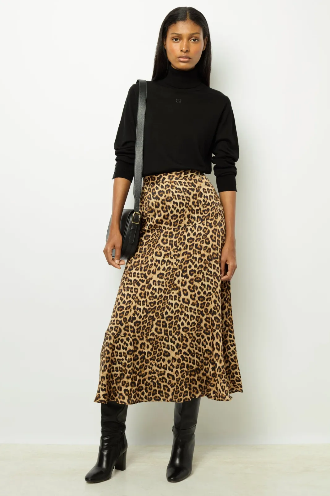 Satin midi skirt in a leopard print for a deliciously vintage feel Wear sophisticated or more casual with a wool sweater and boots.