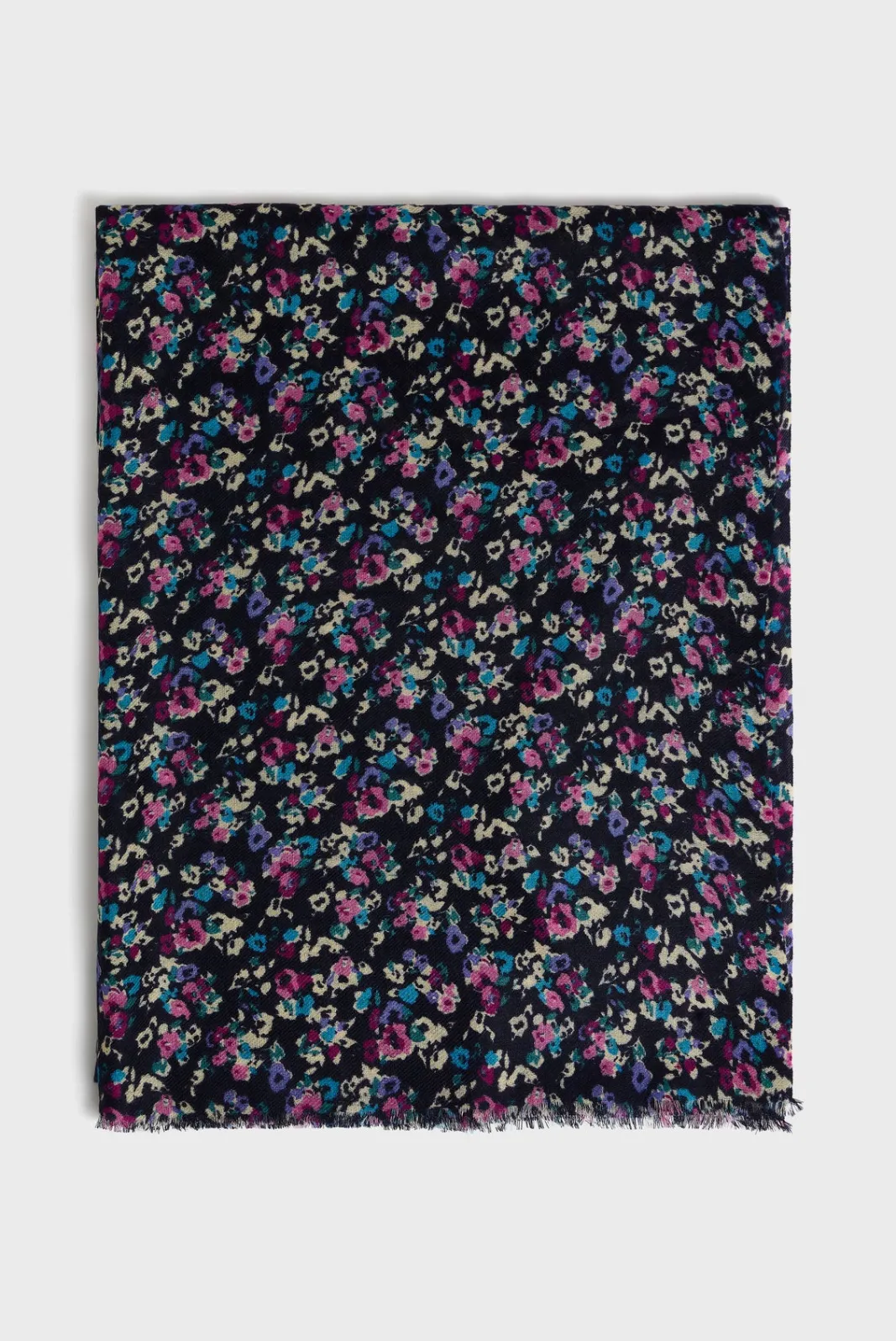 Floral print navy blue scarf, in a soft wool and silk blend.70 x 180cm.-Rectangular-Floral pattern-Slightly fringed deta…