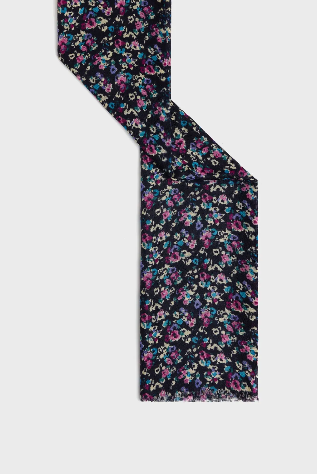 Floral print navy blue scarf, in a soft wool and silk blend.