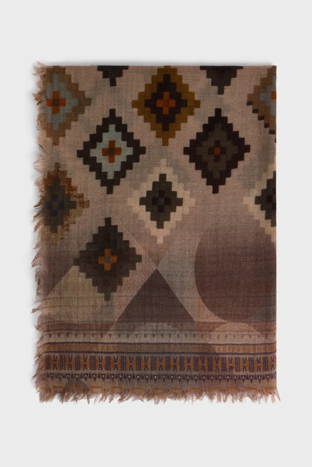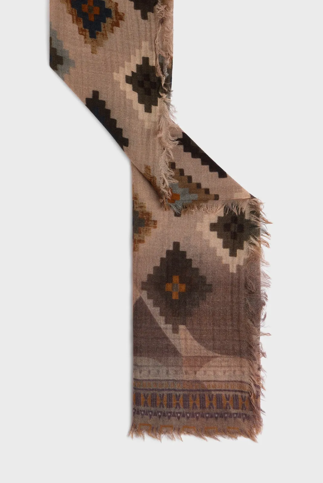 100% wool scarf with ethnic-inspired print.70x180cm-Rectangular-Geometric pattern-Slightly frayed edges