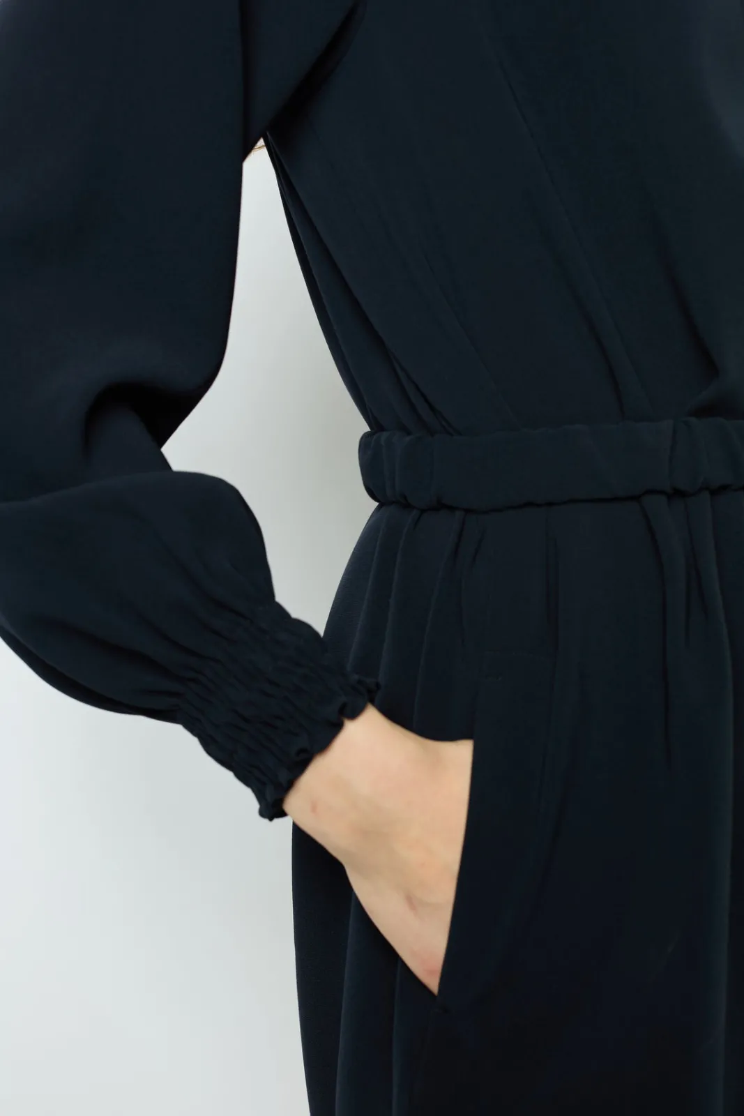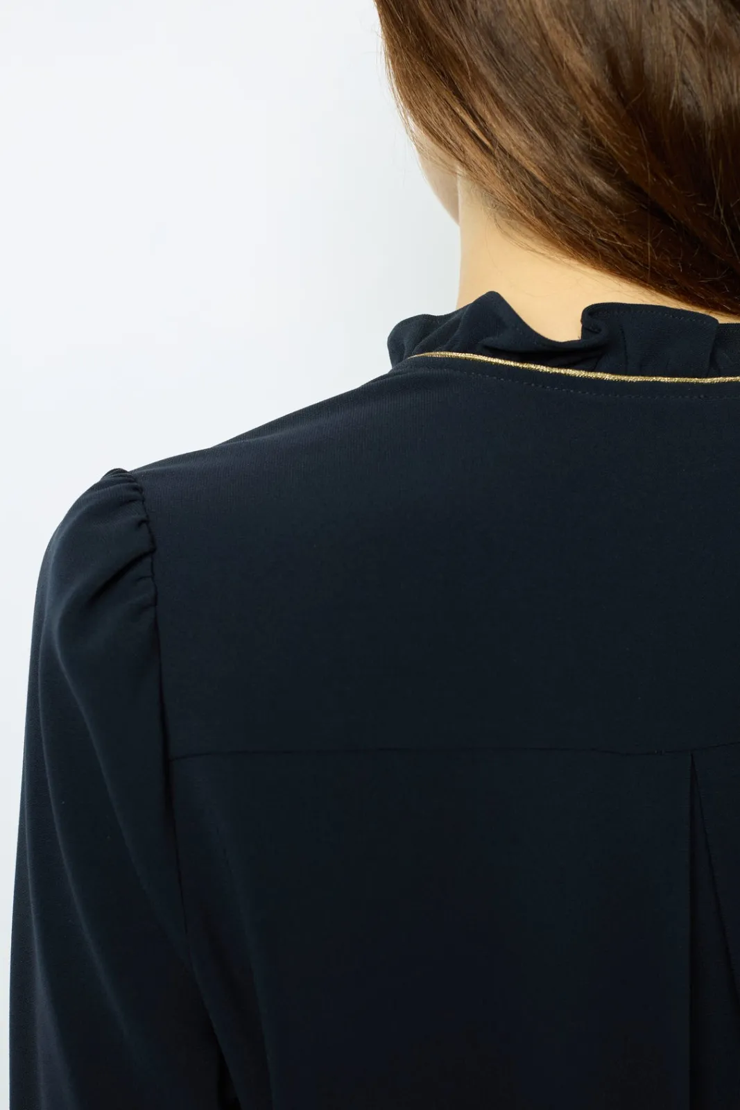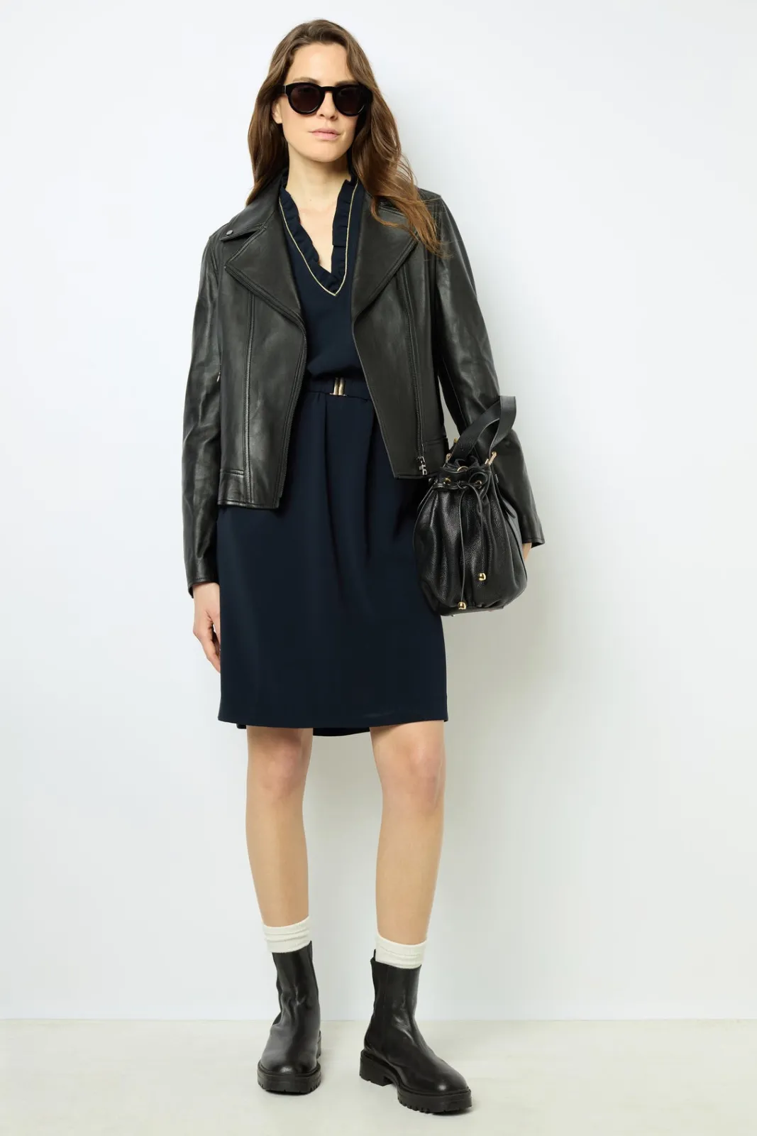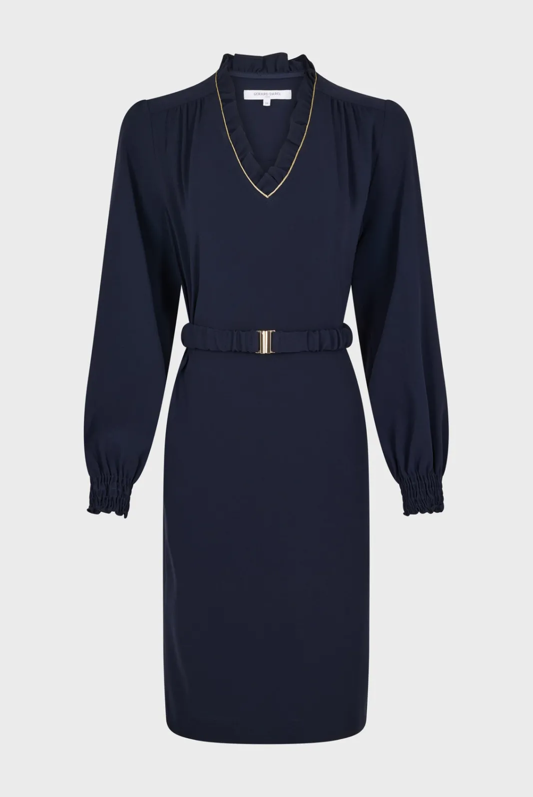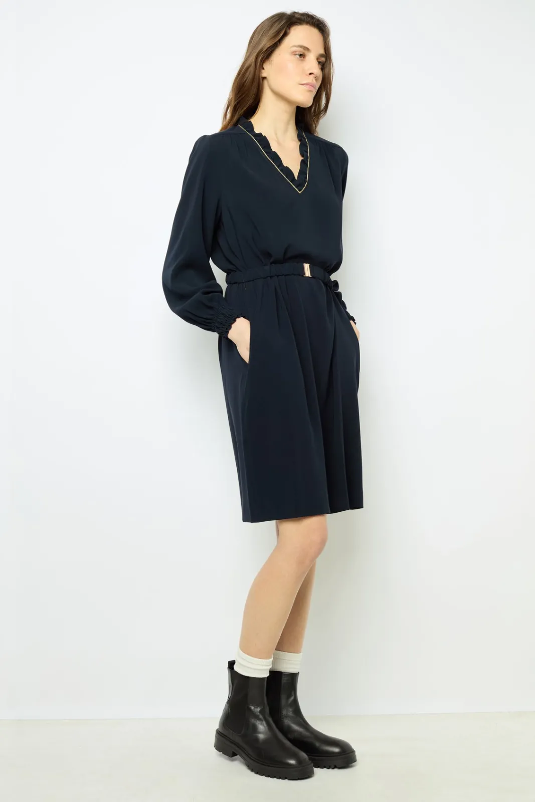 Microfiber mini dress with ruffled collar a touch of lurex. Removable belt at the waist