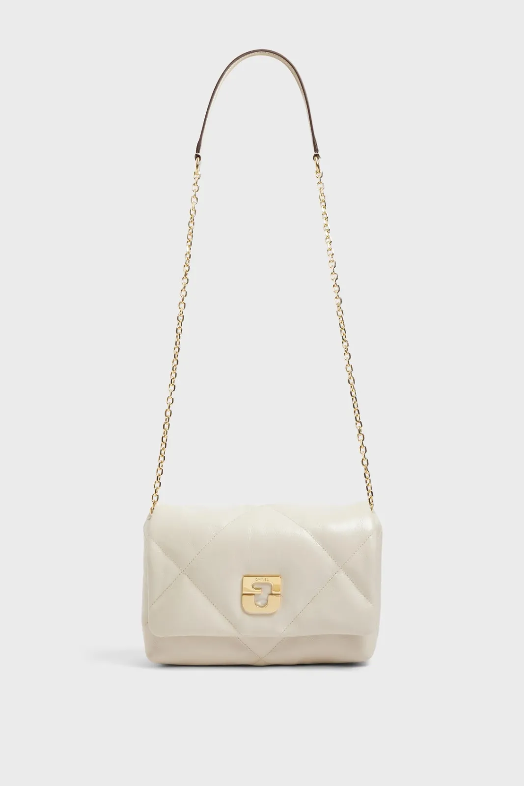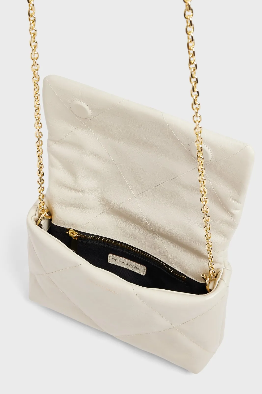 A small jewel of subtlety of the collection, the Fanny has everything of an icon. Its ideal format and adjustable shoulder strap between leather and chain offer a comfortable worn, both chic and practical. We find the Gerard Darel signature hidden on the body of the bag. But it is in gold on the flap of its padding in cowhide leather with delicately wrinkled effect, that shine its initials on a background of giant rhombuses with graphic and sensual lines. A bag thought like a cloud of softness in a leather glove, a real designer piece.