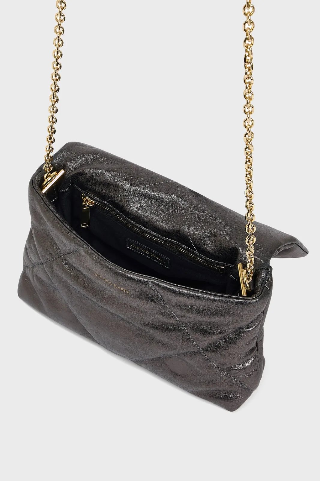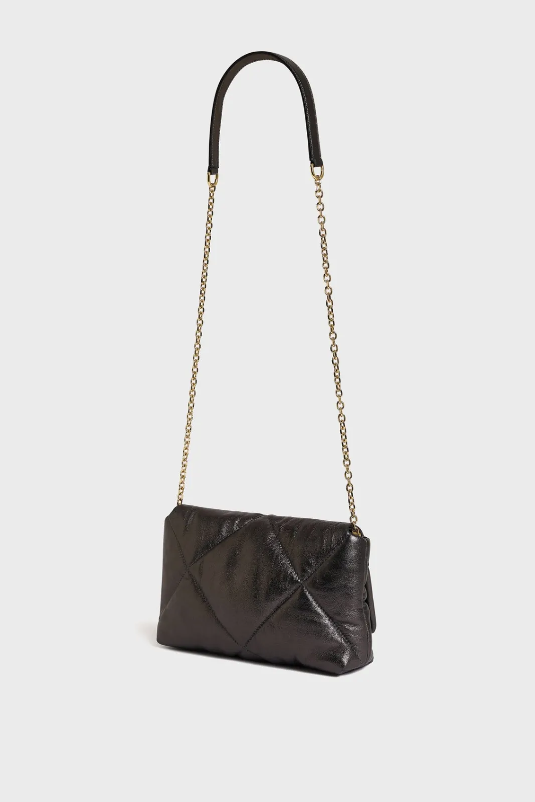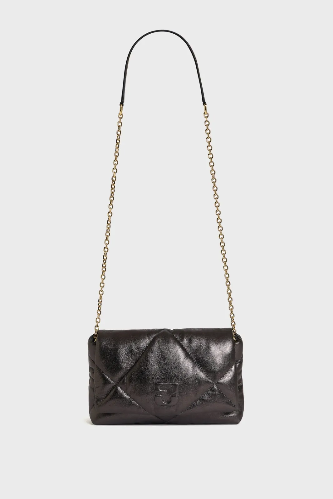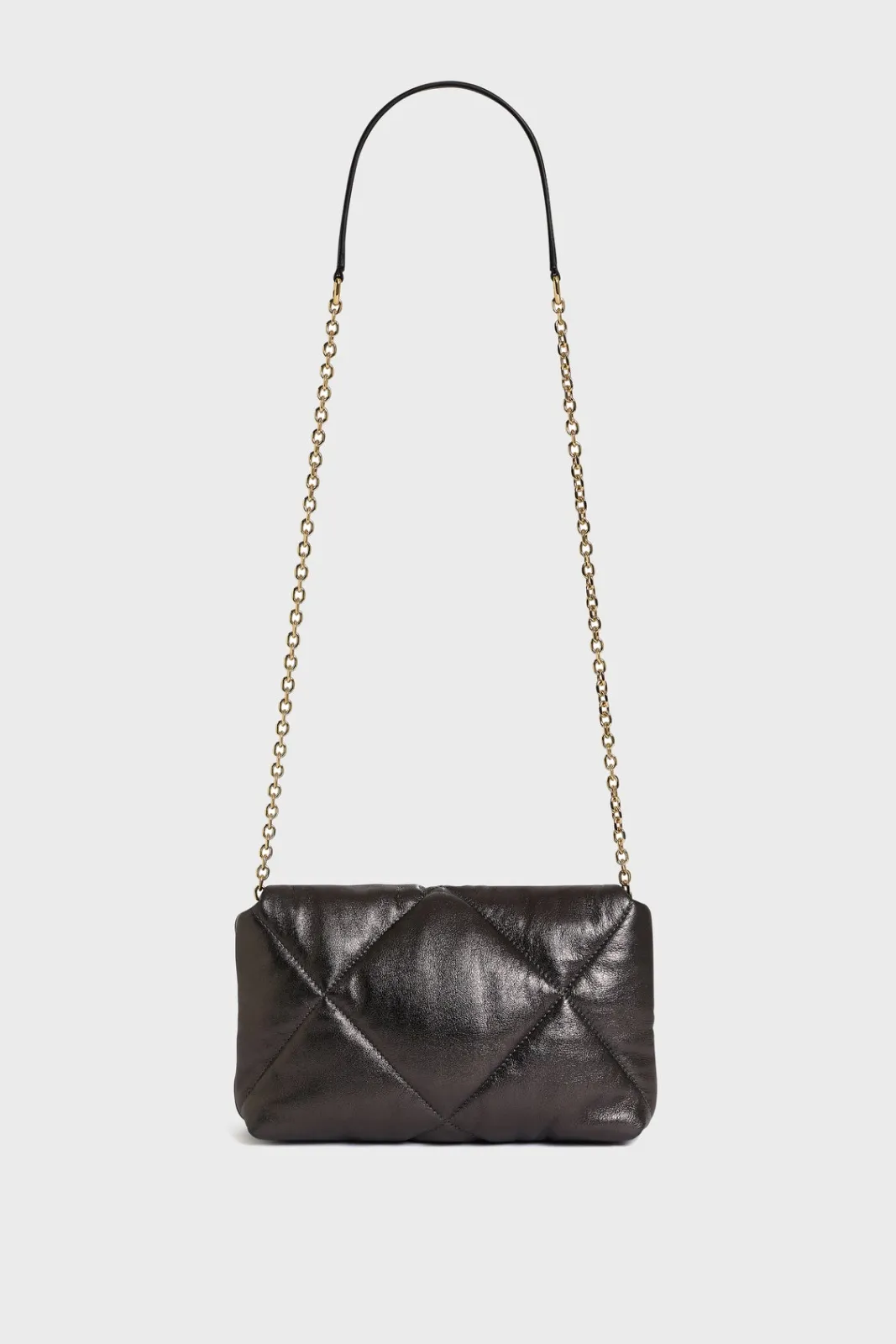 A small jewel of subtlety of the collection, the Fanny has everything of an icon. Its ideal format and adjustable shoulder strap between leather and chain offer a comfortable worn, both chic and practical. The gold Gerard Darel signature is hidden on the body of the bag. But it is in relief stitched on its quilting in metallic lambskin leather that shine its initials against the background of giant rhombus with graphic and sensual lines. A bag thought like a cloud of softness in a leather glove, a real designer piece.