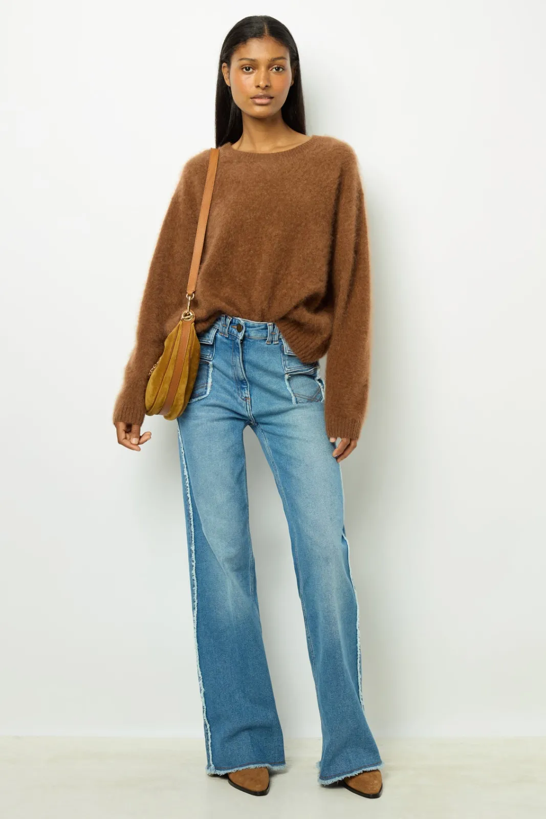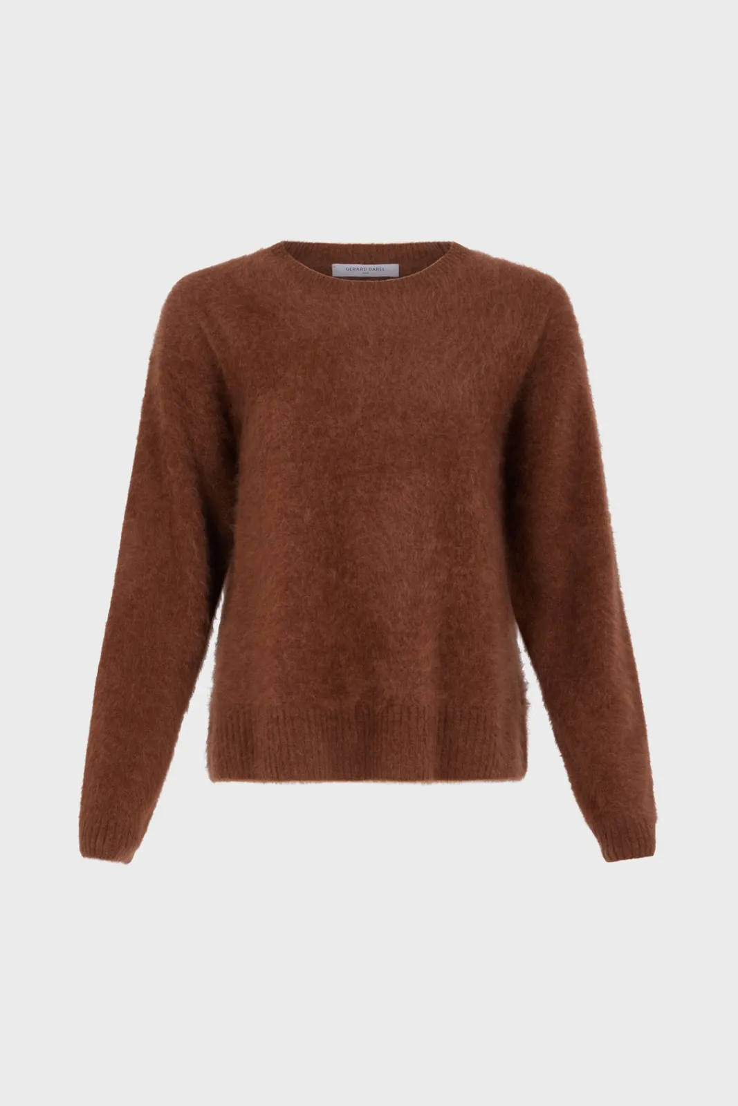 100% Brushed cashmere sweaterwith a slightly furry appearance. Shimmering camel.
