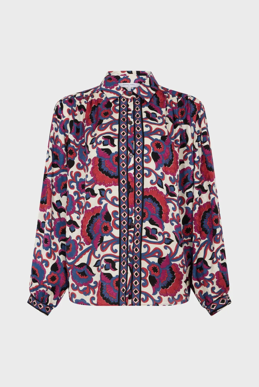 Satin feel shirt with foliage print on jacquard background. Soft fall.-Flowing straight cut-Foliage print-Shirt collar-L…