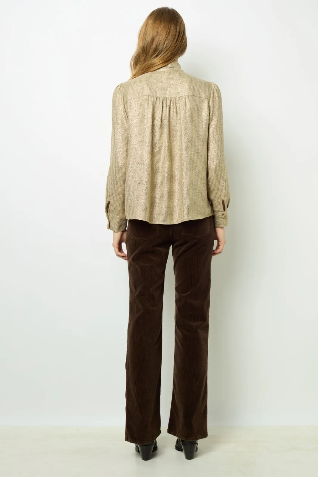 Lavaliere shirt with micro houndstooth pattern and a touch of lurex. Vintage-chic feel.