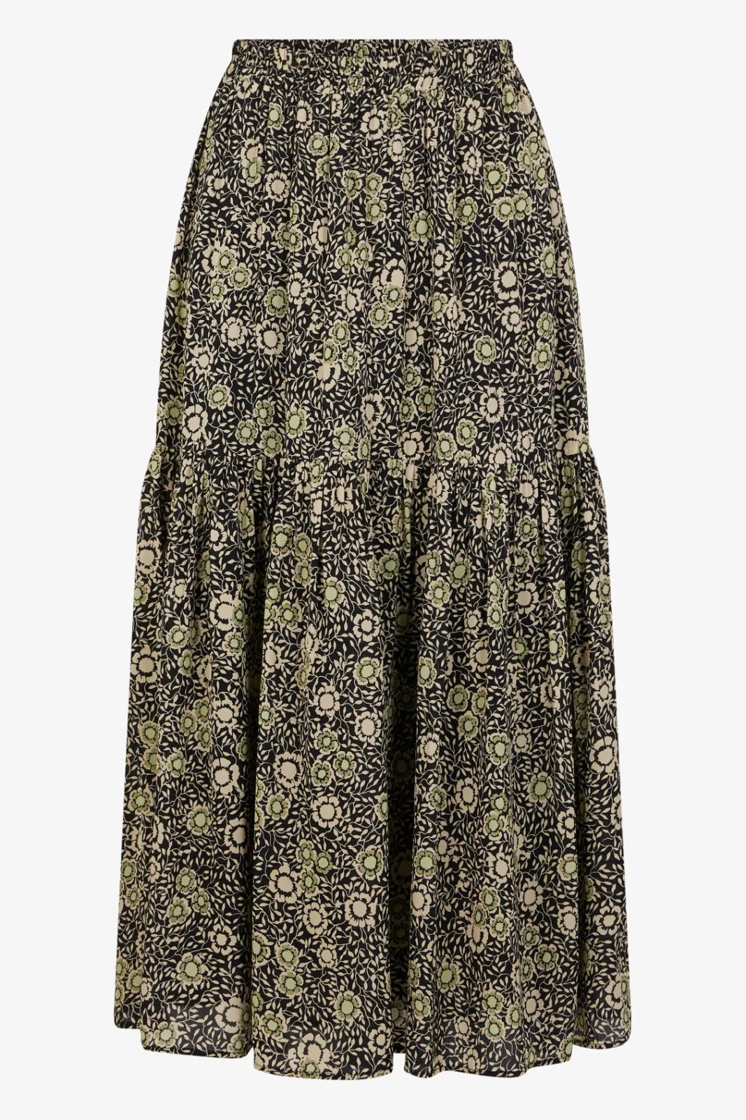 Midi floral skirt with a soft silky touch.-A-line cut-Floral pattern-Midi length-Elasticated waist-Gathered tiered skirt…