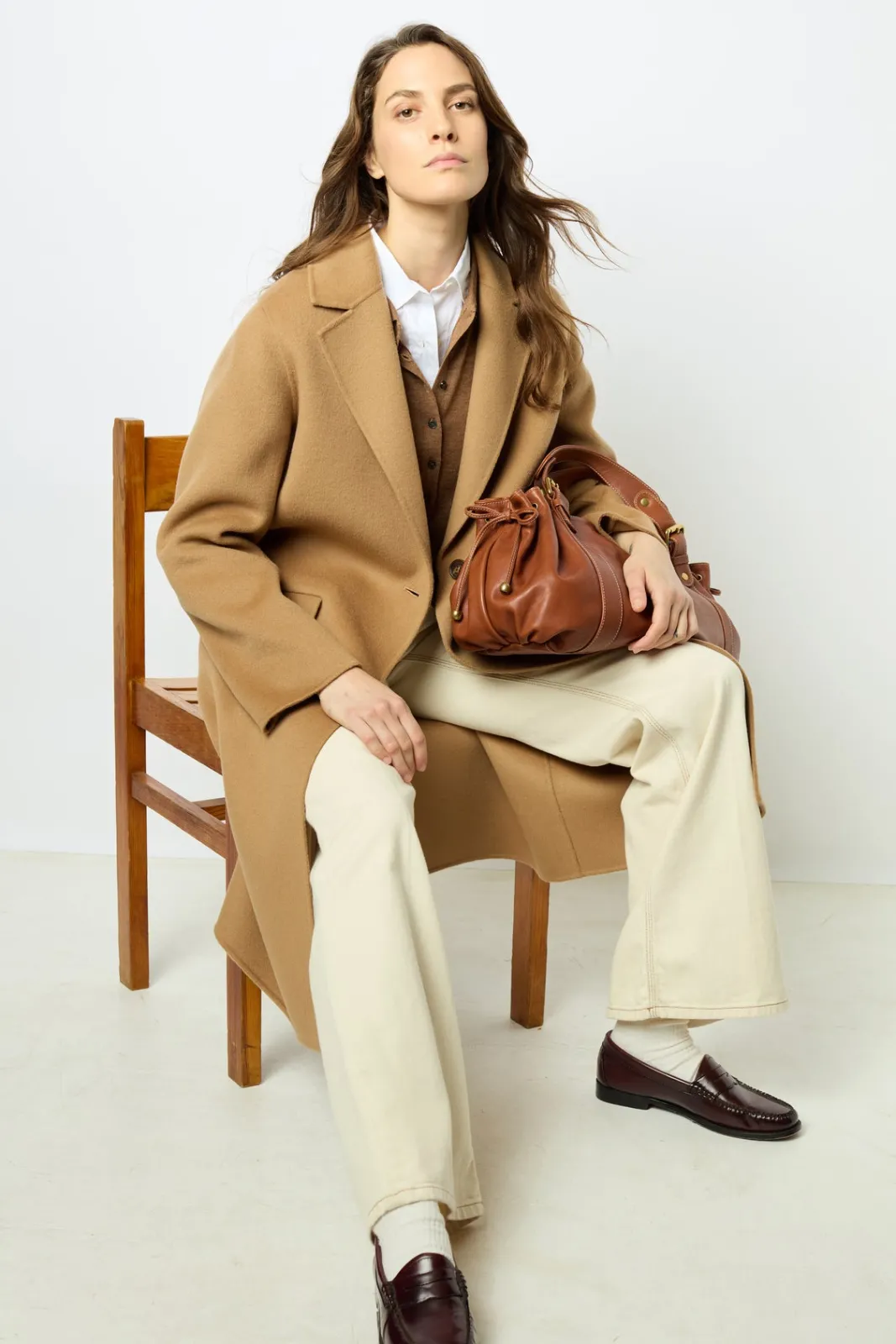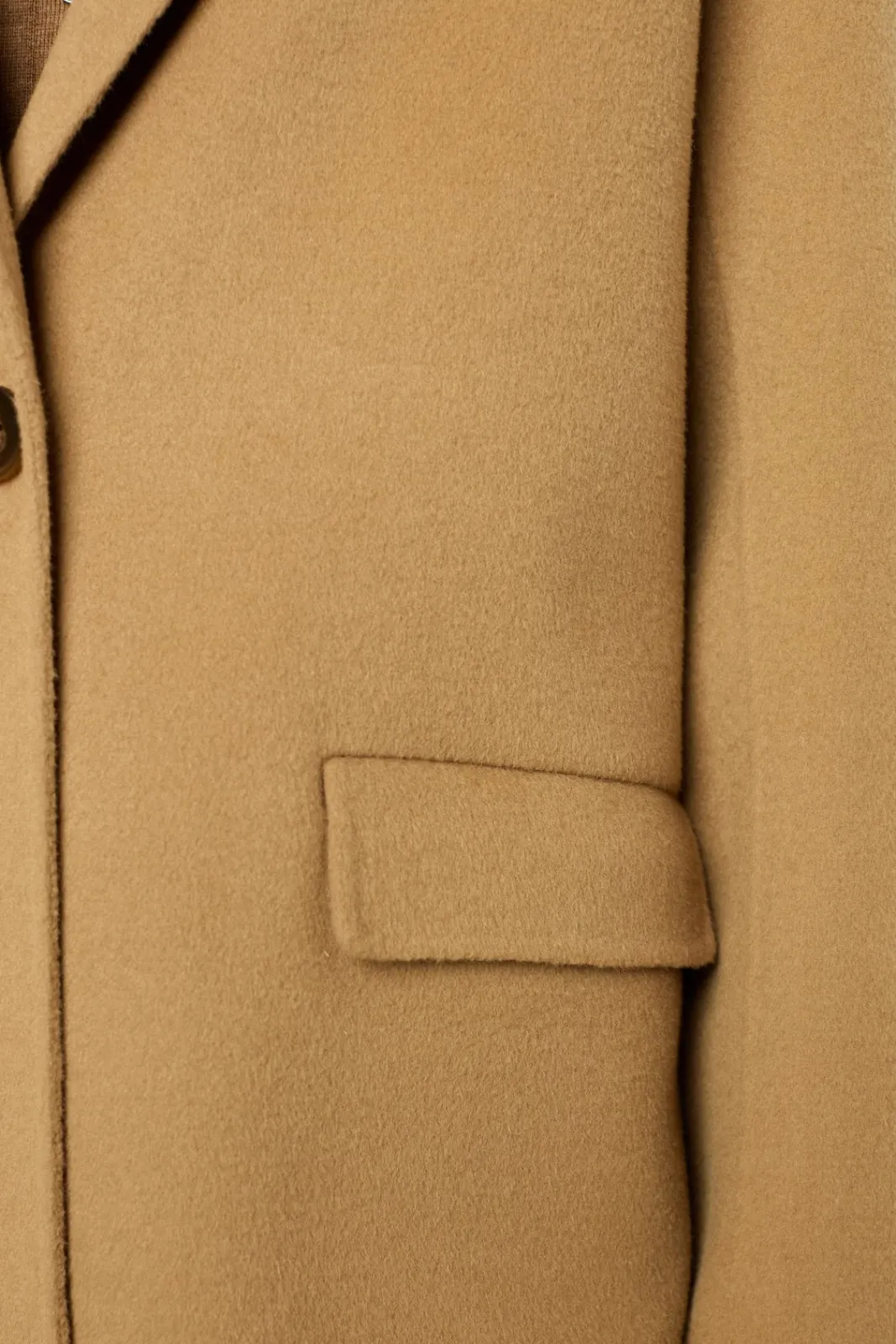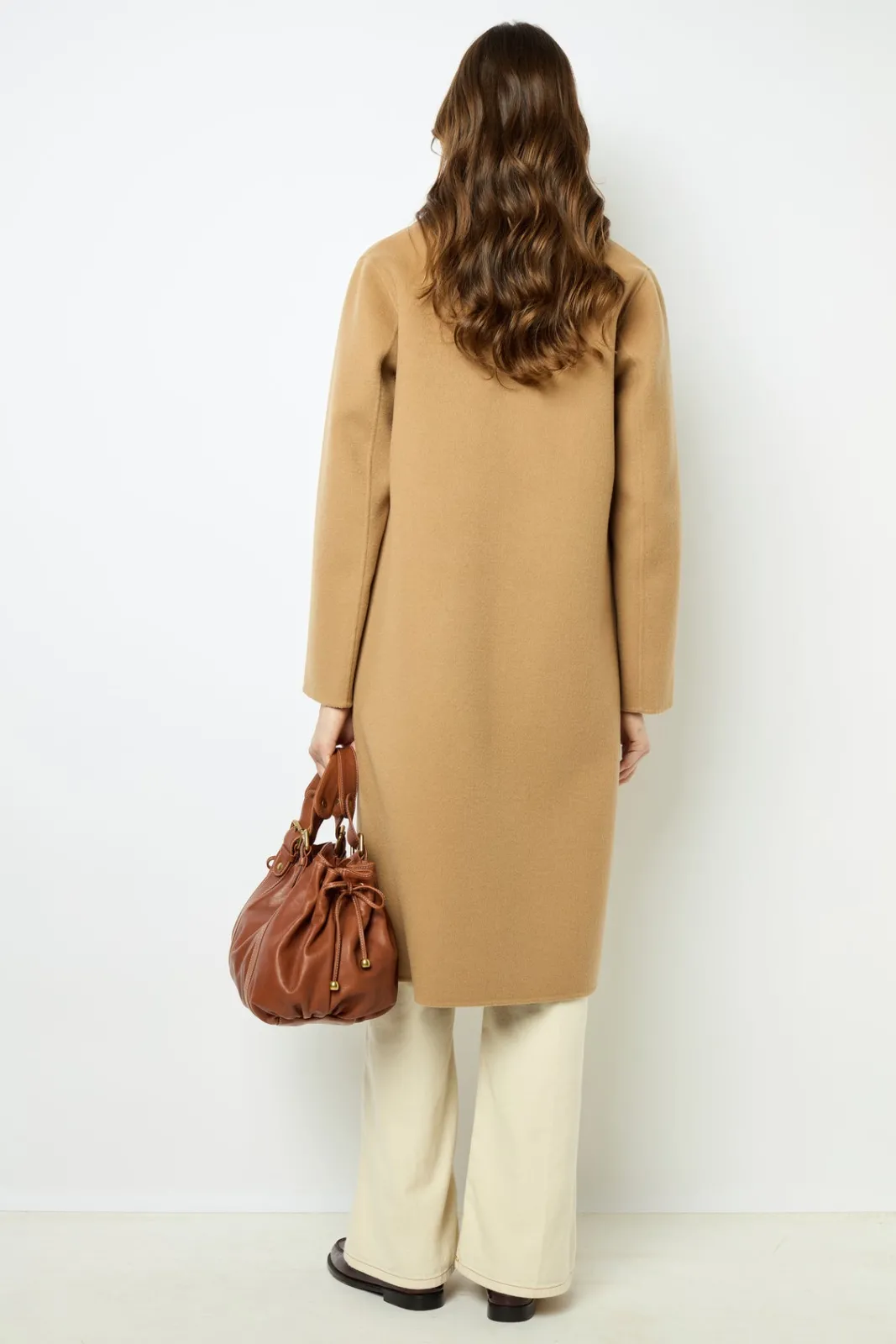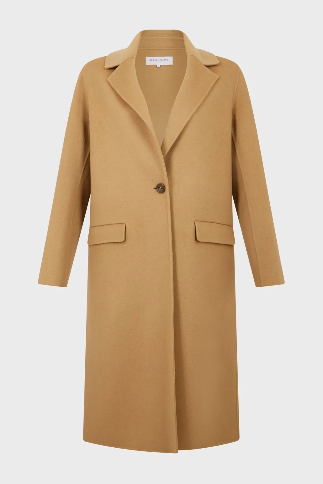 100% double-face wool straight cut coat, as soft on the inside as on the outside. Camel color for timeless chic wear.