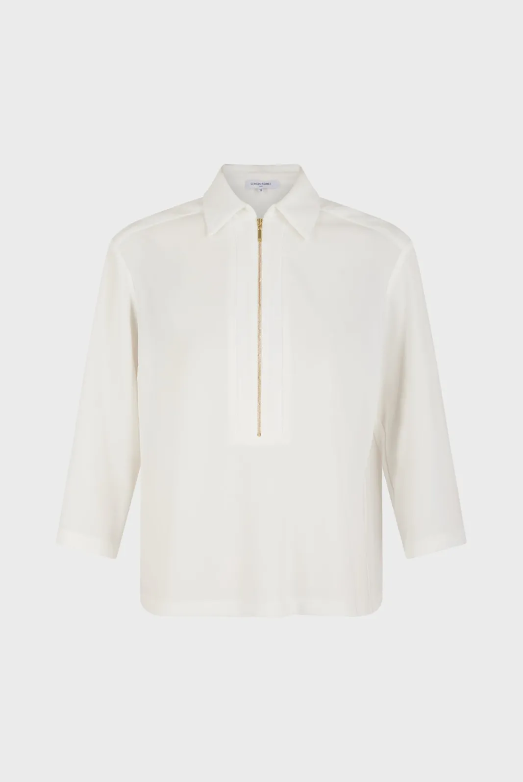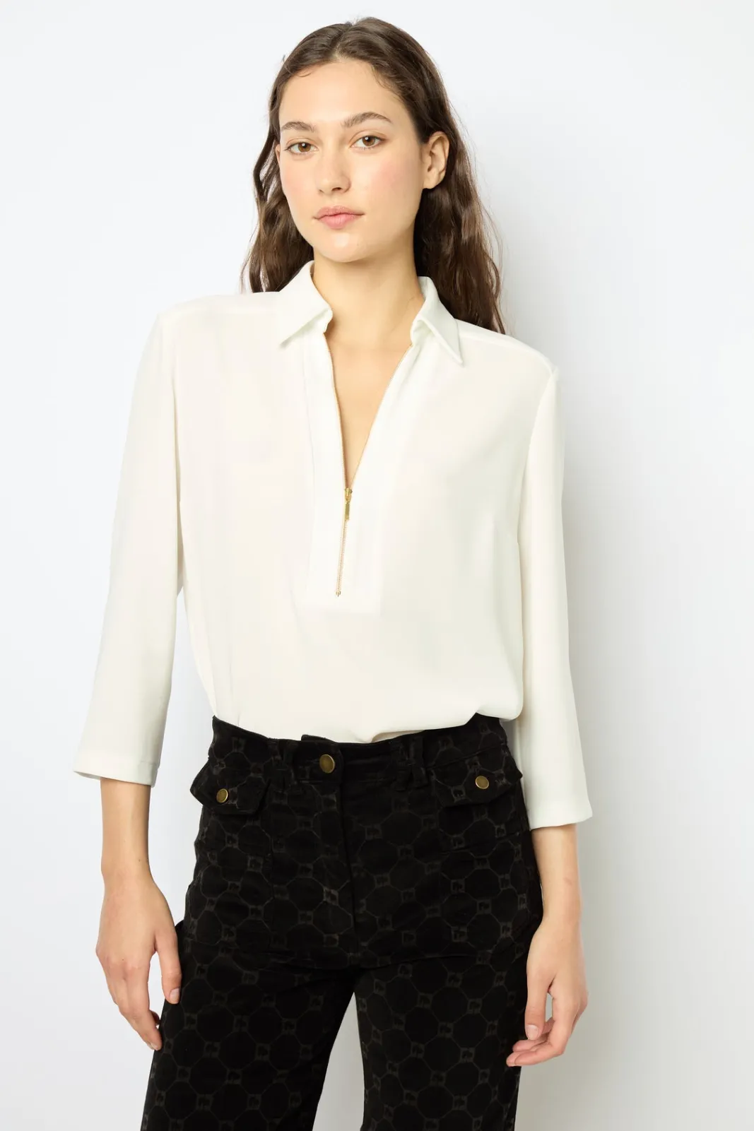 Soft crepe blouse with gold zipper at the neckline. Chic, classic elegance.-Straight and fluid cut-Plain crepe-Shirt col…