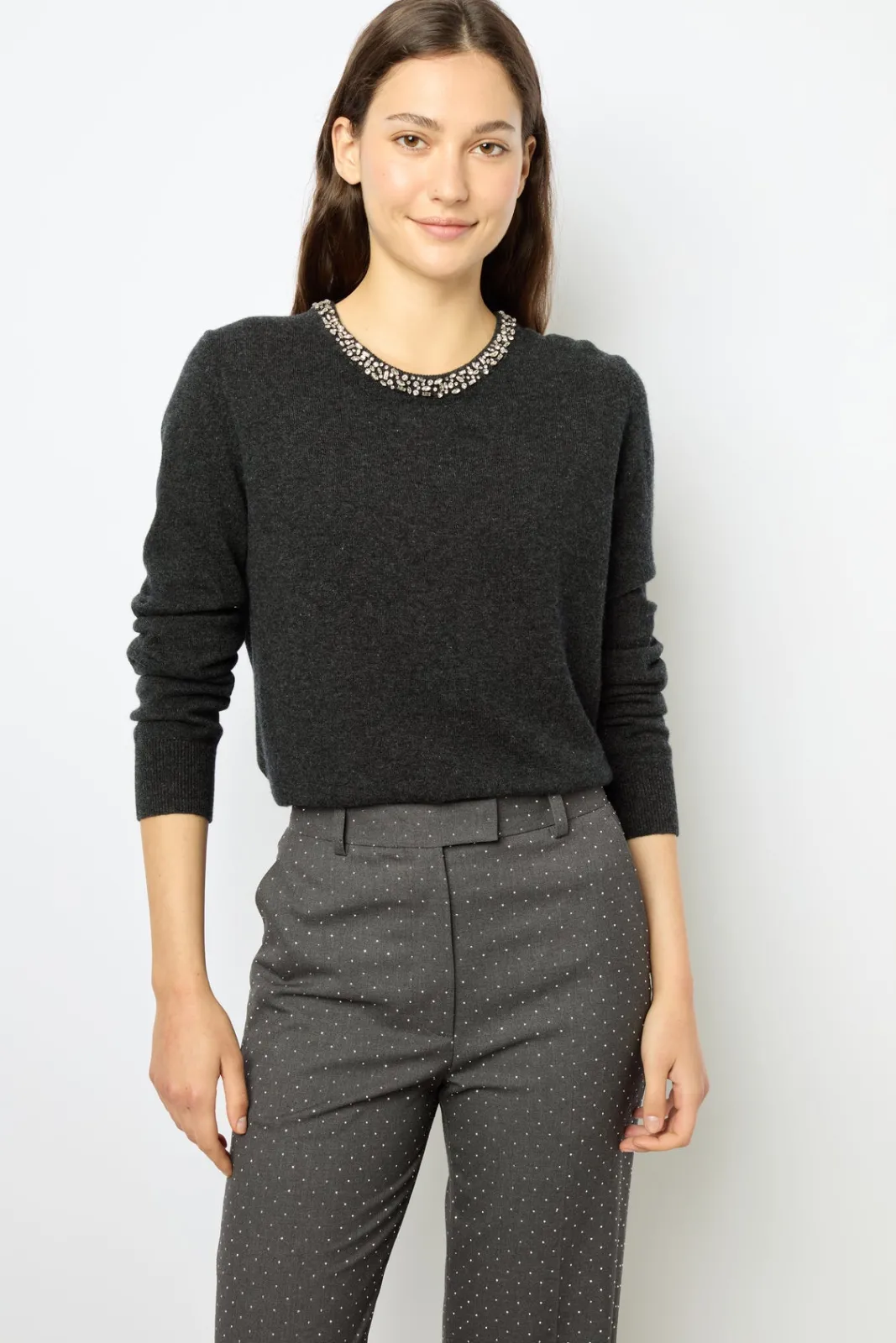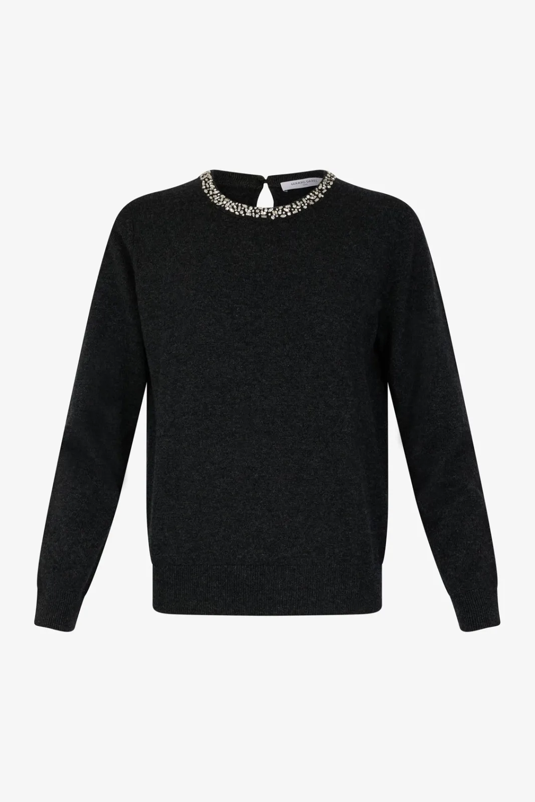 100% fine wool sweater. Neckline decorated with rhinestones.