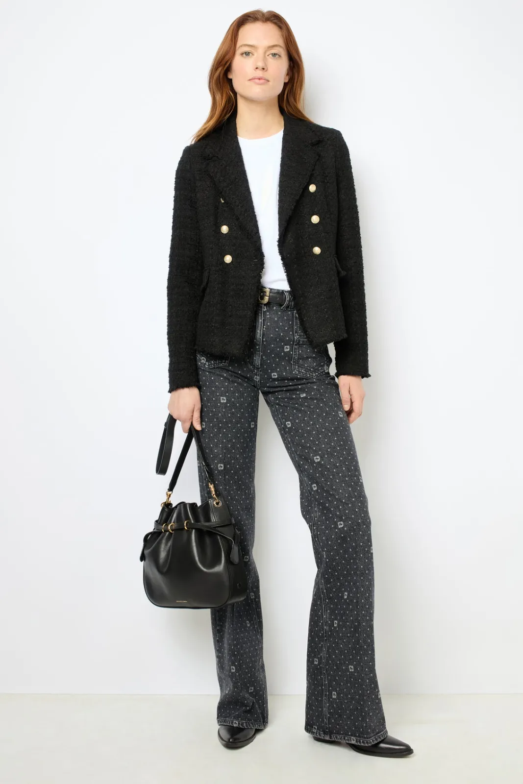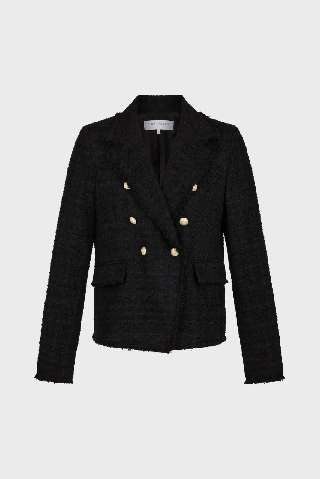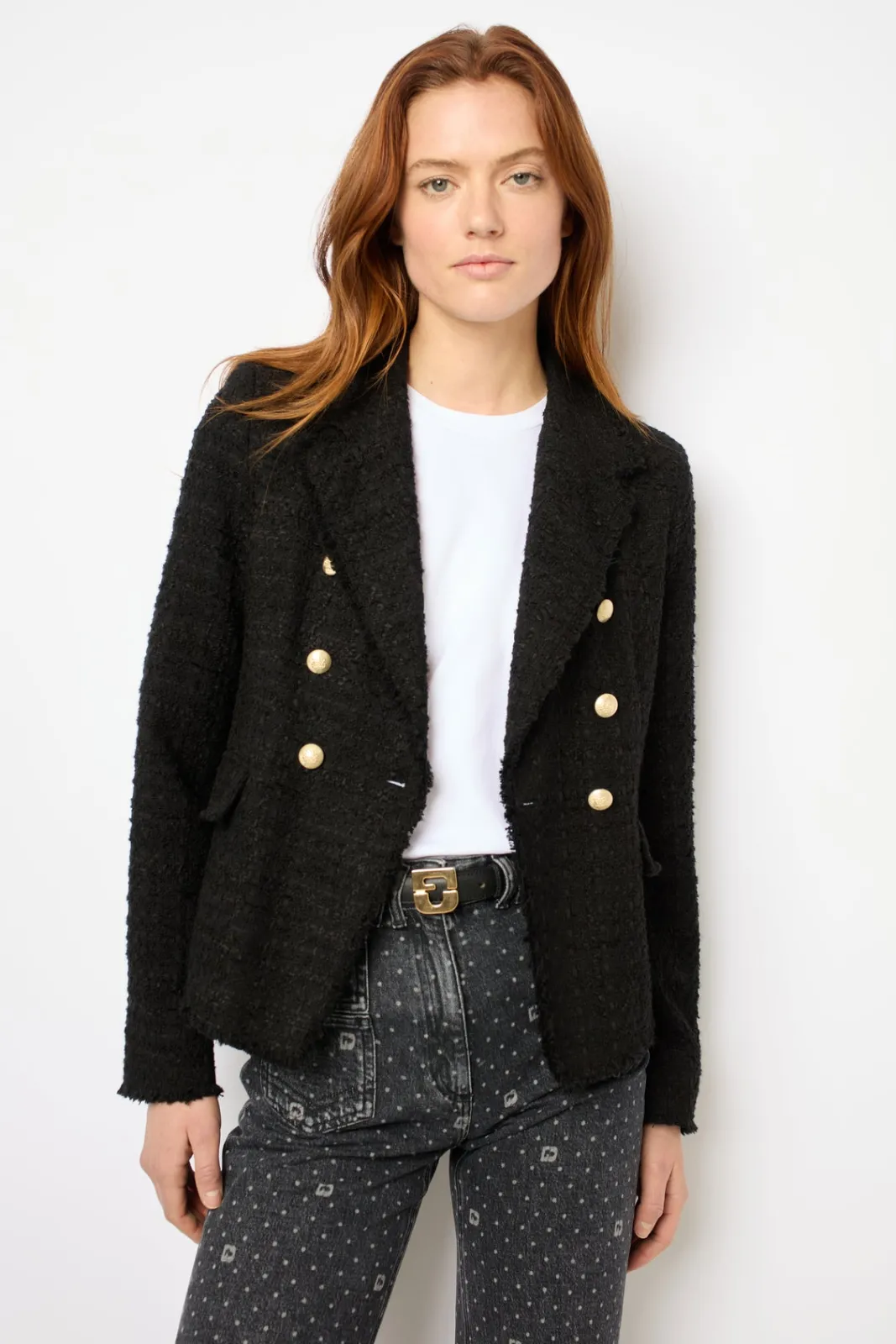 Double-breasted black tweed blazer with engraved buttons. Chic, classic elegance.