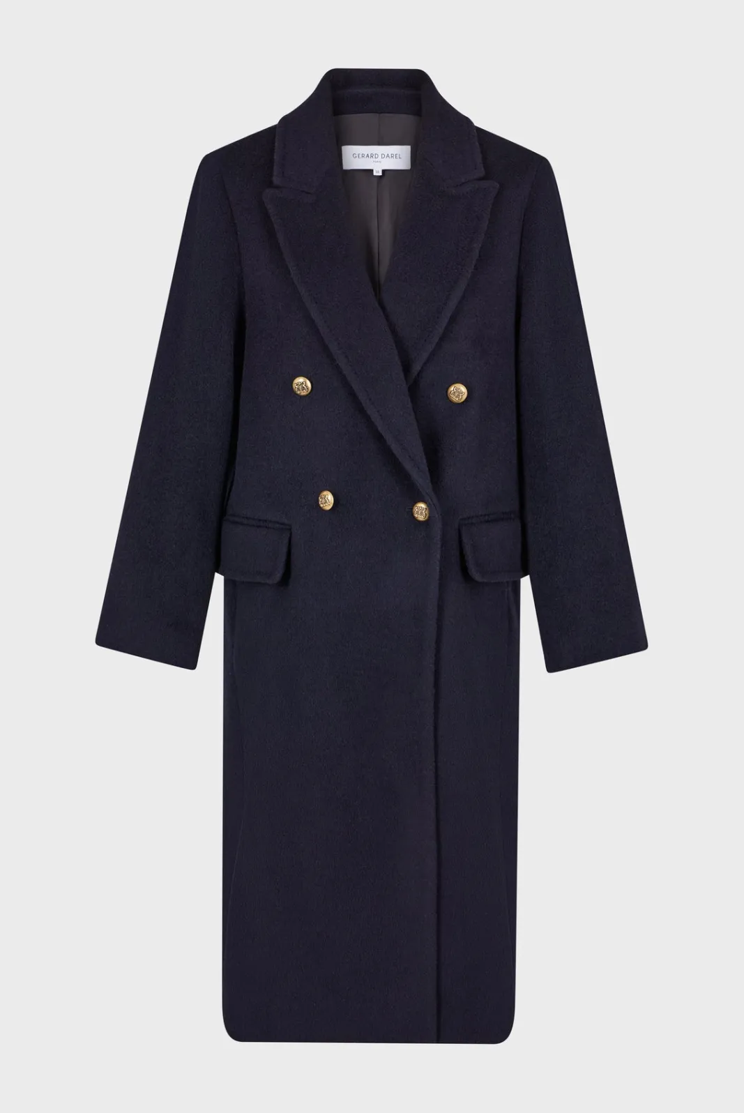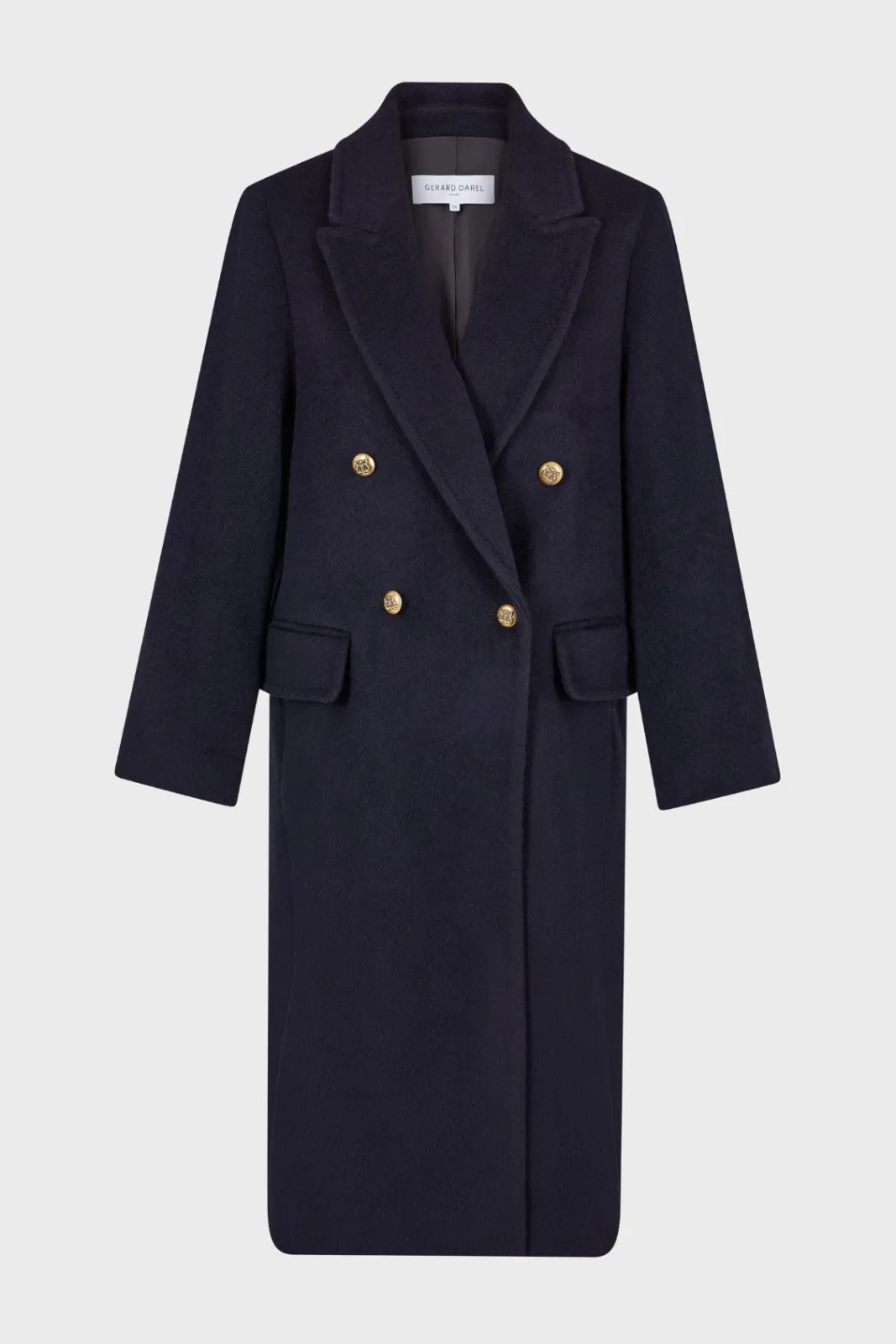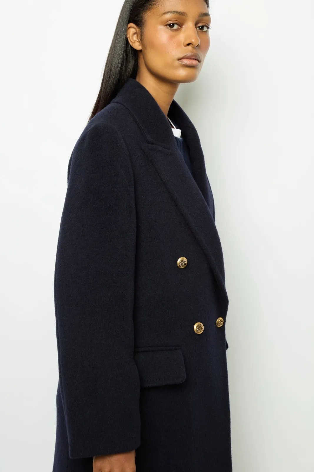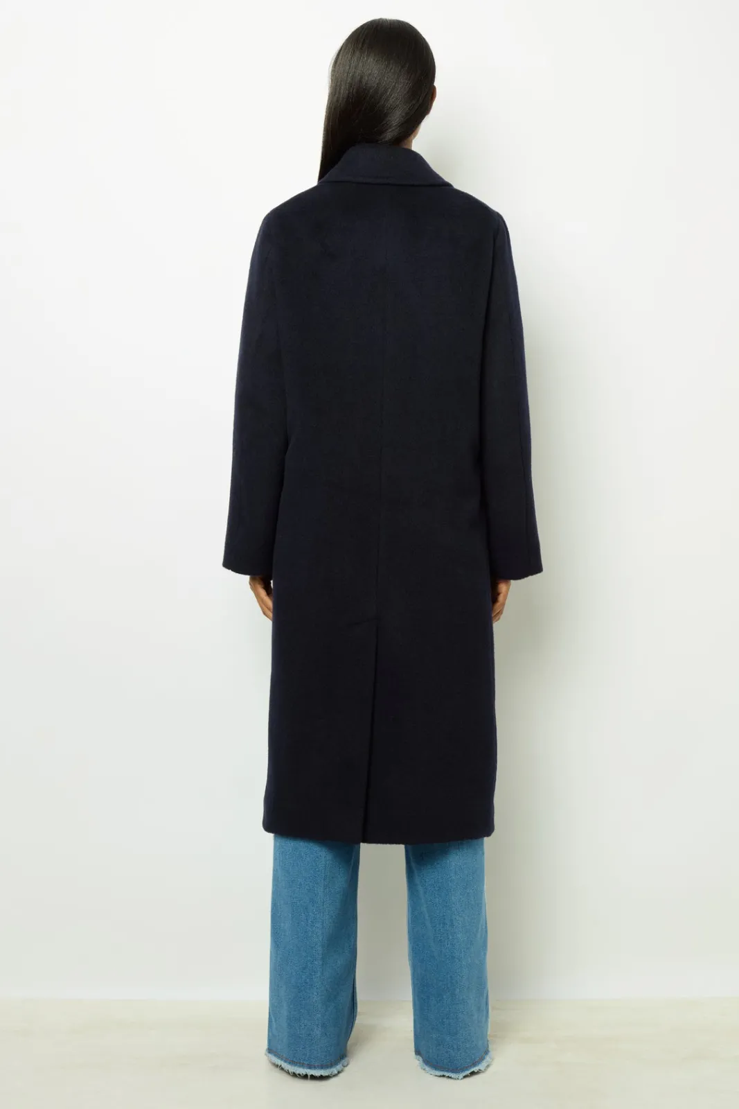 Full-length coat in a warm virgin wool and alpaca blend. Masculine feminine double-breasted loose fit.