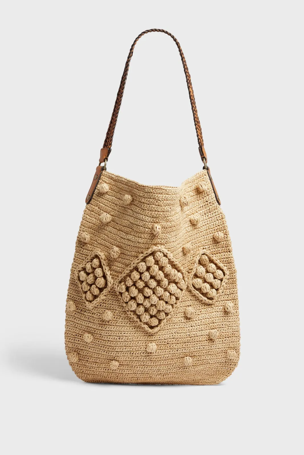 The JOSIE is a soft totebag in authentic hand-crocheted natural raffia.Geometric graphics, worked in relief.