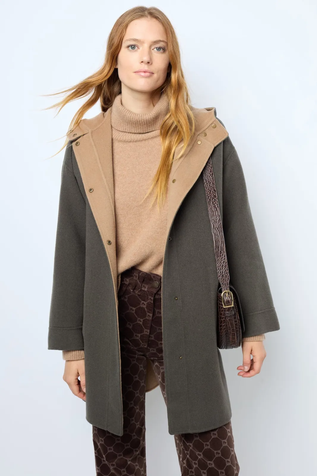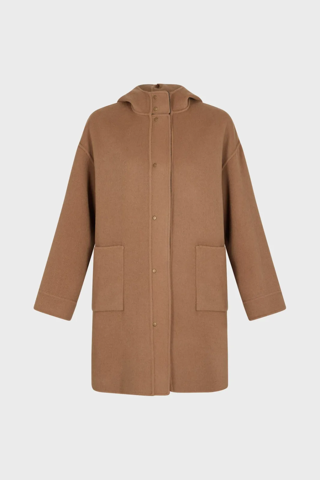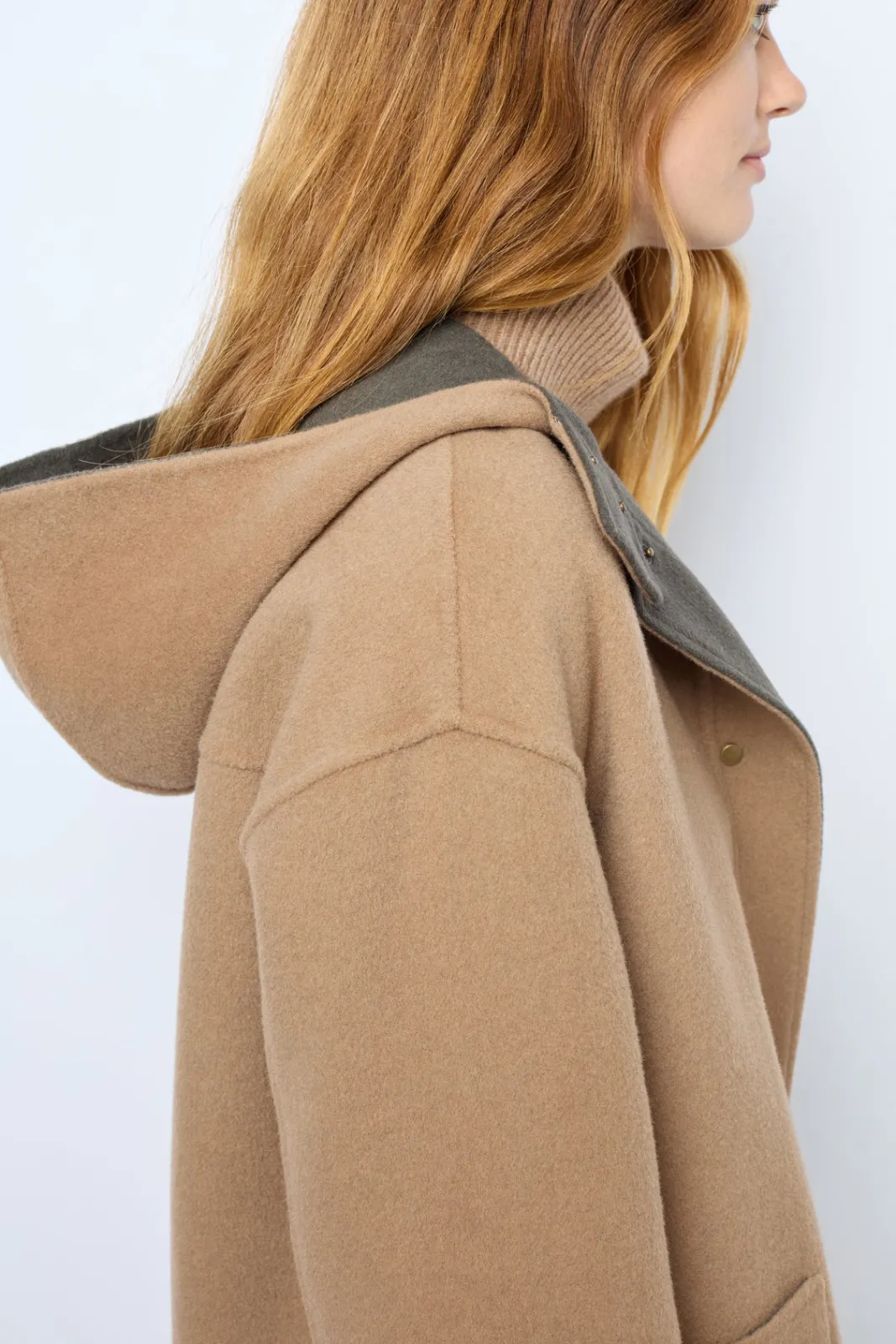 Double-face fine wool reversible hooded jacket, as soft on the inside as on the outside. Ideal for mid-season. 100% wool.