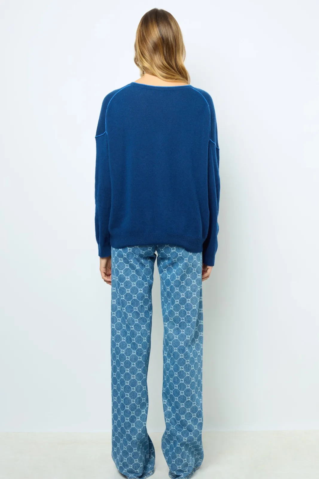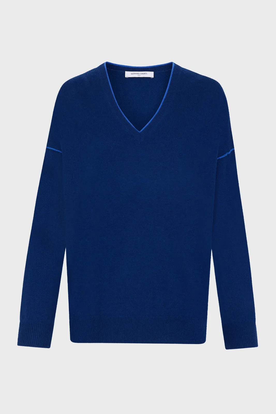 Plain 100% cashmere V-neck sweater with colored seams for a fancy effect.-Loose fit-Plain cashmere-Dropped sleeves-V-nec…