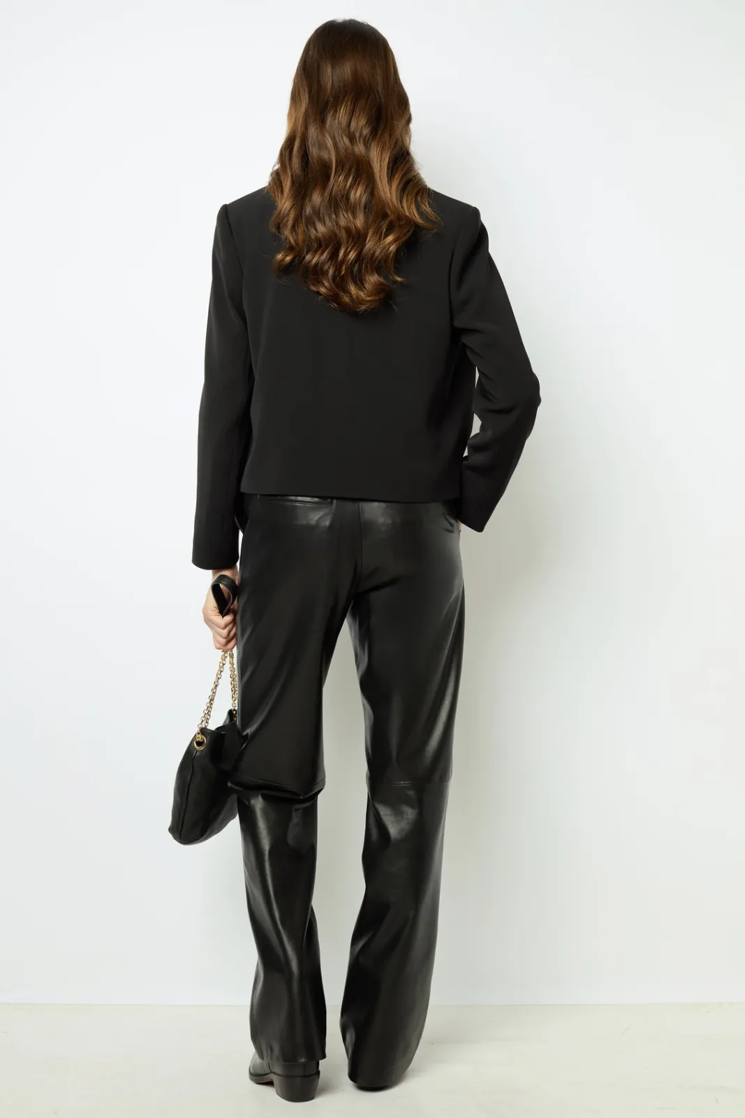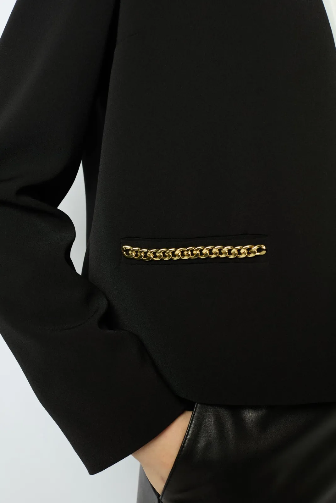 Short jacket in black microfiber with gold chains at pockets.