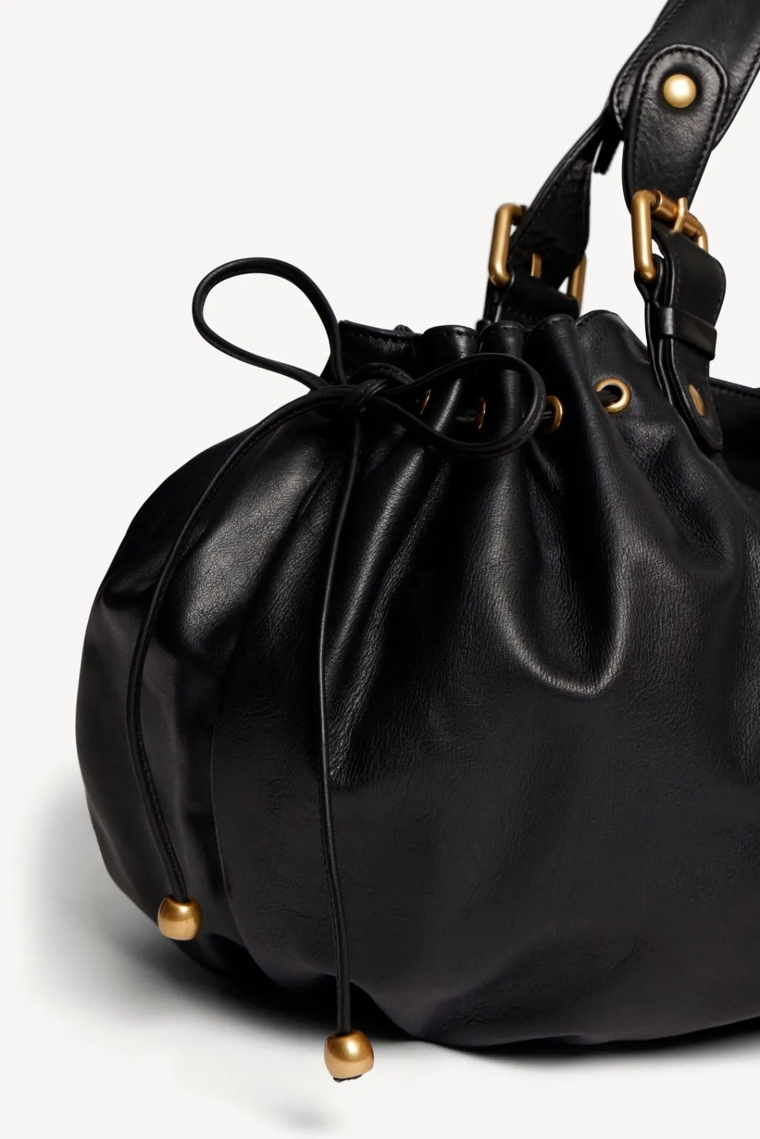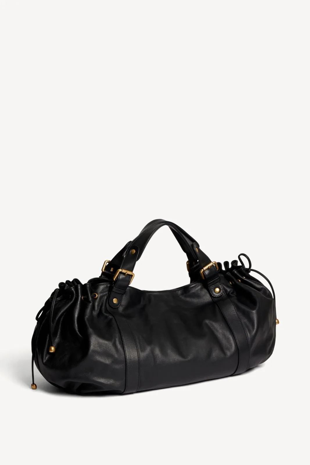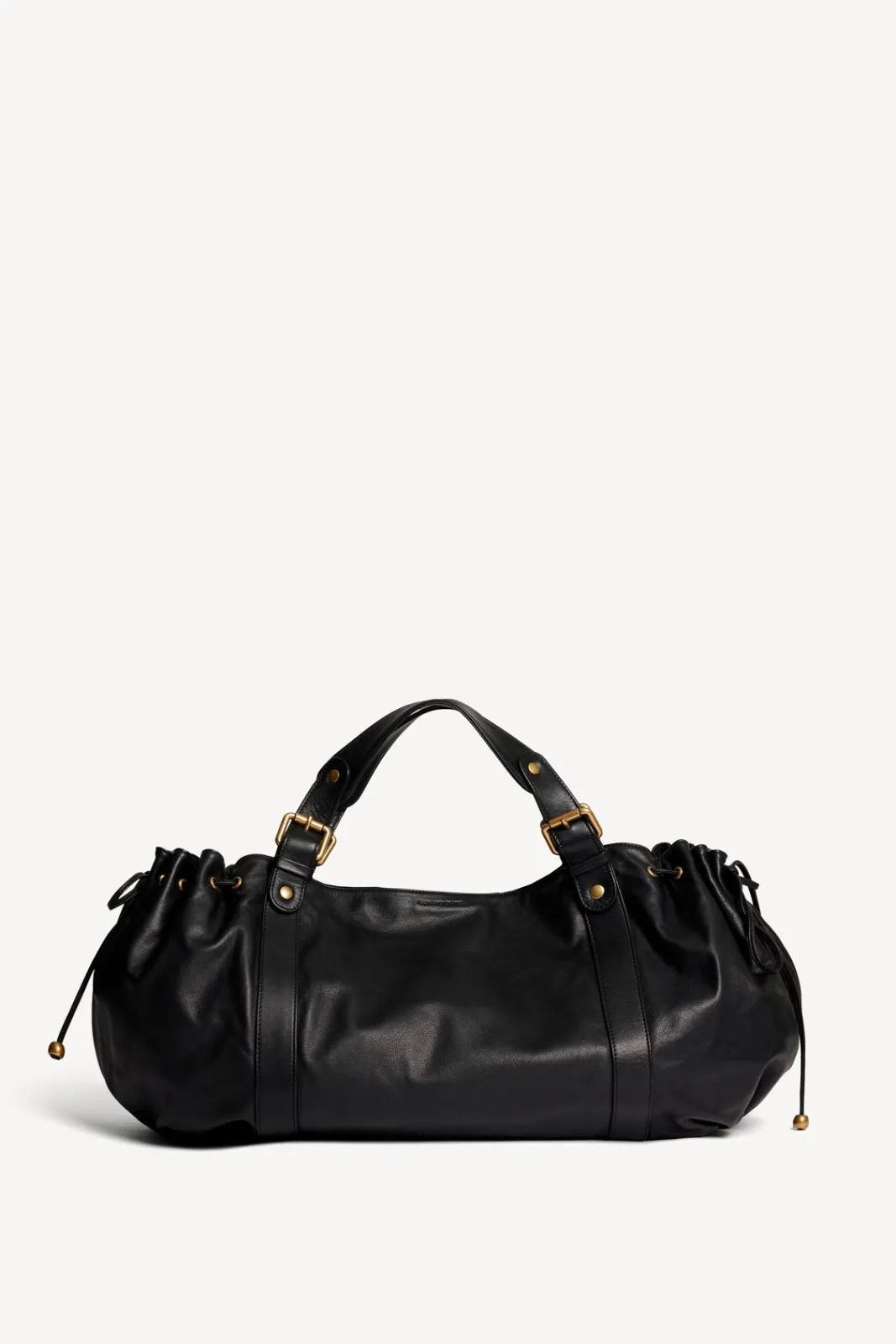 - – Bag gathered on the sides by two leather links, wrapped in body bands